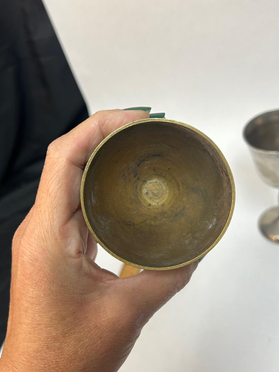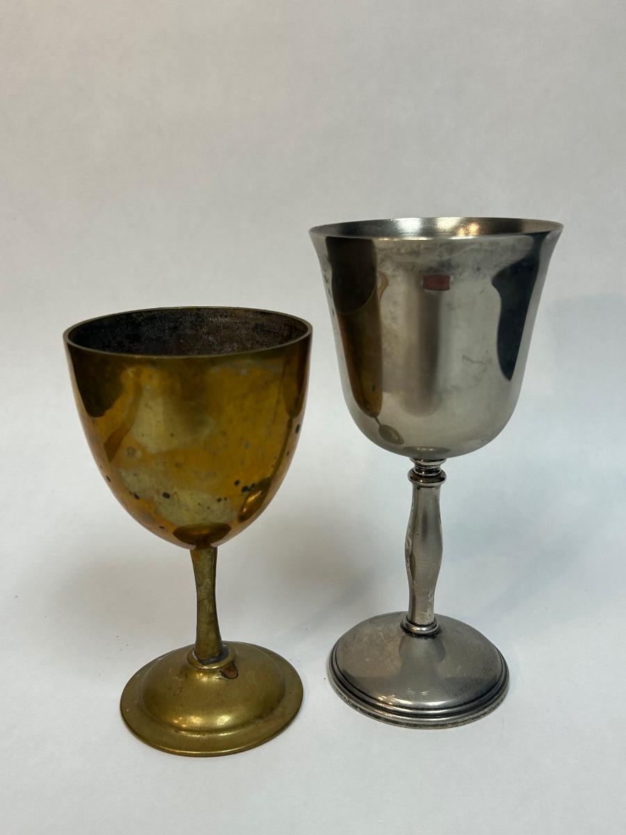 Pair of Vintage Metal Chalice Goblets Stemware Drink Glasses Brass Silver Plate. In good vintage condition. 5" and 6" size.