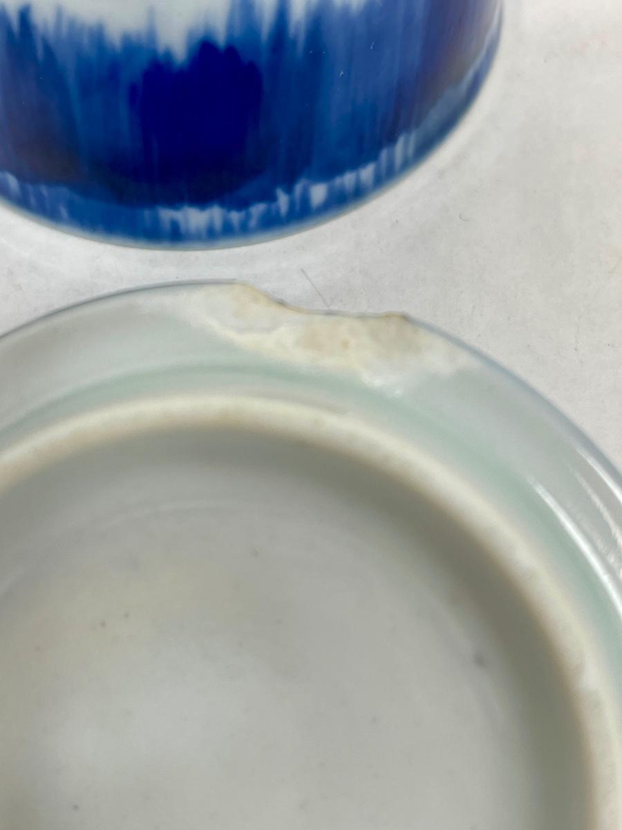 In fair condition but there is some crazing and a chip to the underside of a lid.