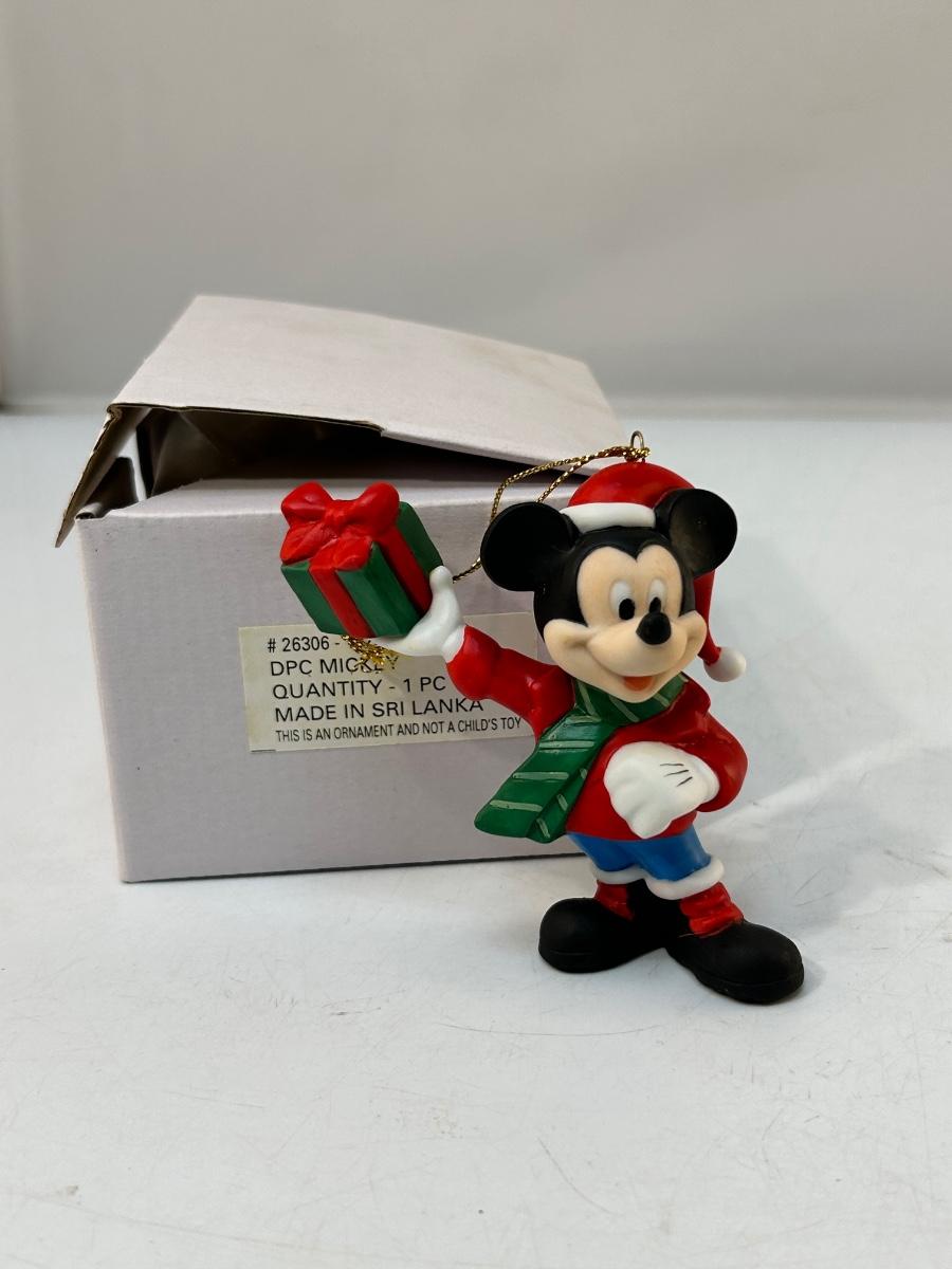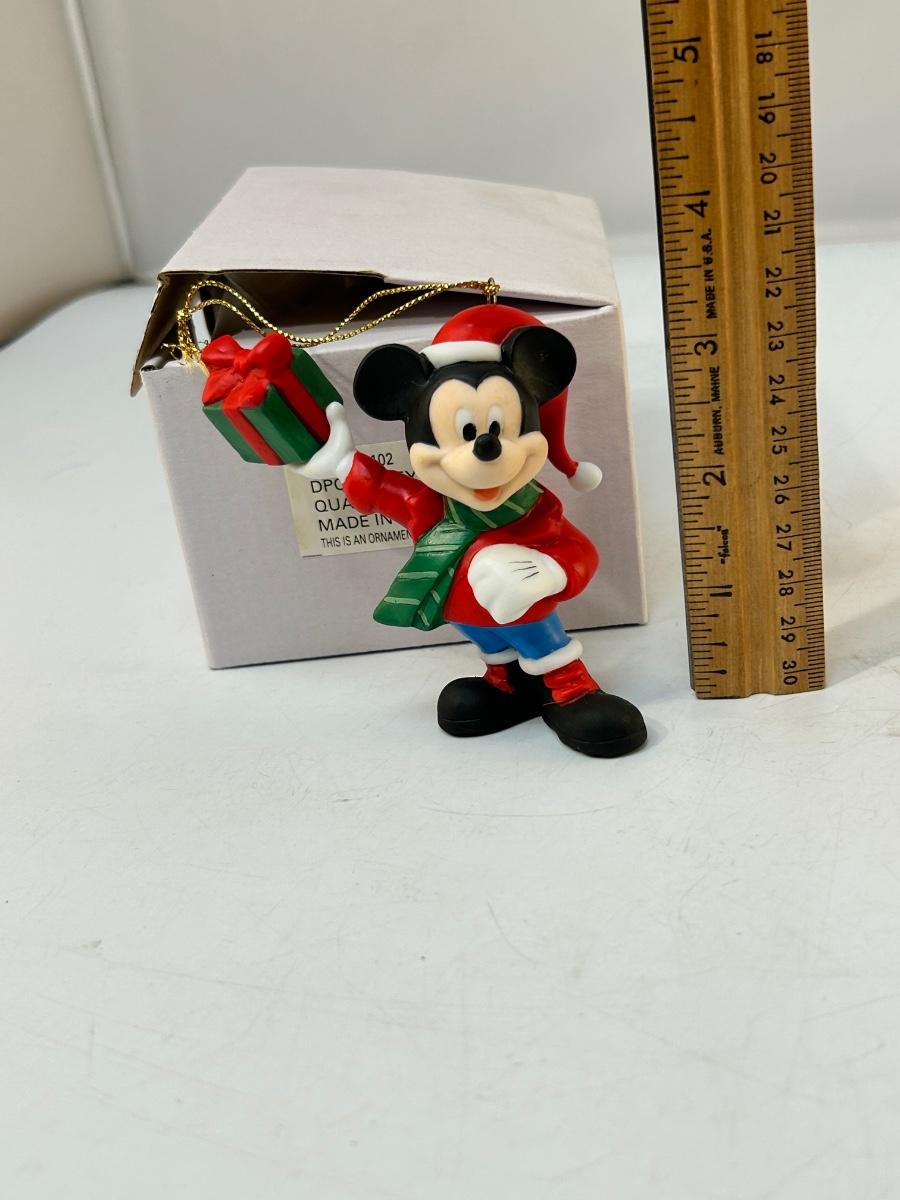 Walt Disney Porcelain Mickey Mouse with Gift Hanging Christmas Tree Ornament. In good condition. Under 4" size. Comes in original box.