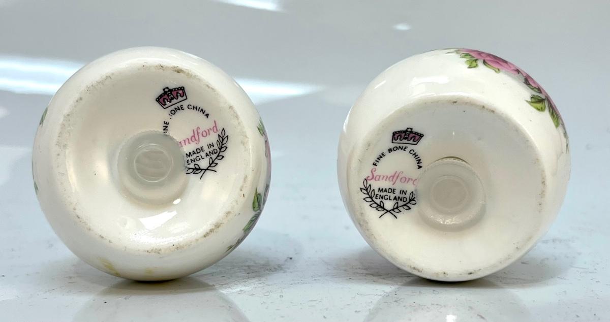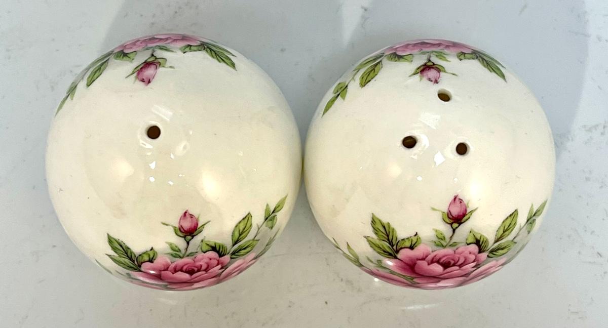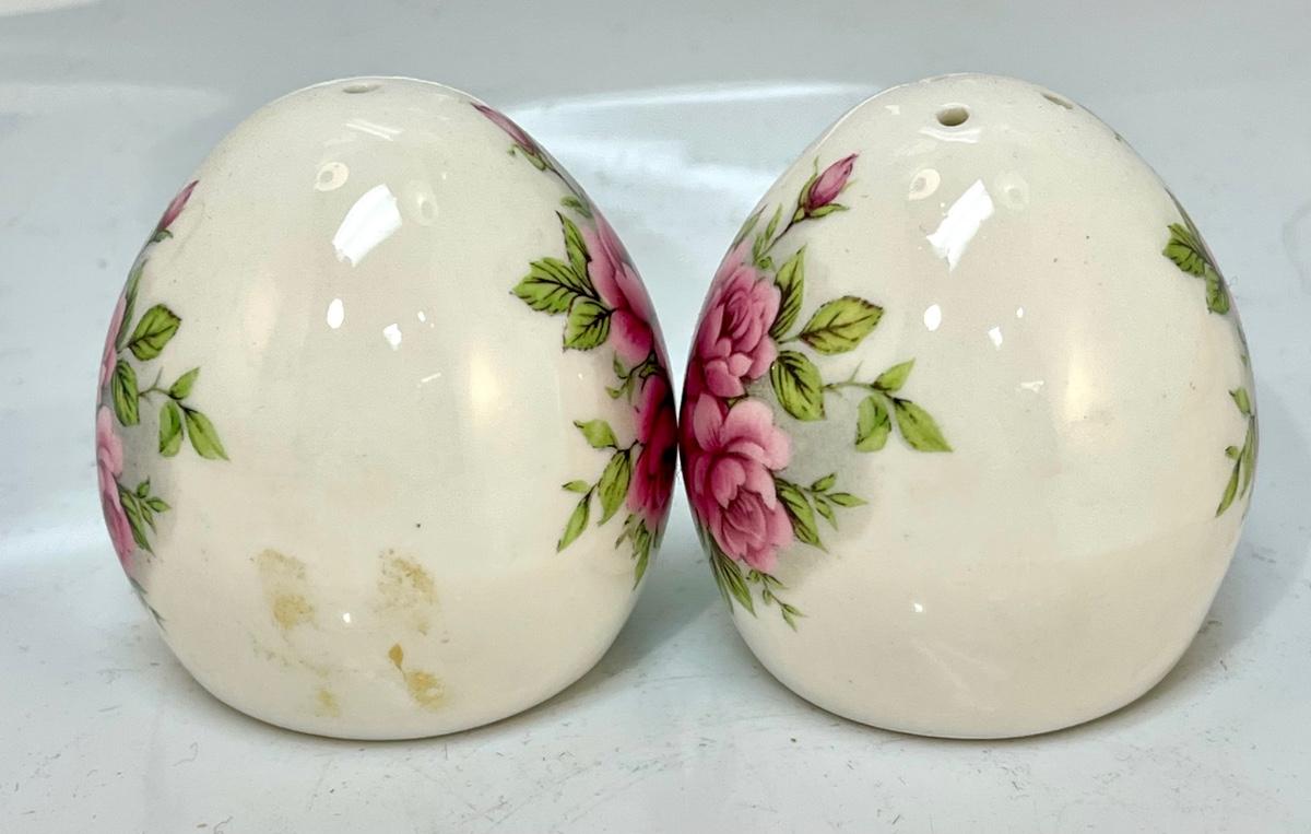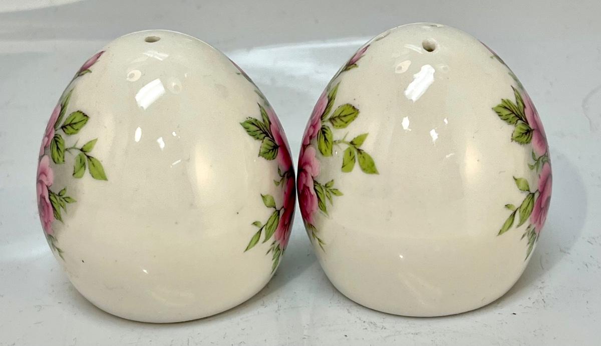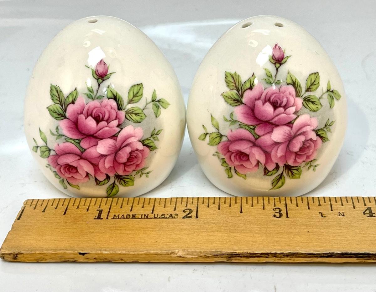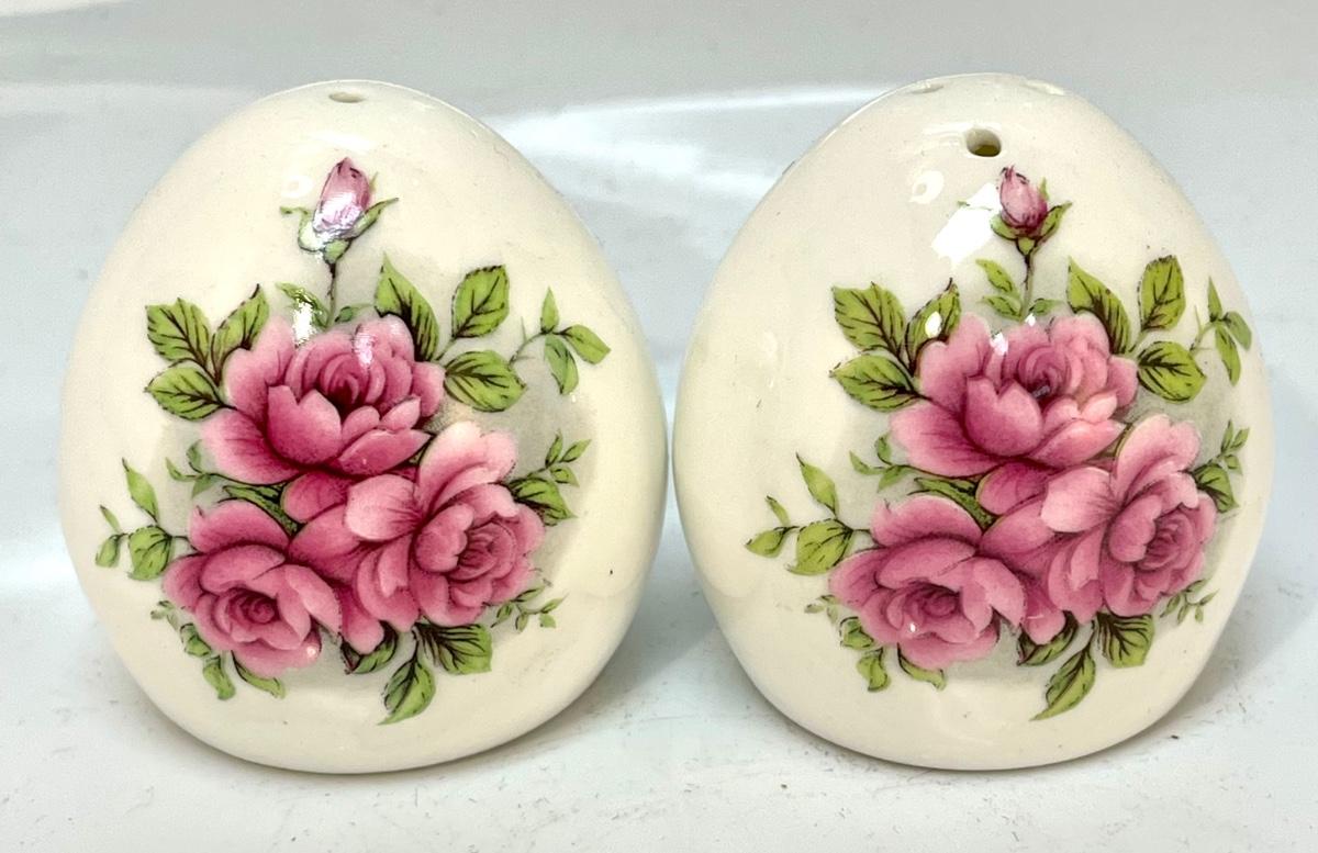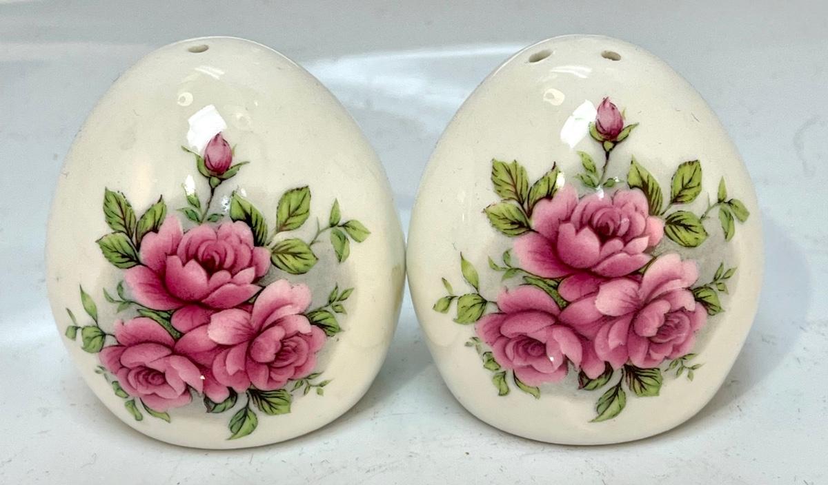 Vintage Sanford Bone China Pink Rose Salt & Pepper Shaker Set. In good vintage condition. Both have their stoppers in the bottom. Flat bottom egg shape.