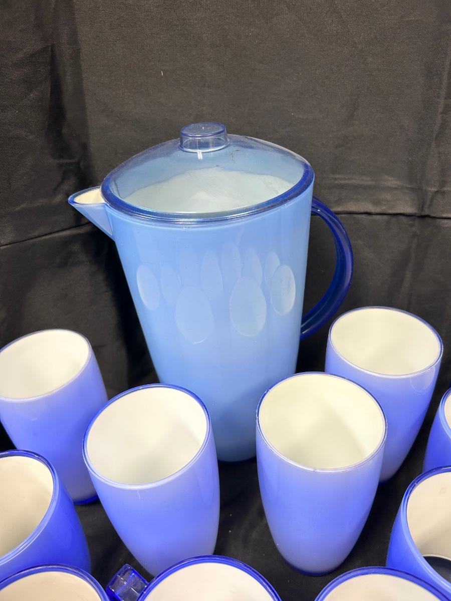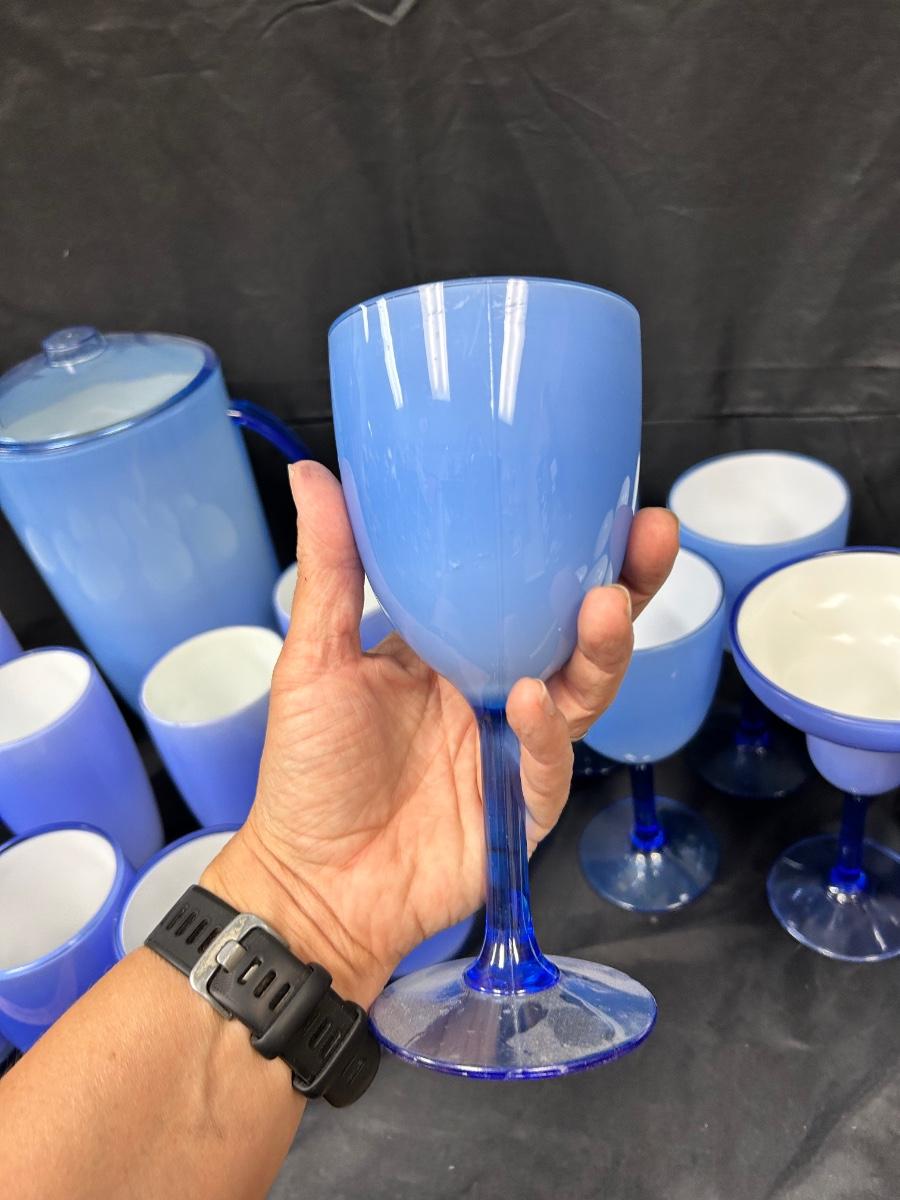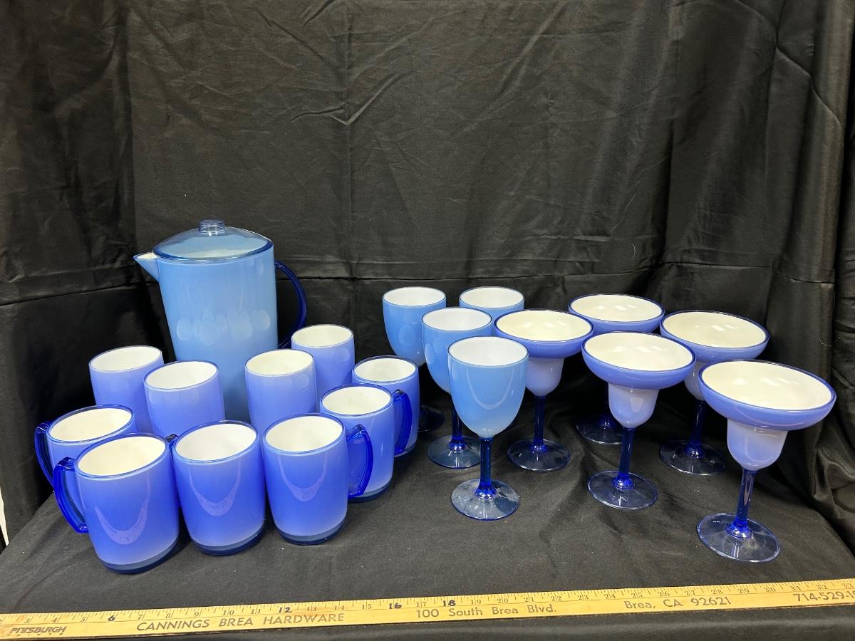 Large Mixed Lot of Blue and White Plastic Drinkware Barware Drink Glasses and Pitcher