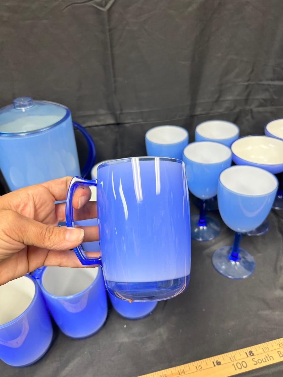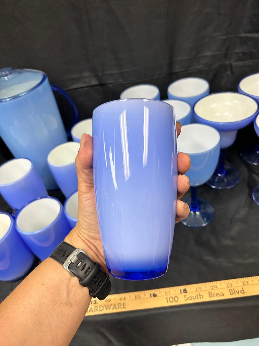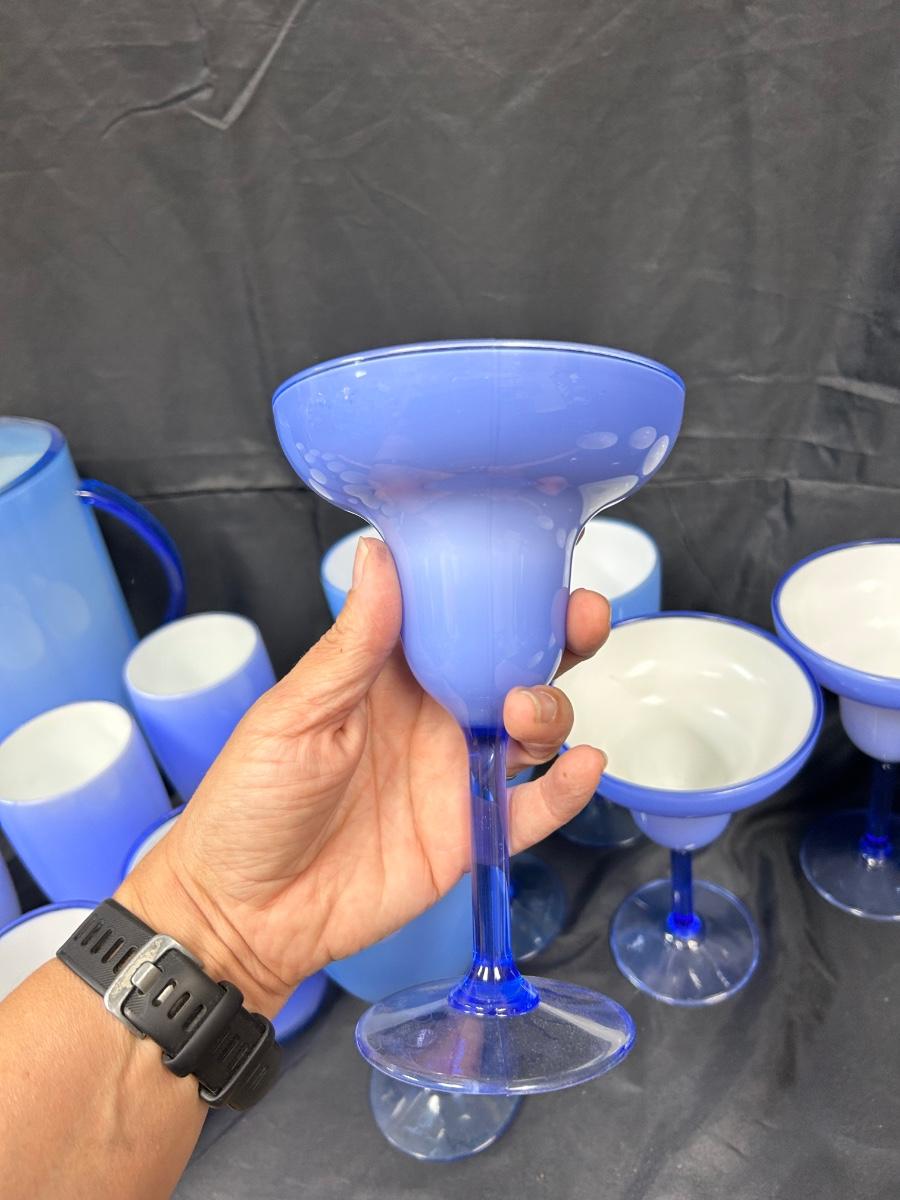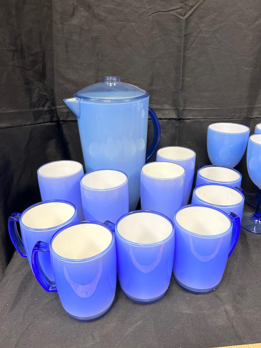 Large Mixed Lot of Blue and White Plastic Drinkware Barware Drink Glasses and Pitcher