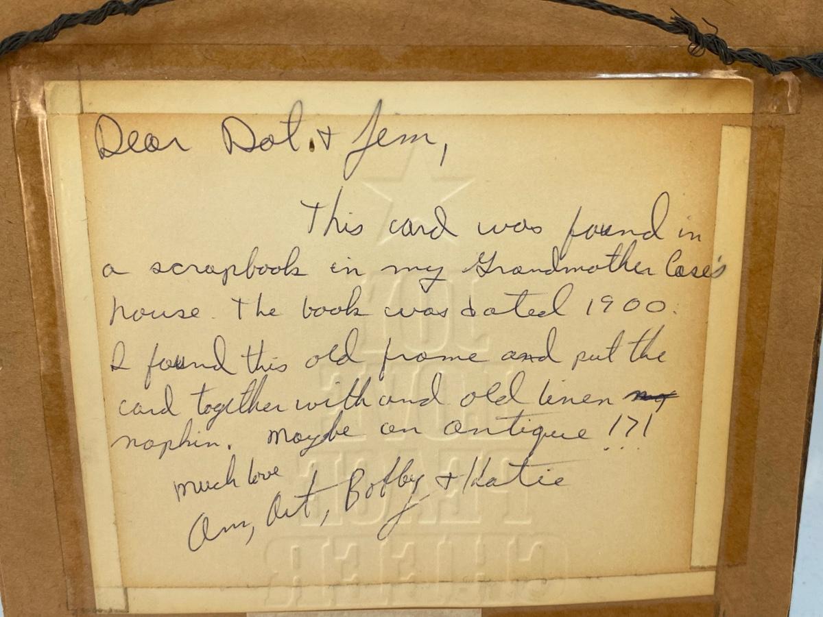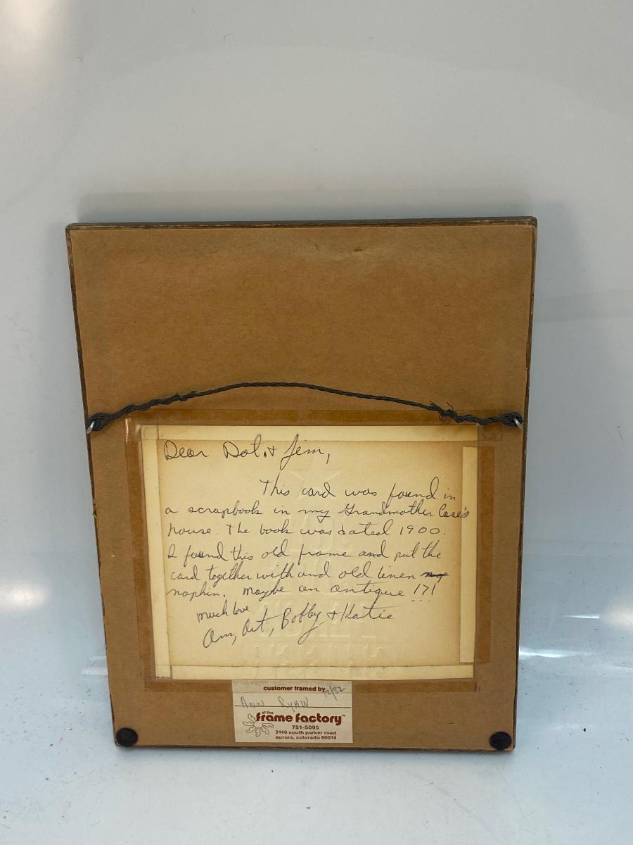 Framed Vintage Antique Card on Linen with Note Attached. Looks like a Valentines card or a romantic gesture card on white linen. Note on back has origin and date.