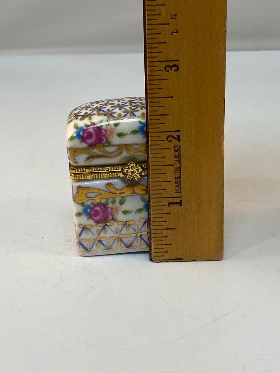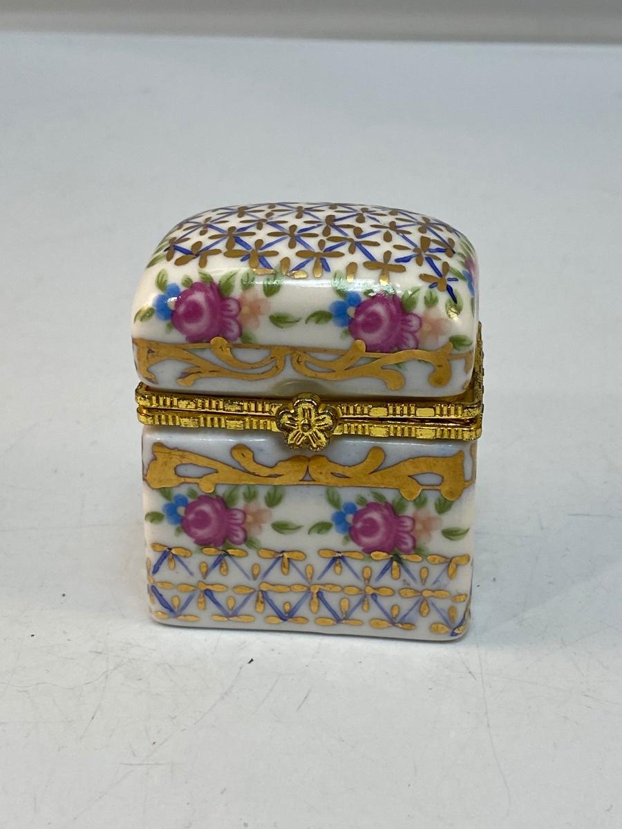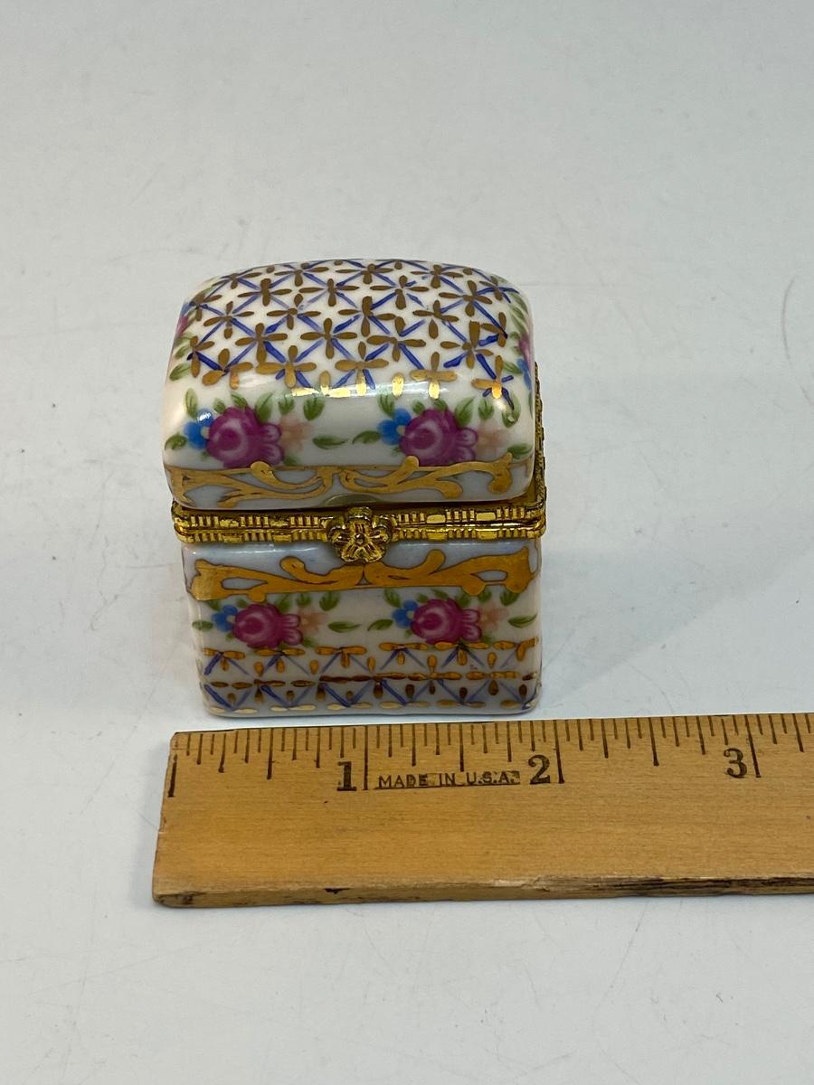 Small Vintage Floral Patterned Porcelain Trinket Box with Hinged Lid. In good condition. Pink and blue floral pattern with tons of gold accents. No maker name. About 2" size.