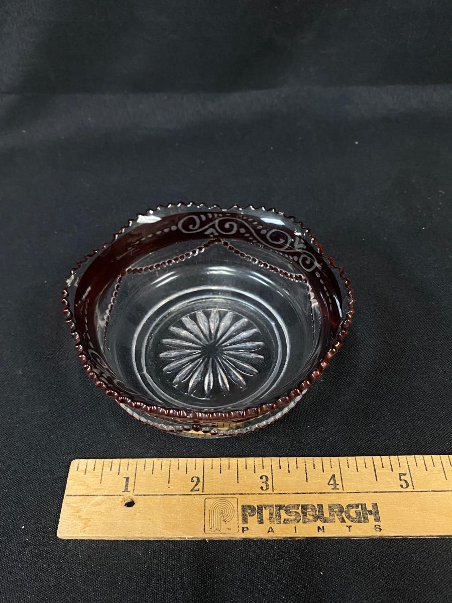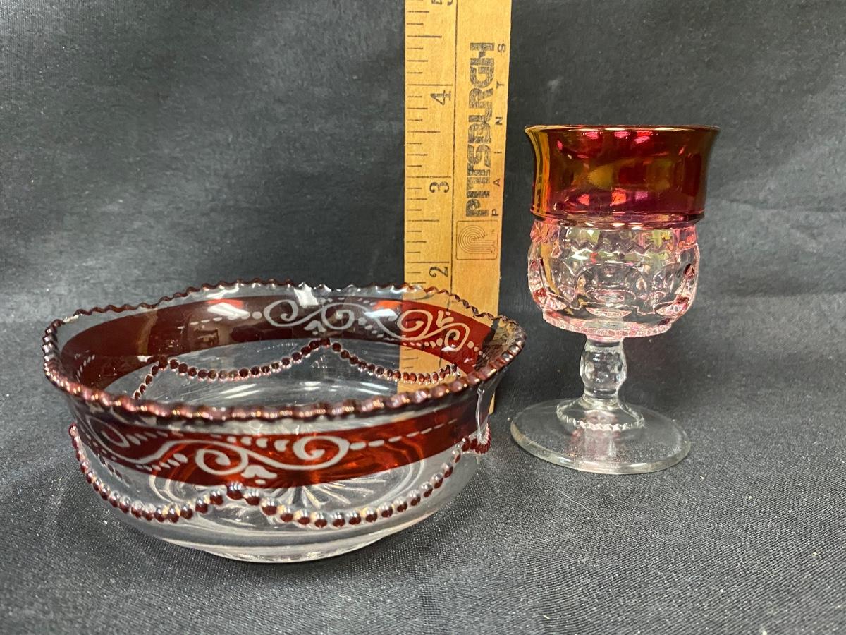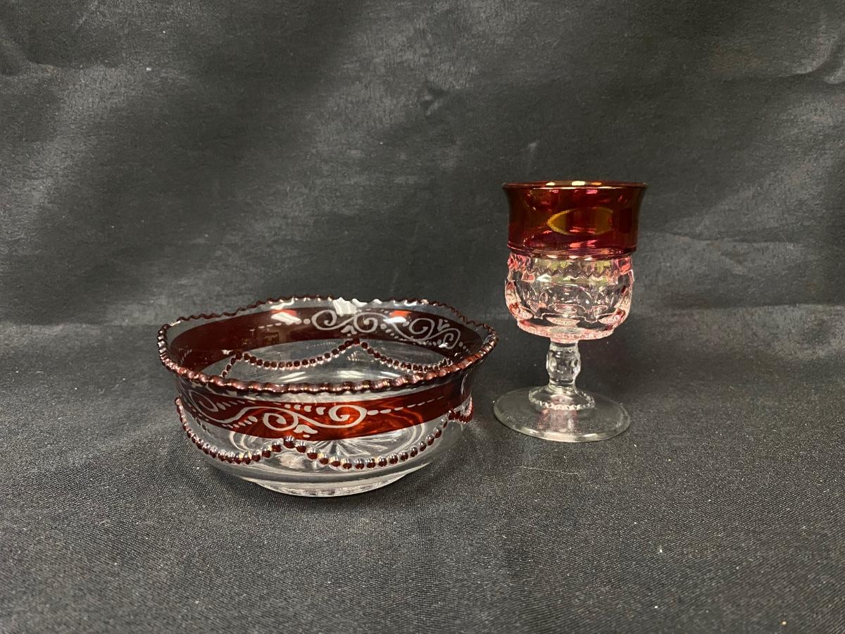 Vintage Ruby Red & Clear Glass Fruit Bowl and Kings Crown Cordial Stemware Drink Glass. Both in good condition, but there is a small, chipped tooth in the edge of bowl.
