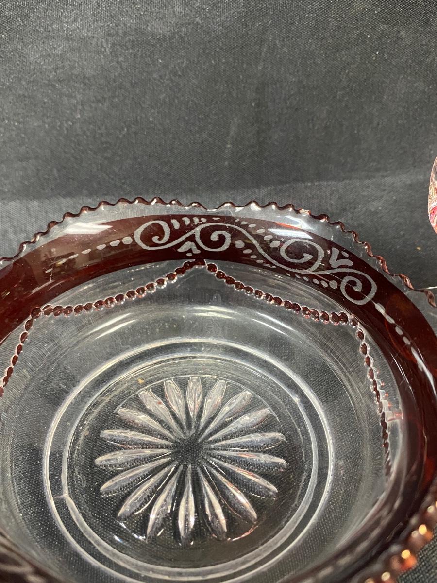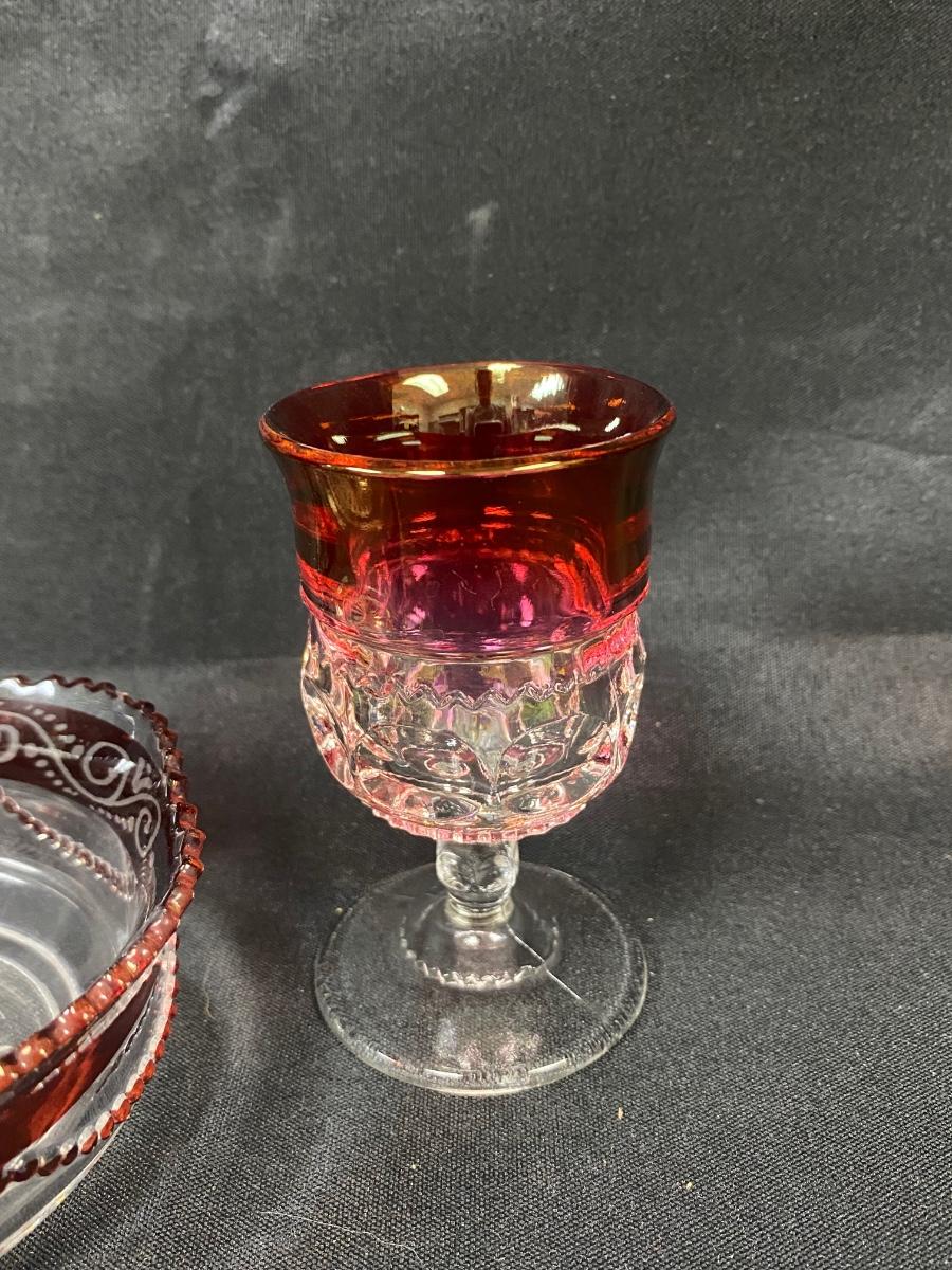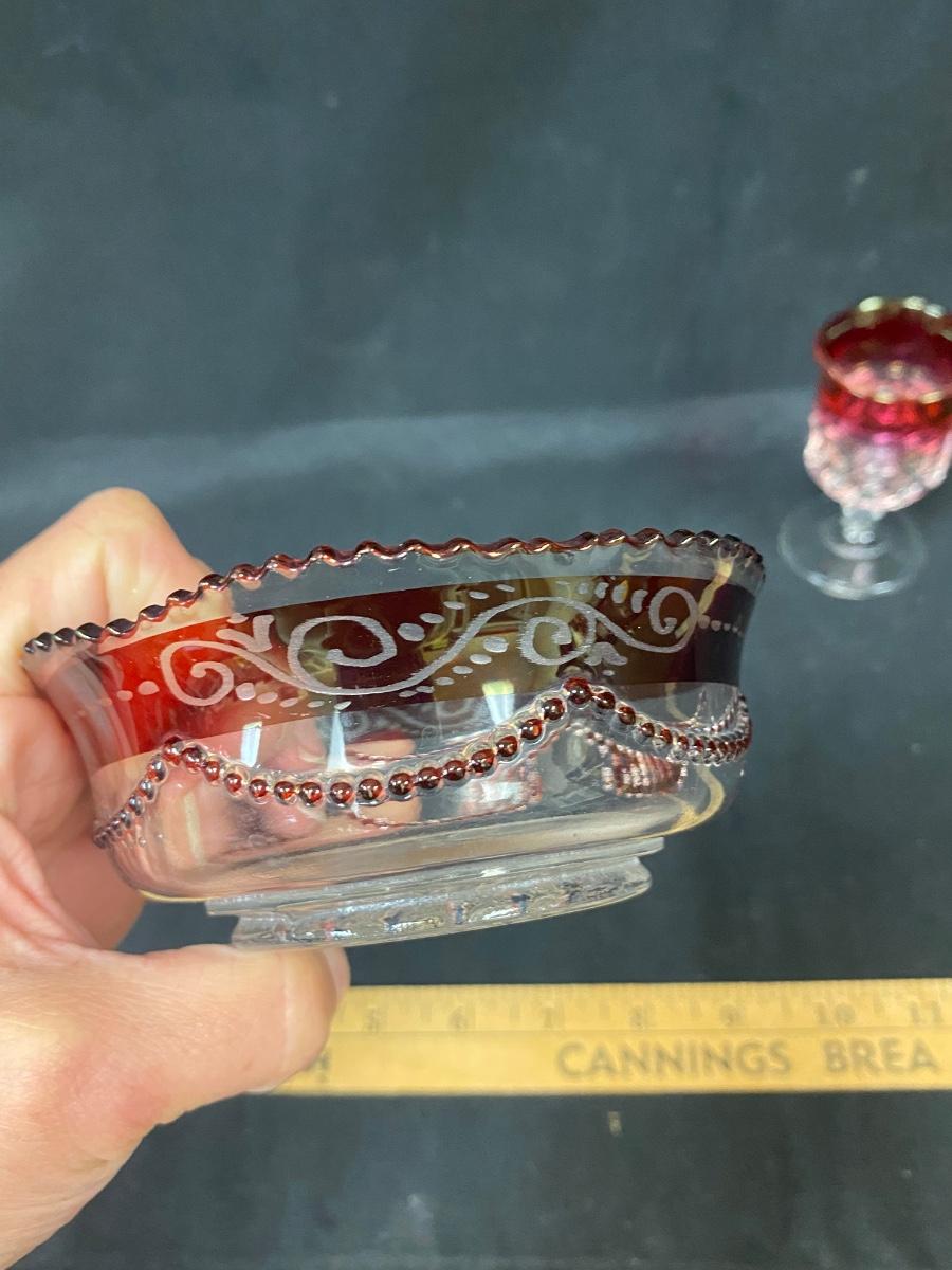 Vintage Ruby Red & Clear Glass Fruit Bowl and Kings Crown Cordial Stemware Drink Glass