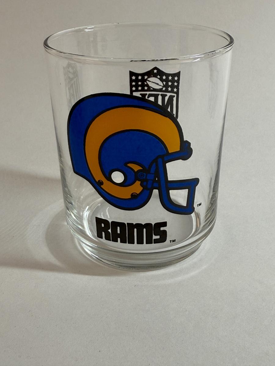 Los Angeles Rams Cocktail Glass Blue Yellow Helmet NFL Football Logo 4" Tall, good condition.