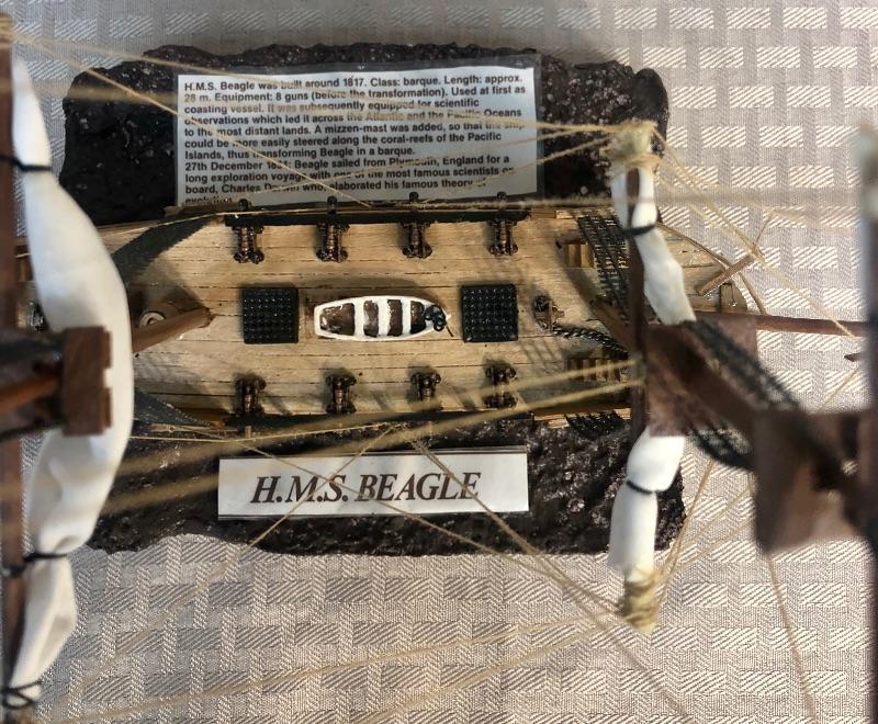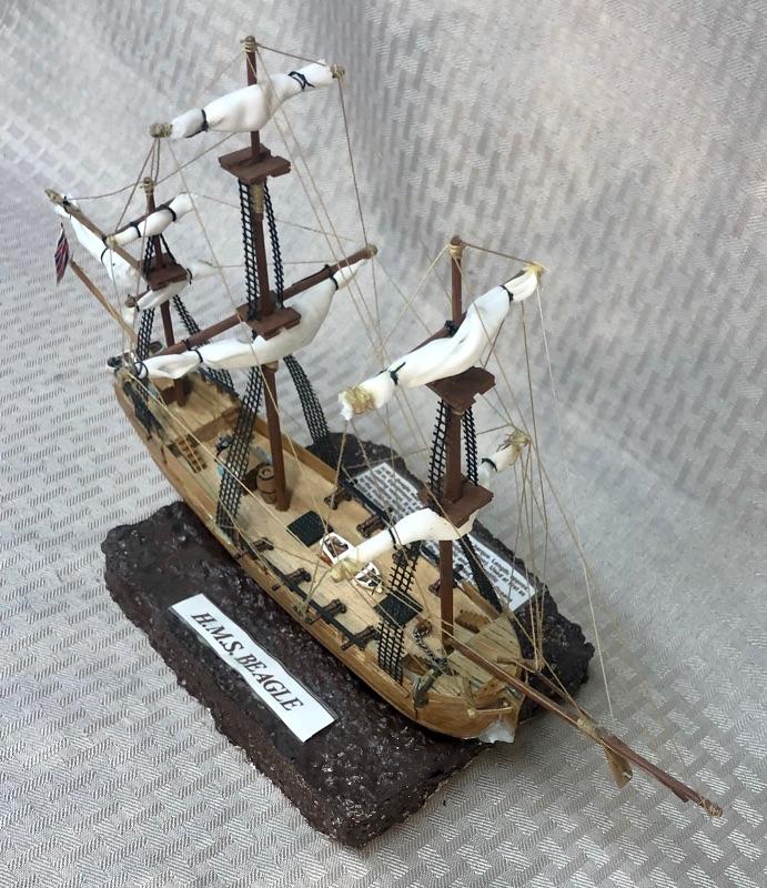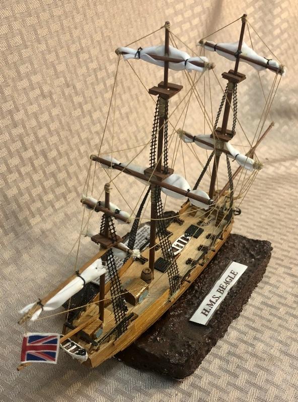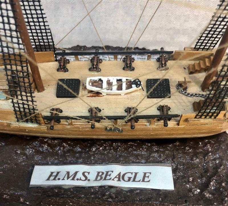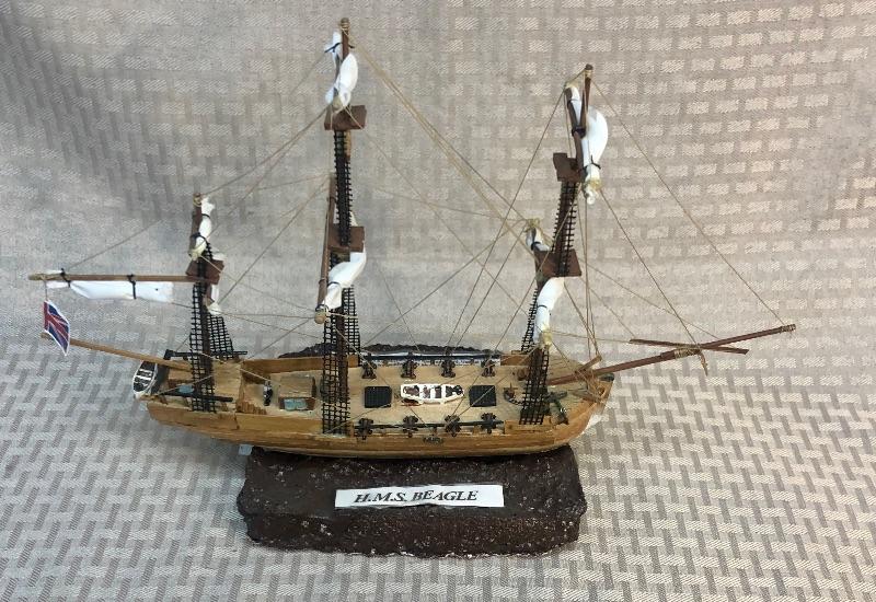 Plastic model of HMS Beagle, ship used by Charles Darwin during worldwide scientific travels.