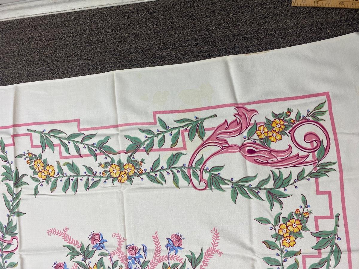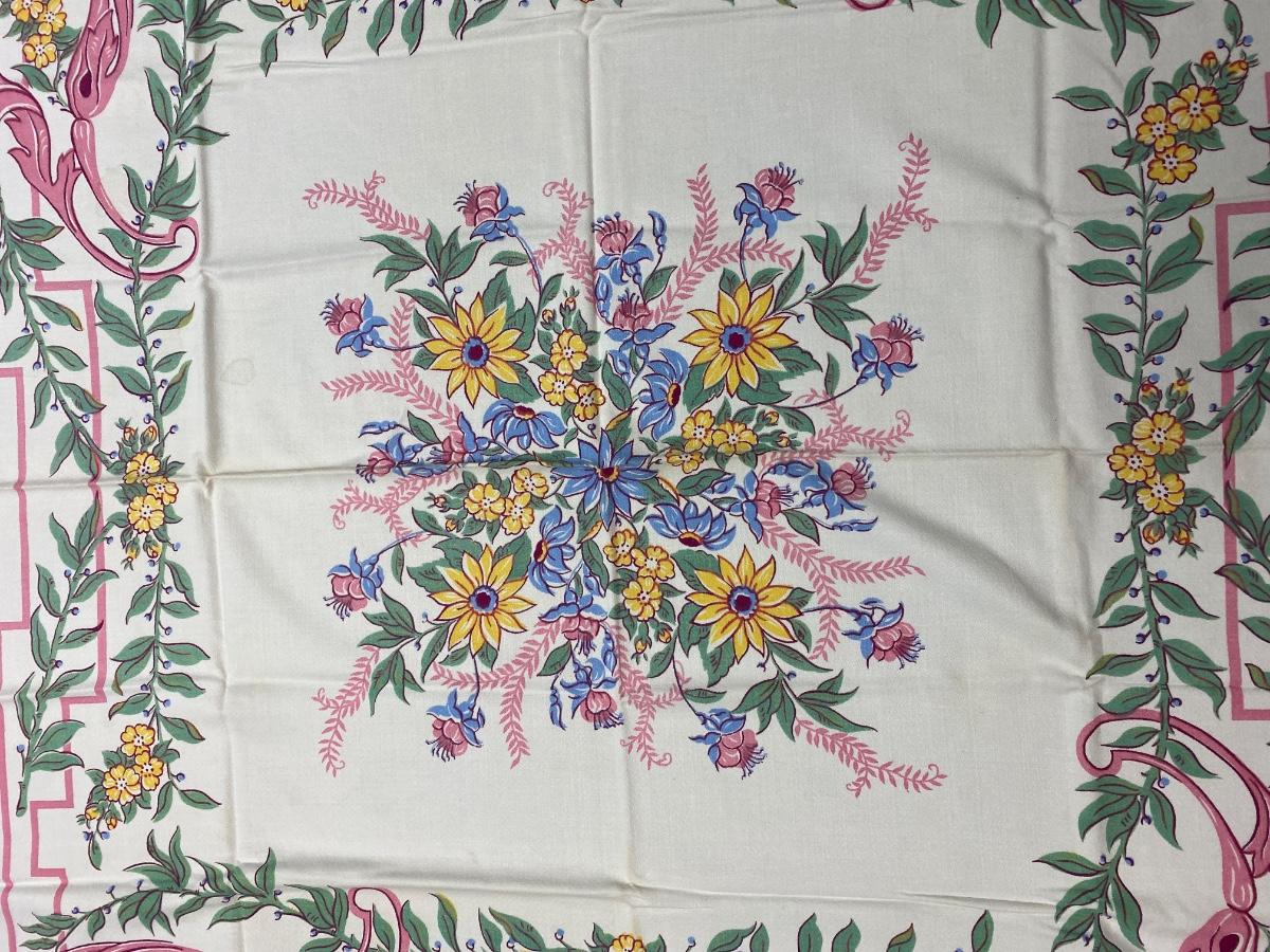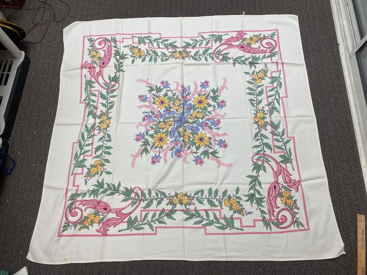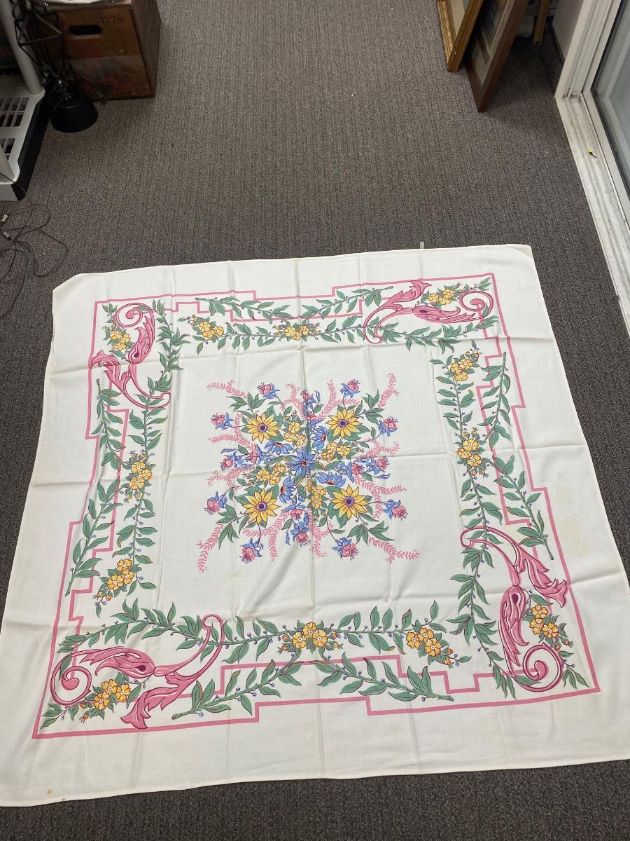 Floral Pattern Square Springtime Tablecloth. About 4' square. Some light spots of discolor.