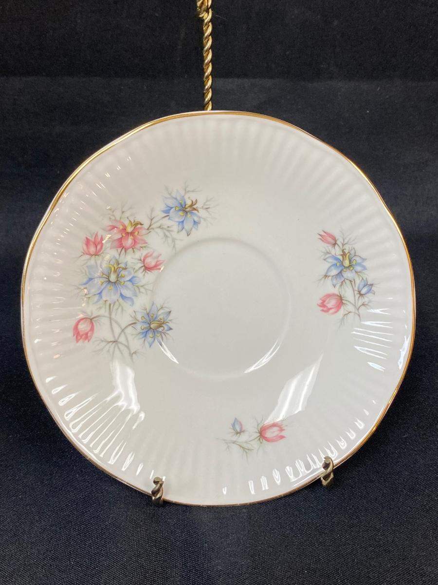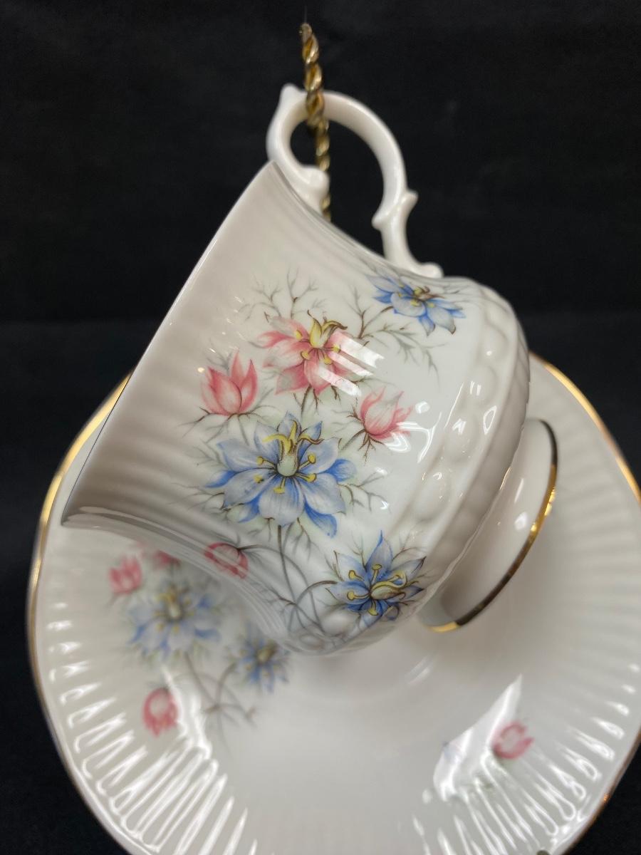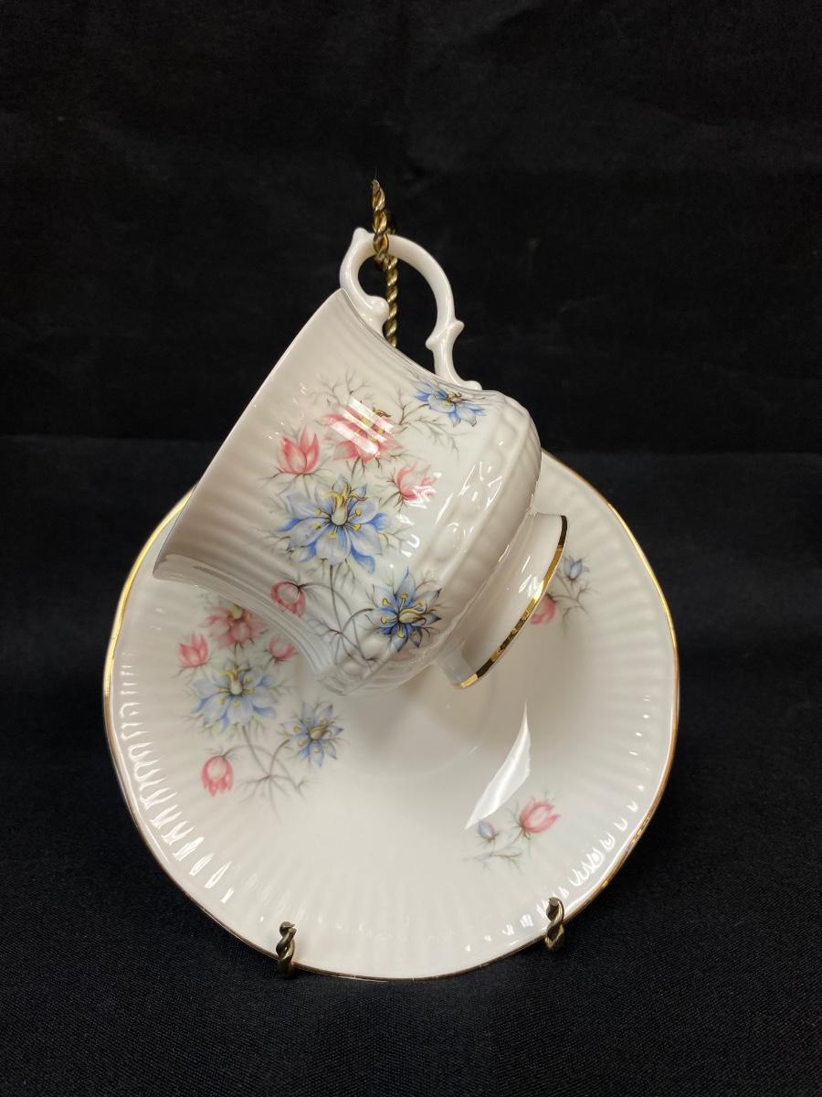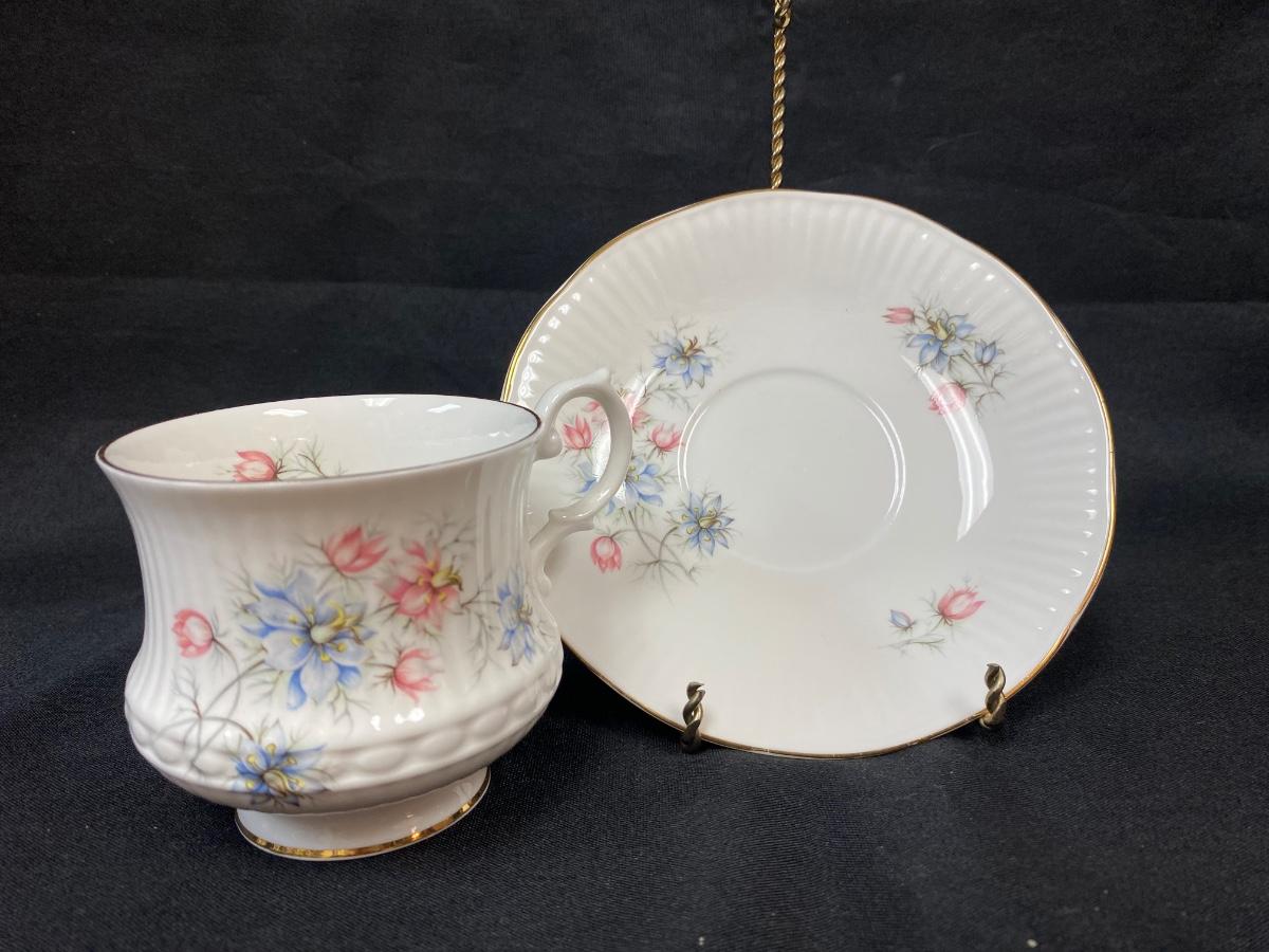 Royal Minster Bone China Teacup and Saucer Ribbed with Pink and Blue Flowers