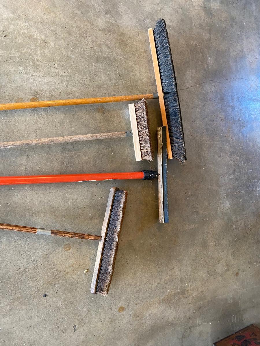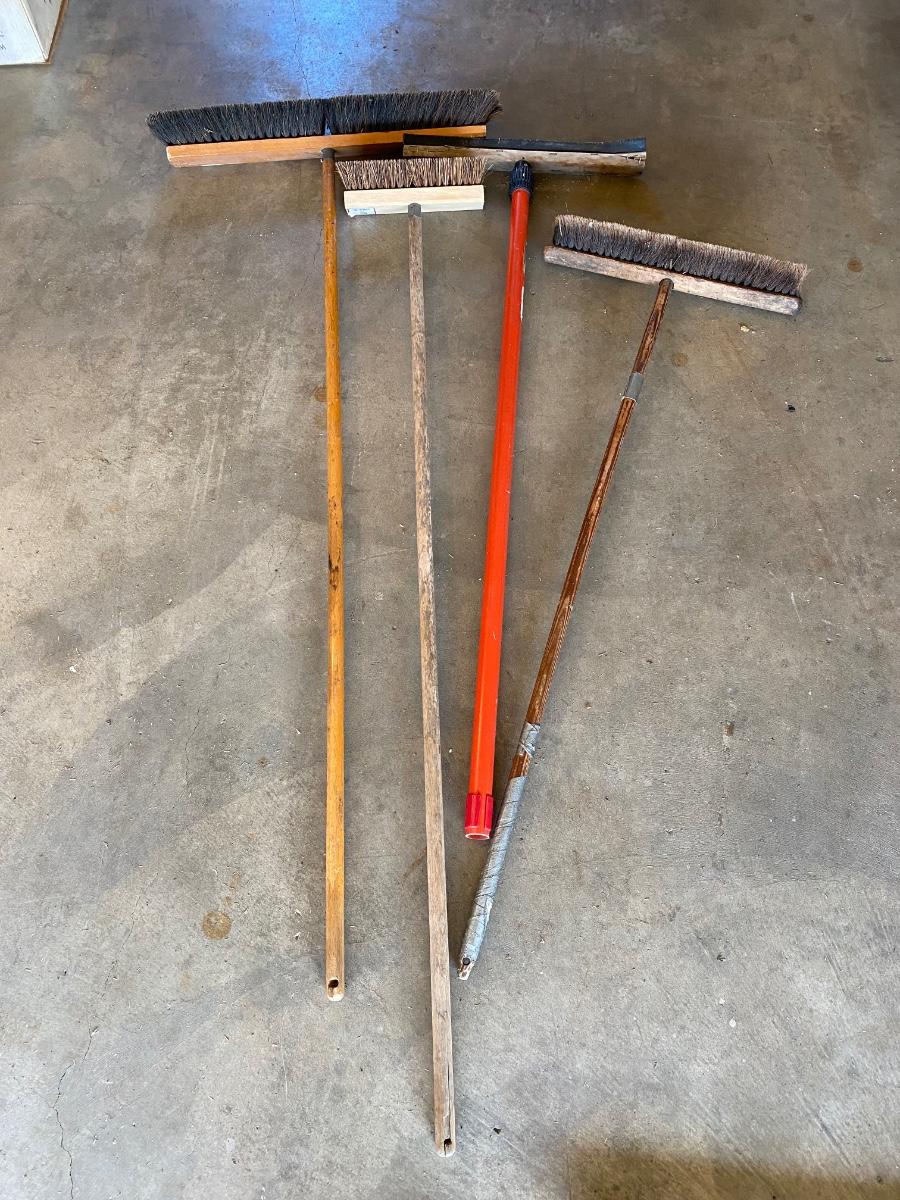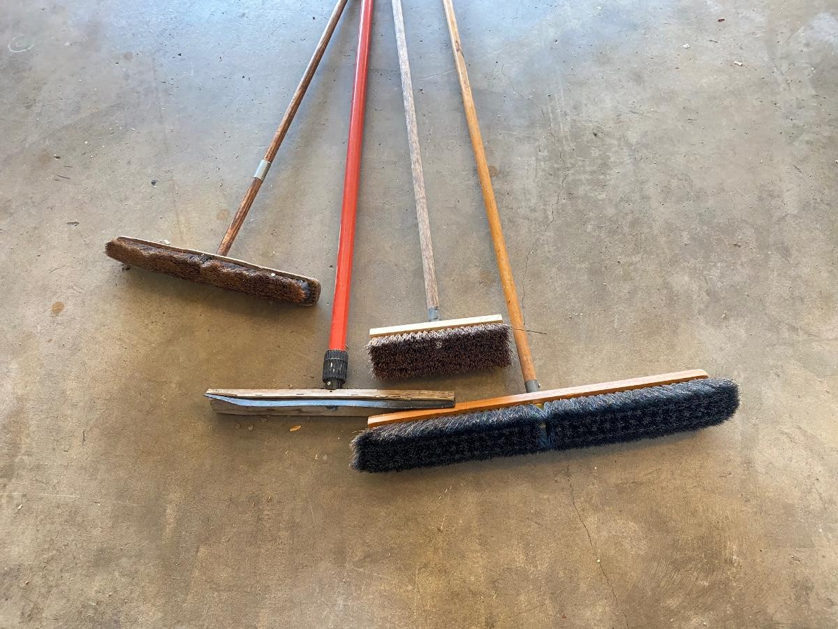 Push Broom and Floor Squeegee Lot. Various sizes of brooms and one floor squeegee.