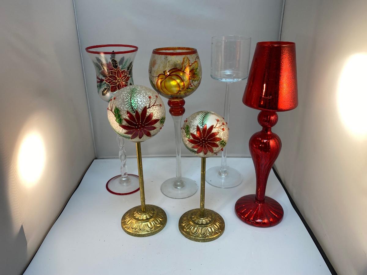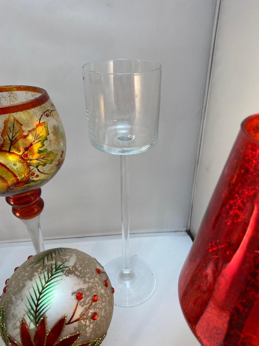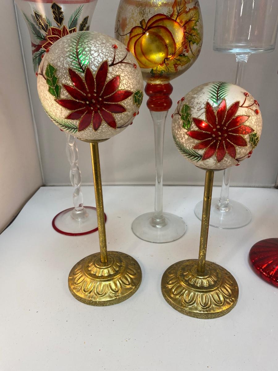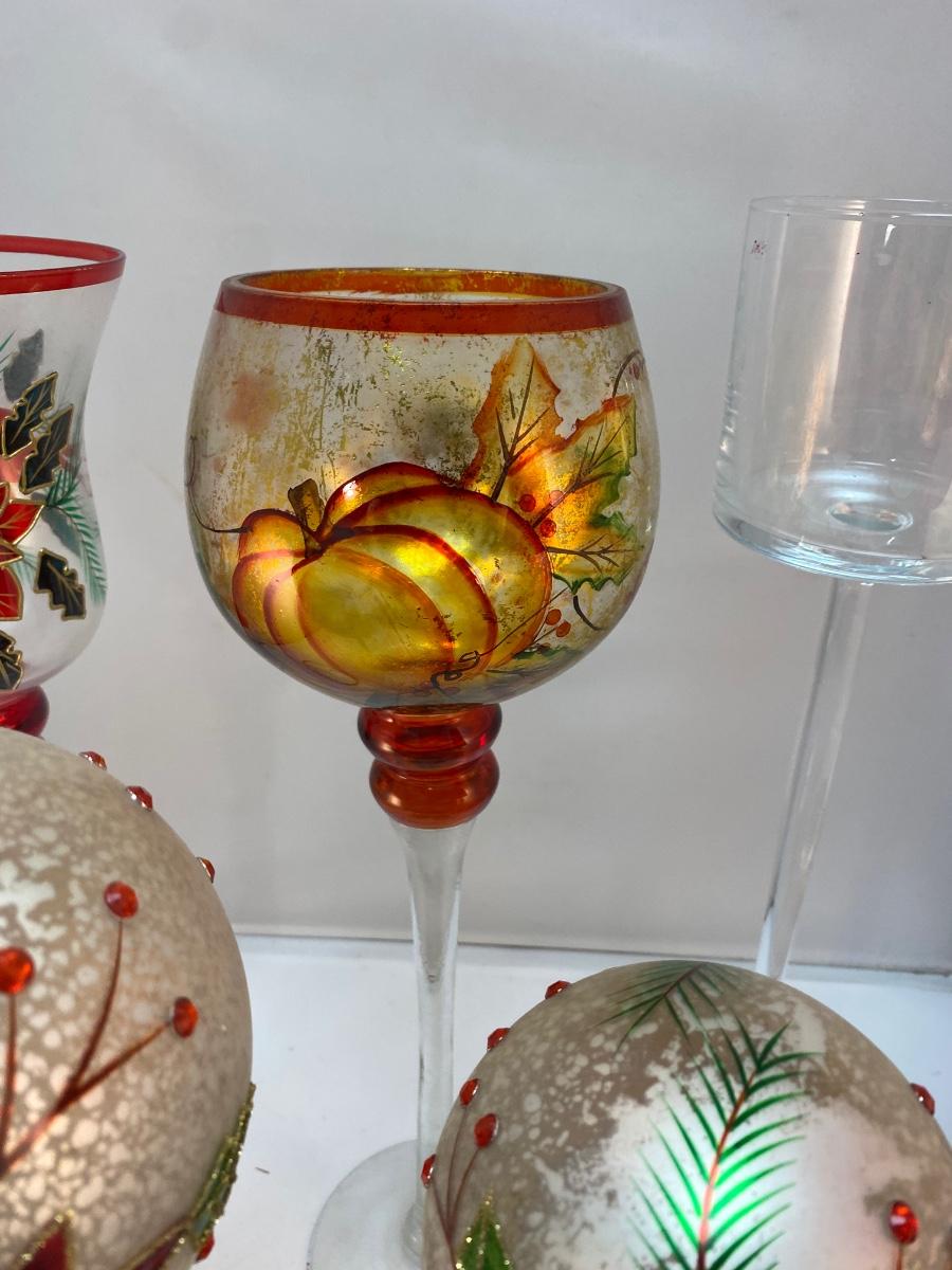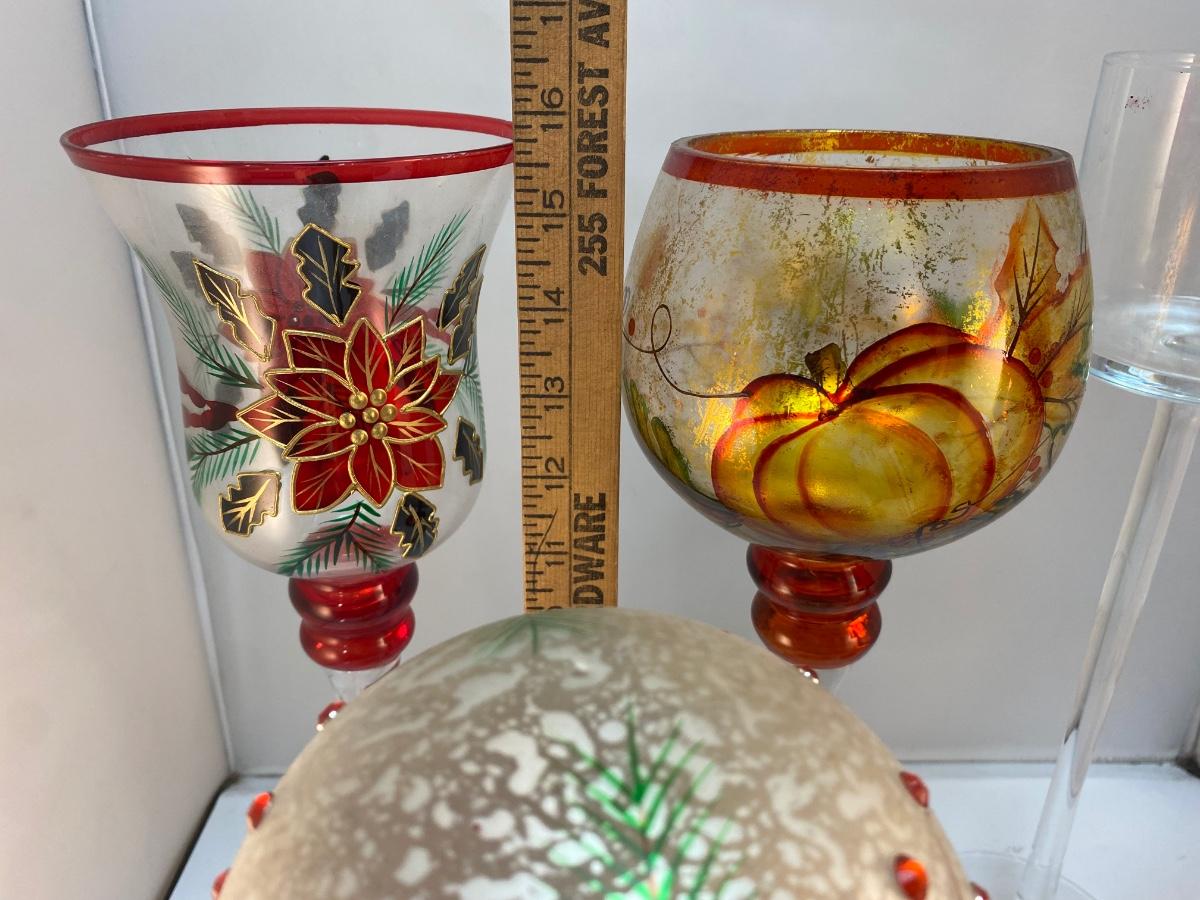 Large Glass Holiday Painted Stemmed Goblet Style Candle Holders and Lights. In good condition. Three are winter, one is fall, one clear and one red. Battery operated light up and candle holders. Around 16" and smaller.