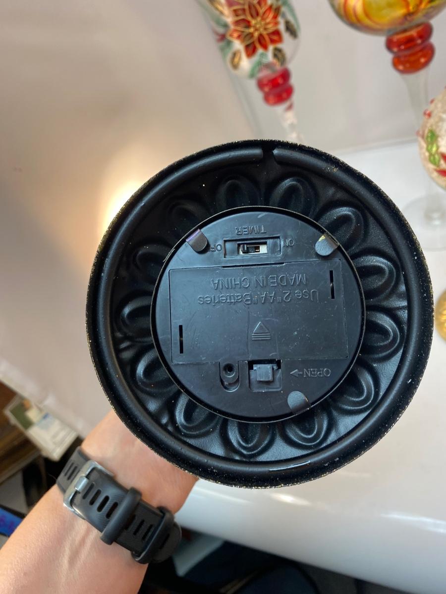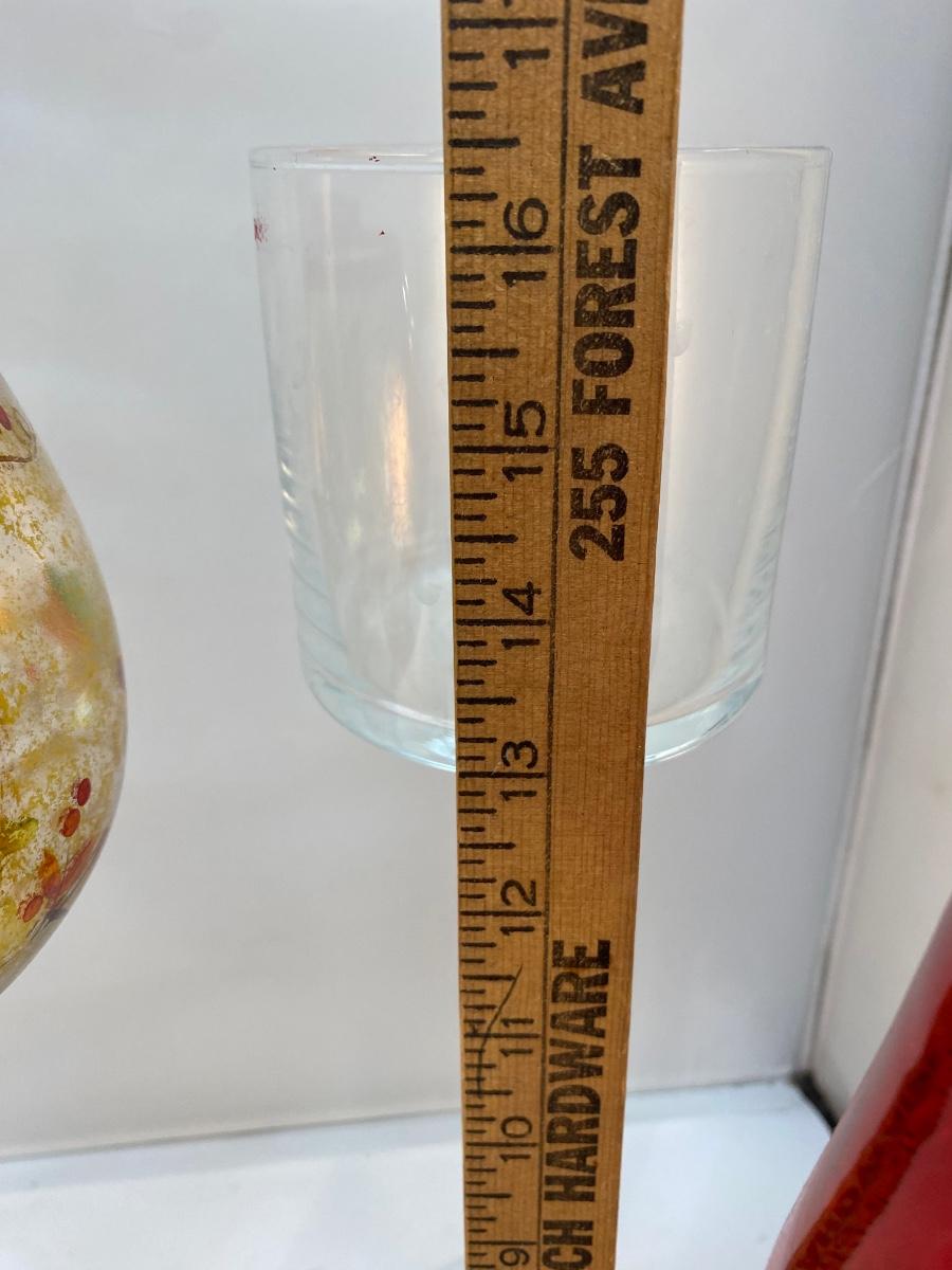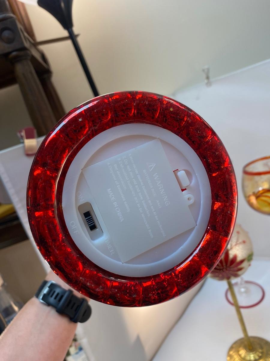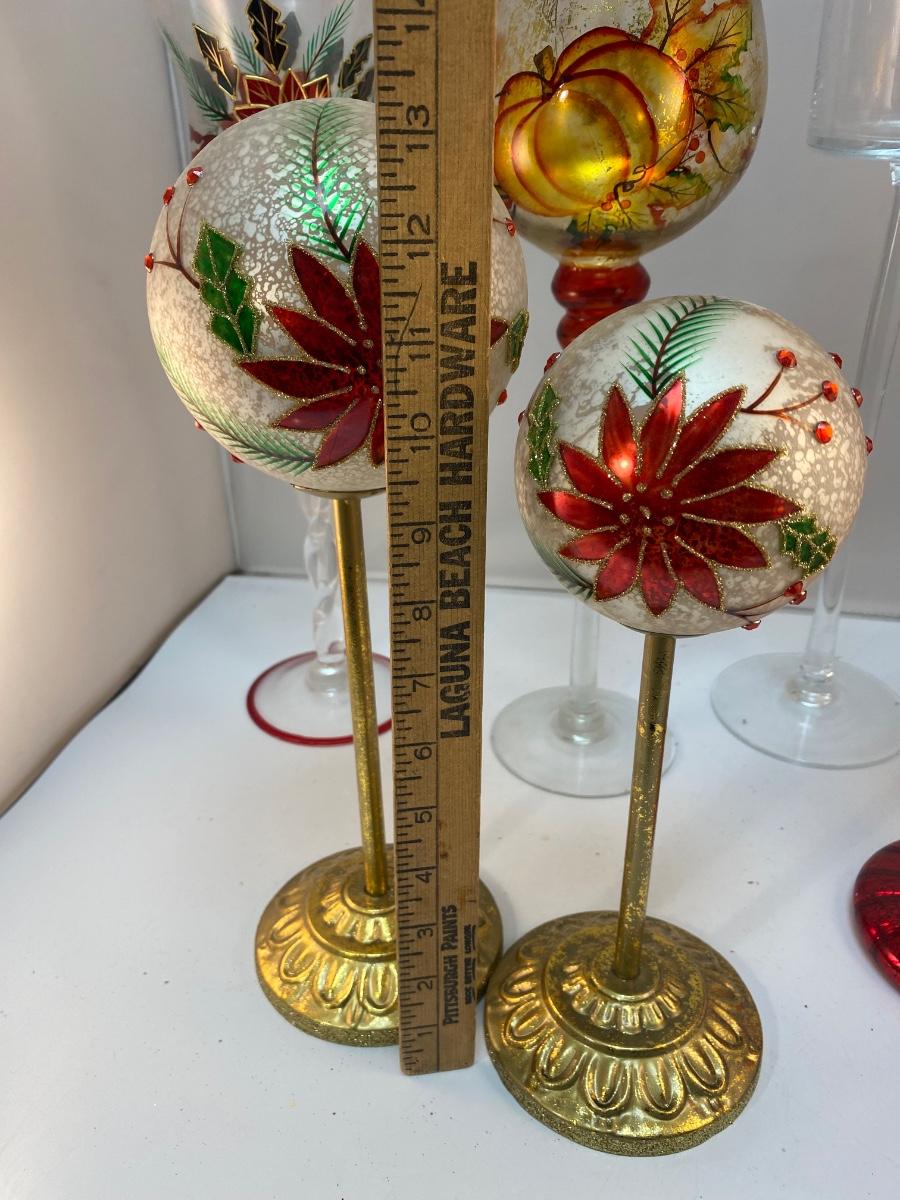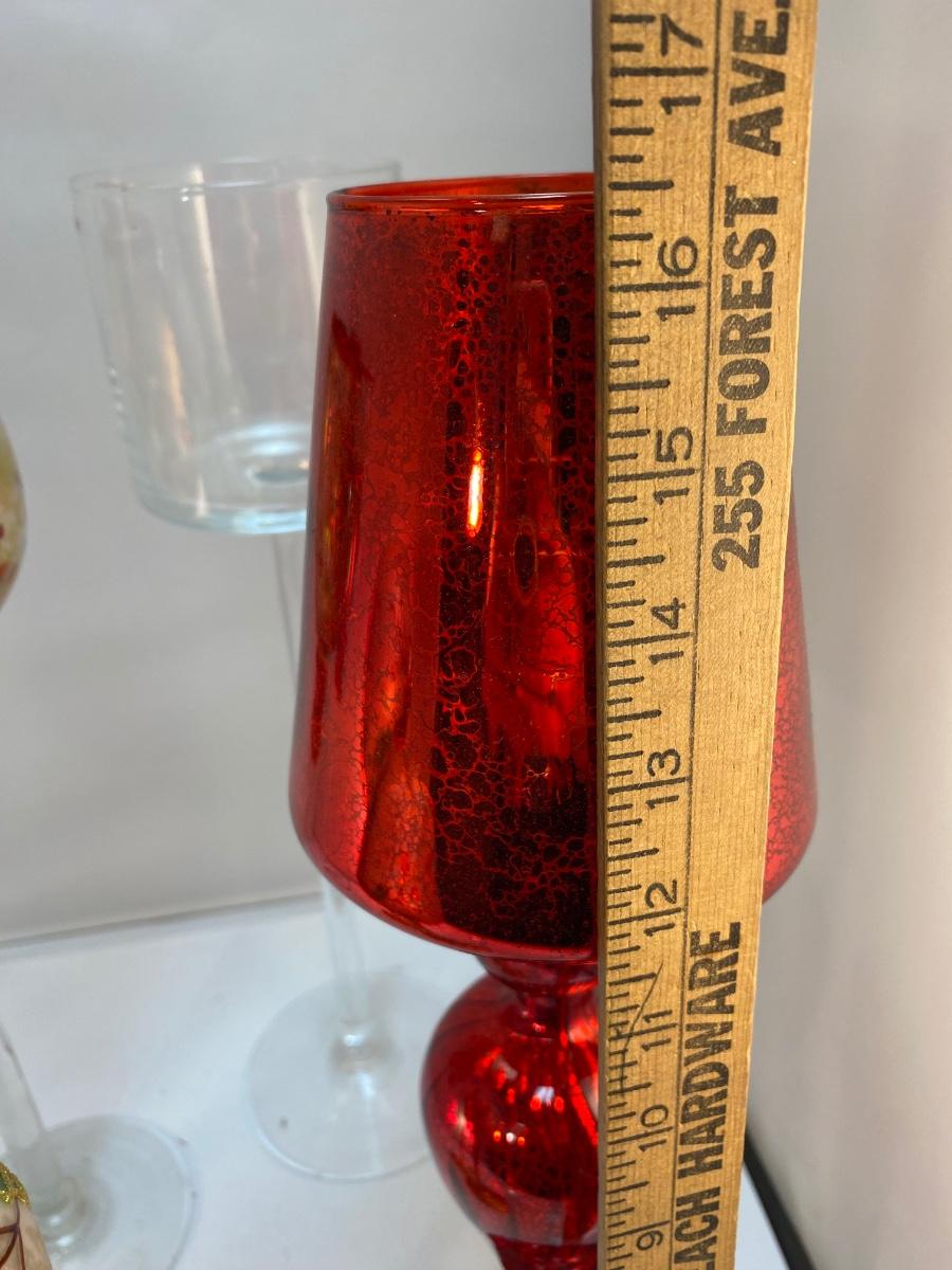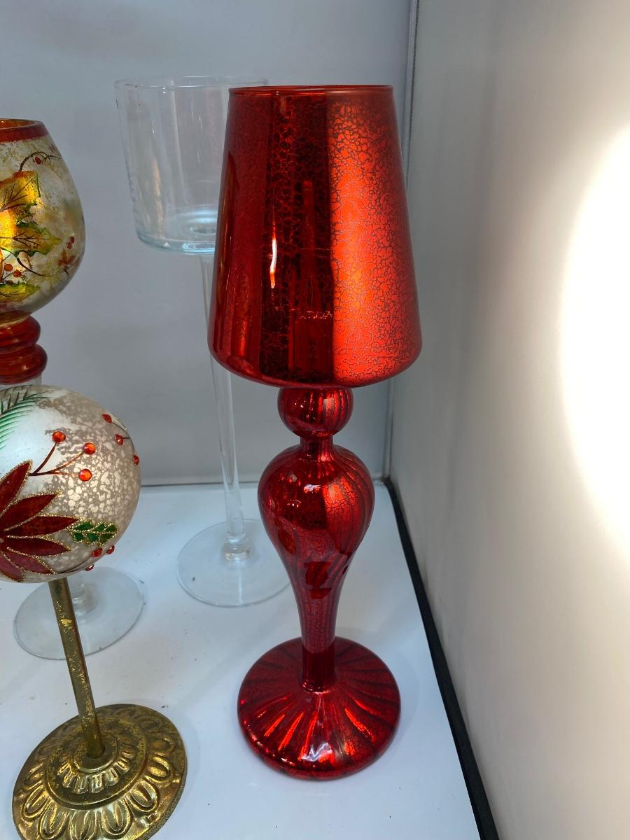 Large Glass Holiday Painted Stemmed Goblet Style Candle Holders and Lights. In good condition. Three are winter, one is fall, one clear and one red. Battery operated light up and candle holders. Around 16" and smaller.