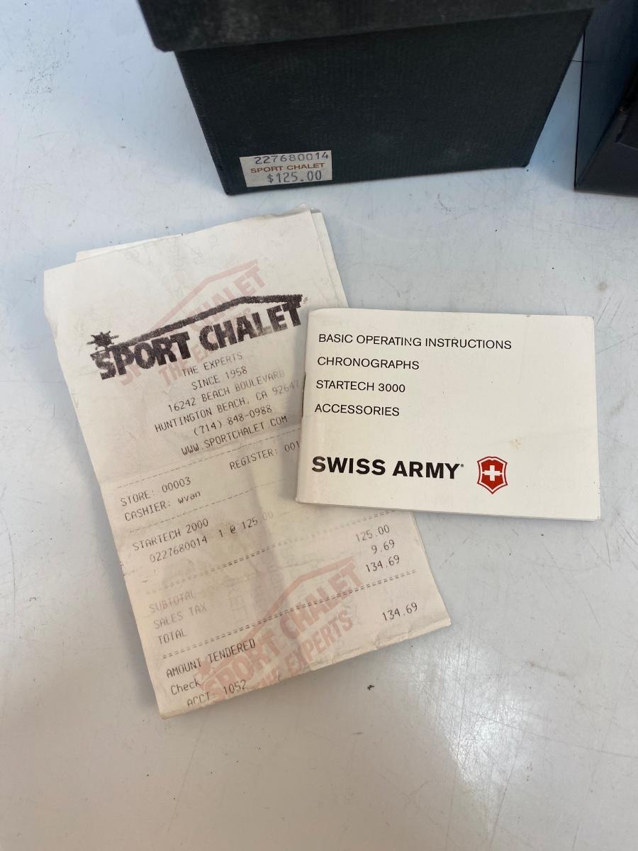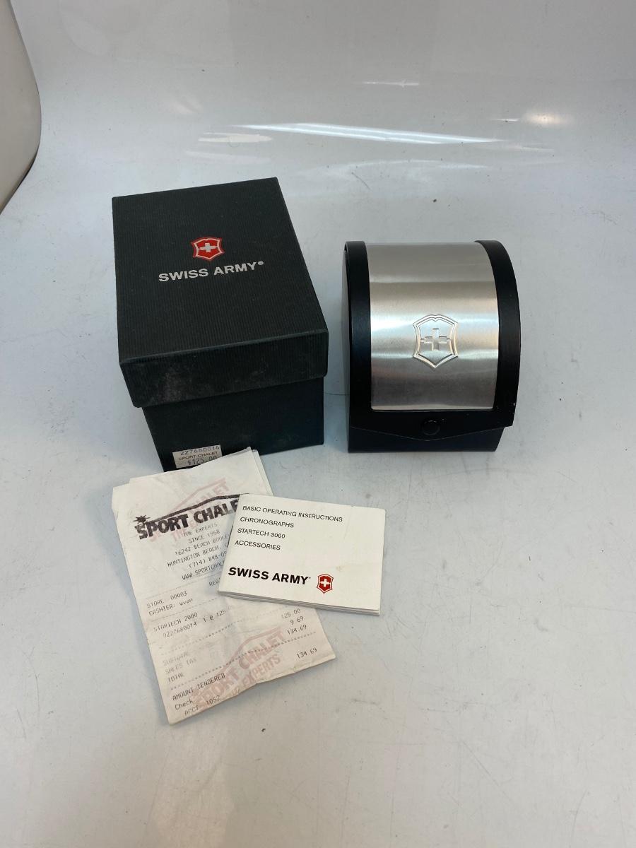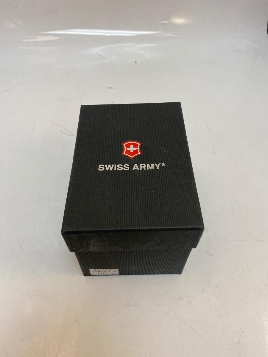 Swiss Army Men's Wristwatch Time Piece with Original Box. Light signs of wear. Currently not running, may just need a battery. Comes with original box, user guide and sales receipt.