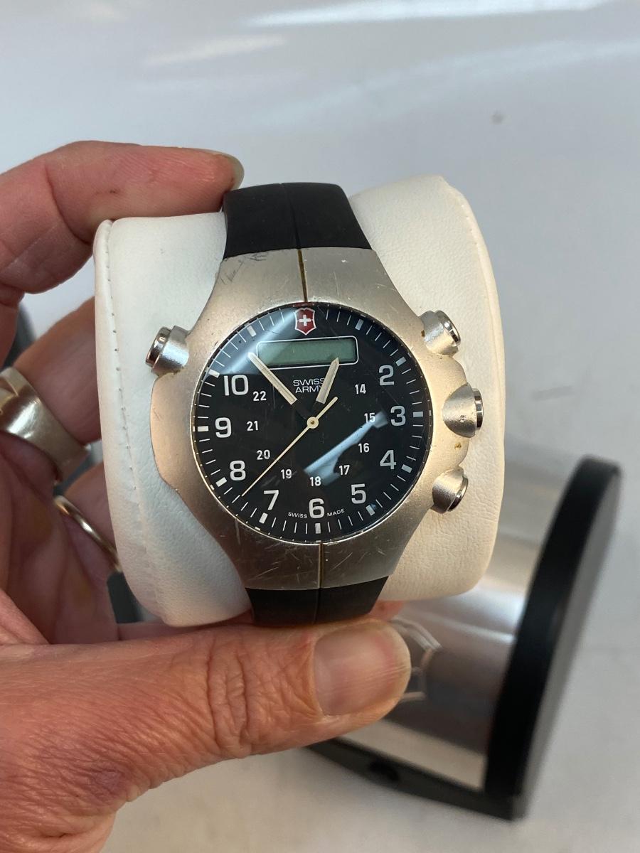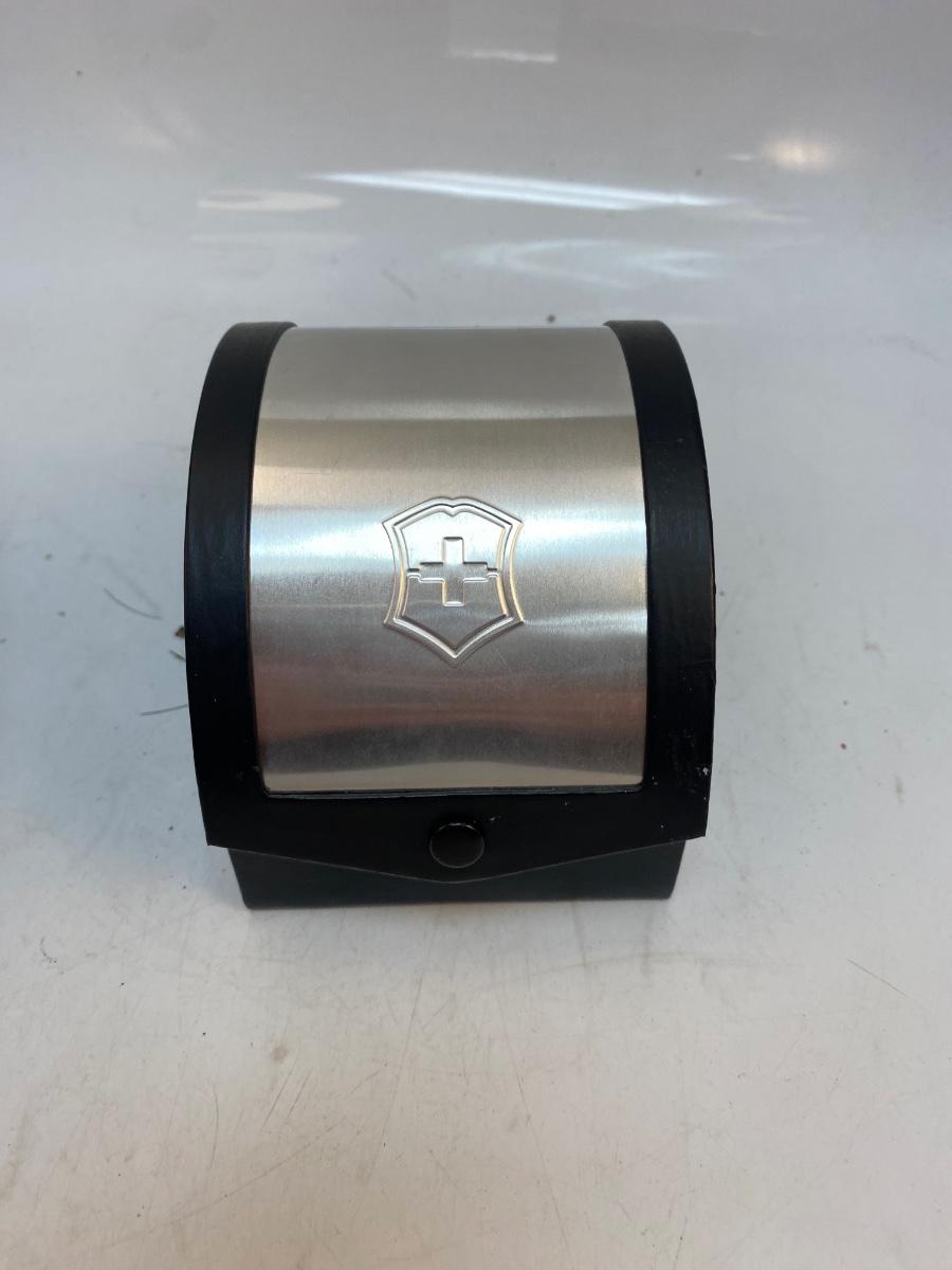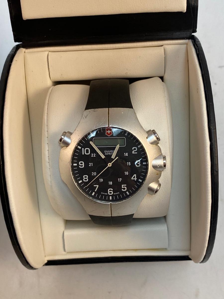 Swiss Army Men's Wristwatch Time Piece with Original Box. Light signs of wear. Currently not running, may just need a battery. Comes with original box, user guide and sales receipt.