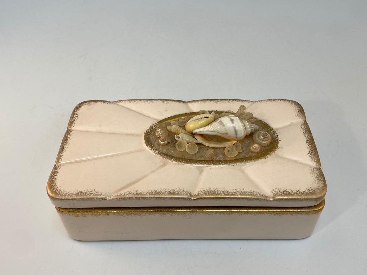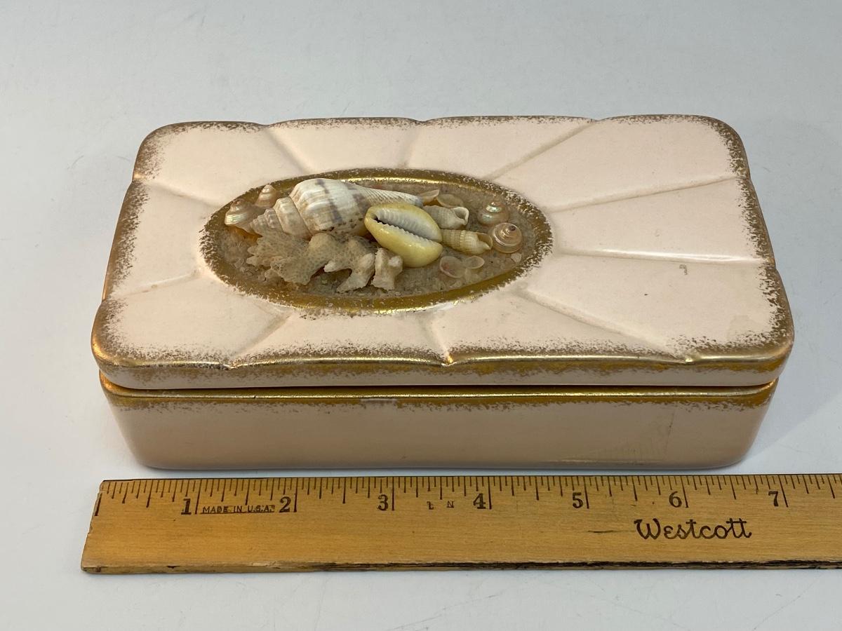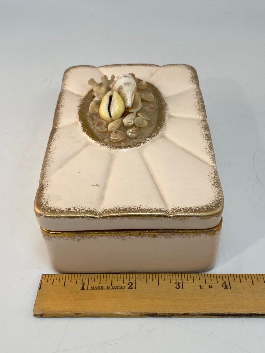 Vintage Pale Pink 1959 Pottery Divided Trinket Dish with Seashell Adorn Lid. Signed on the bottom. In good condition despite a few missing seashells.