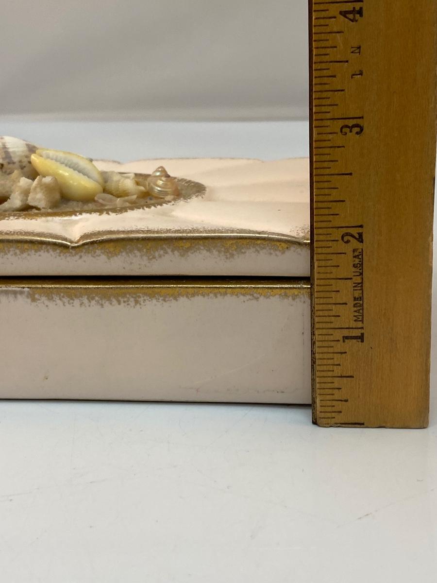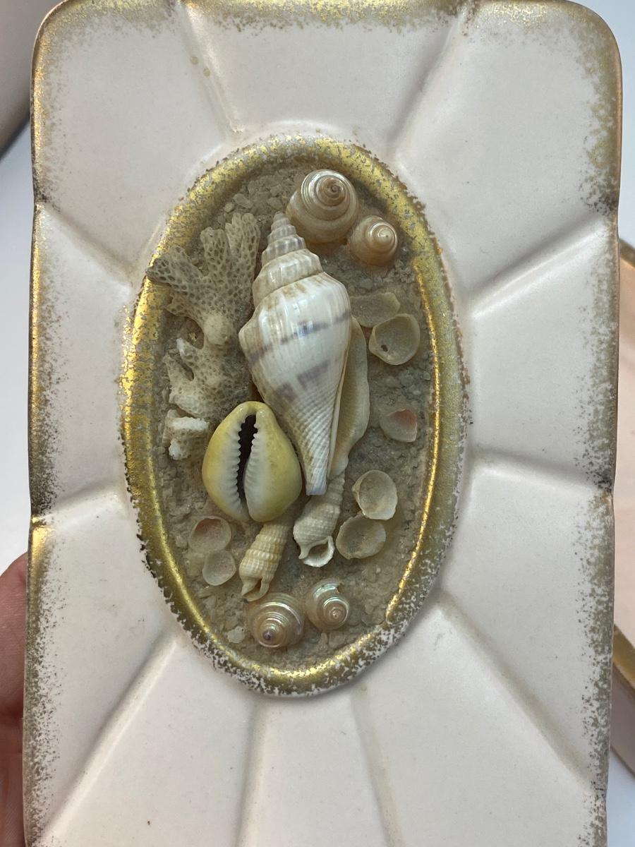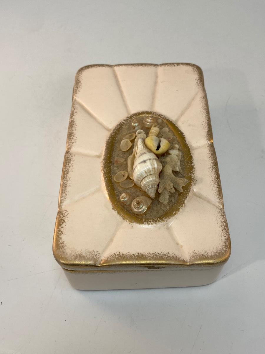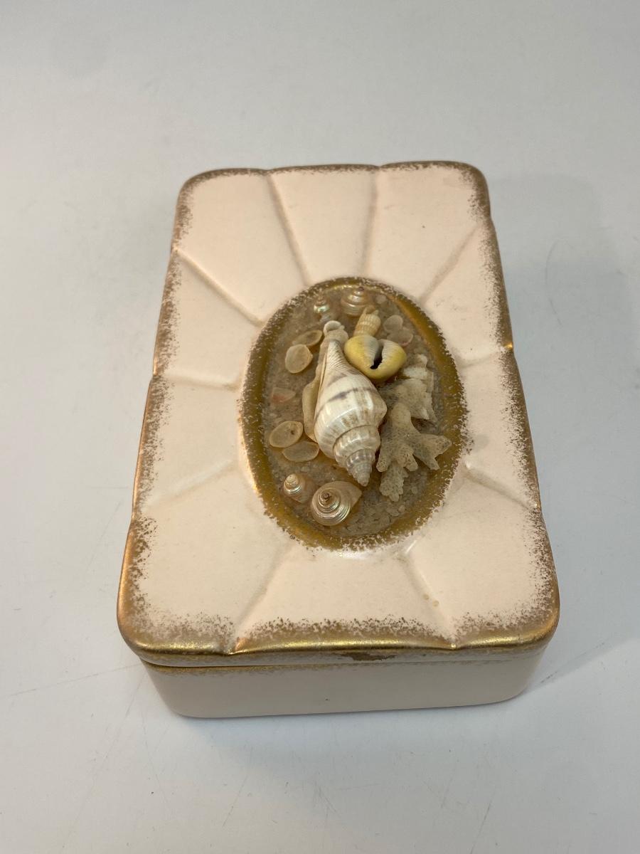 Vintage Pale Pink 1959 Pottery Divided Trinket Dish with Seashell Adorn Lid. Signed on the bottom. In good condition despite a few missing seashells.