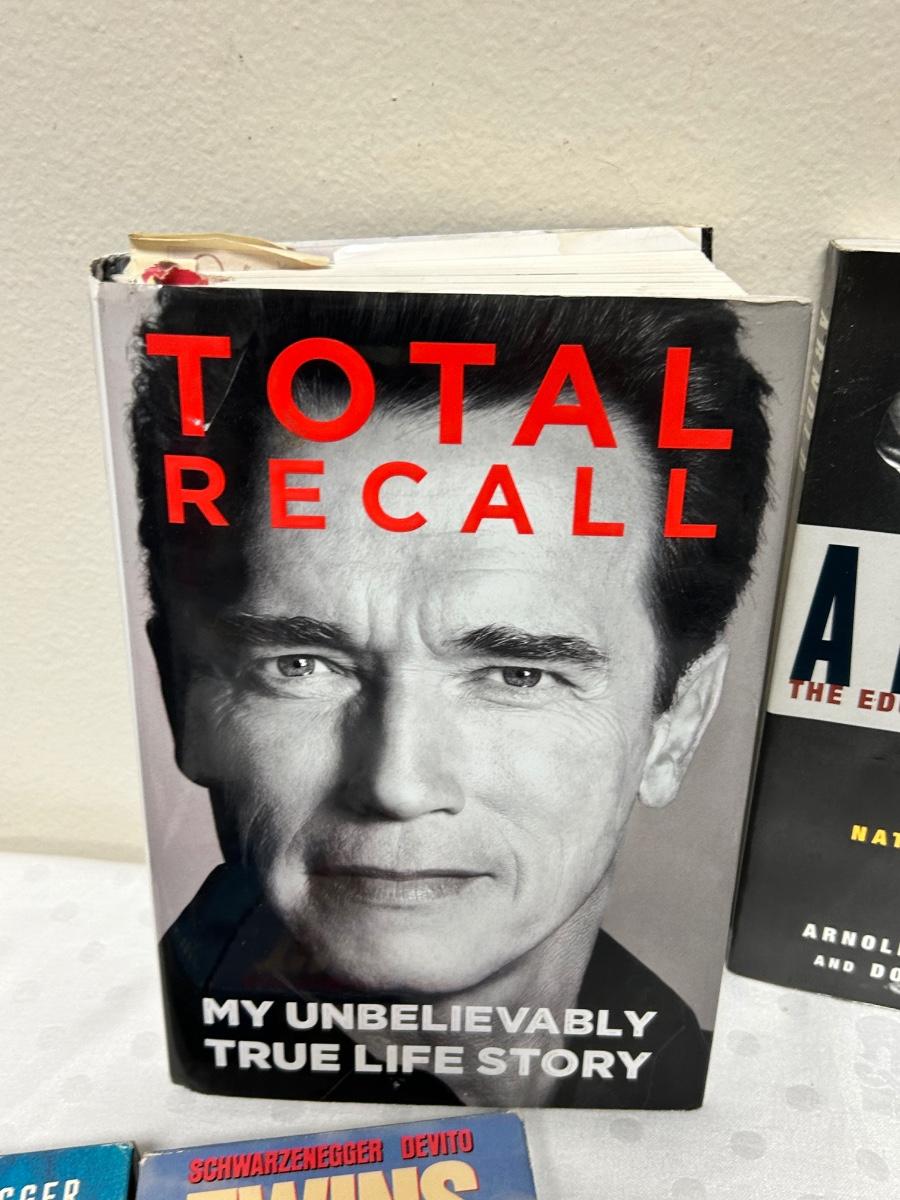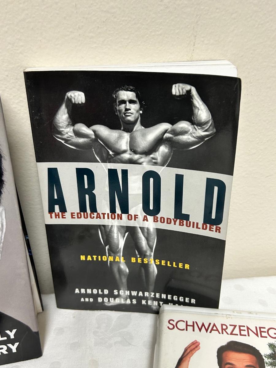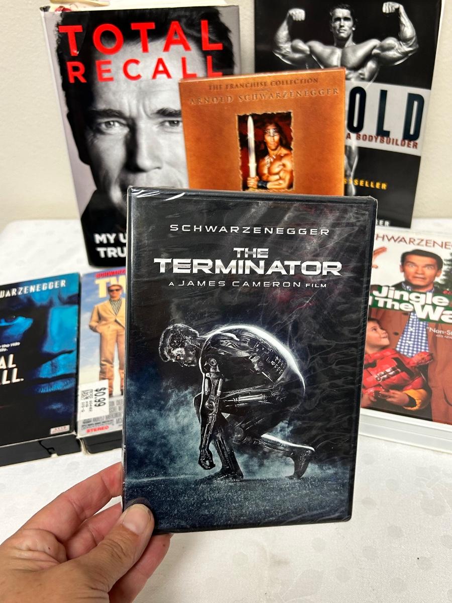 Arnold Schwarzenegger Fan Lot VHS Movies DVDs Books. Books are well read with bookmarked pages and some quotes highlighted in the weightlifting book. The Terminator DVD is still sealed.