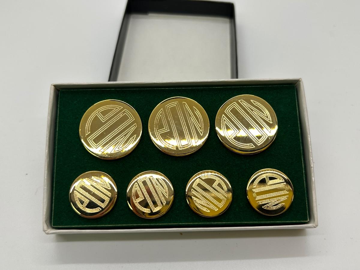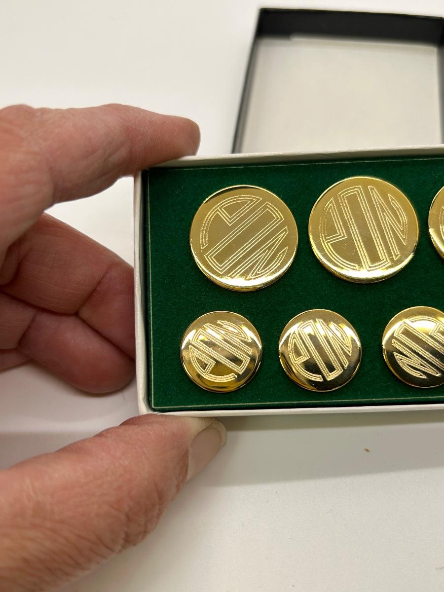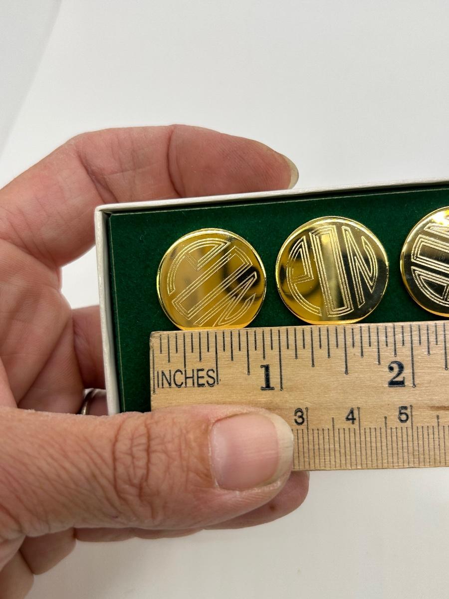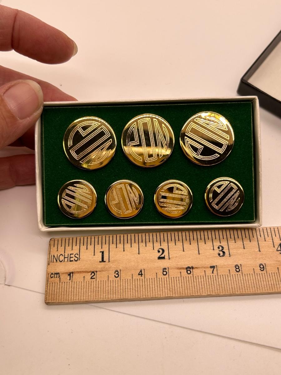 Vintage Monogrammed PON Gold Tone Shirt Buttons Unused New in Box. Set of 7, two sizes.