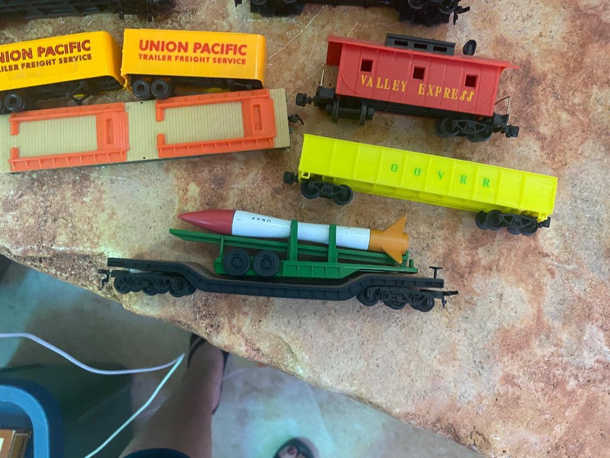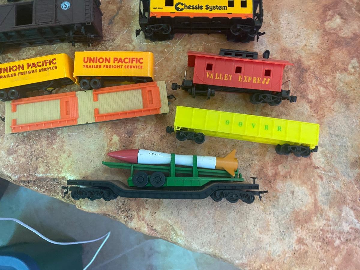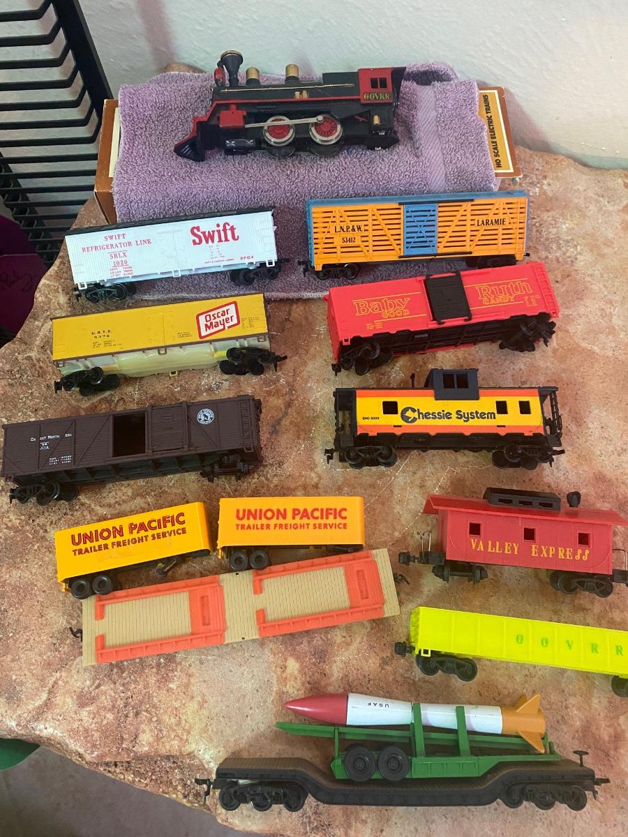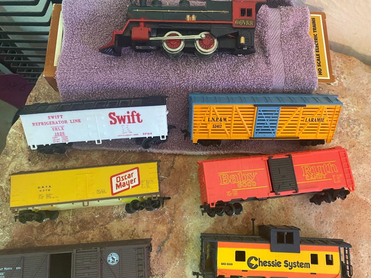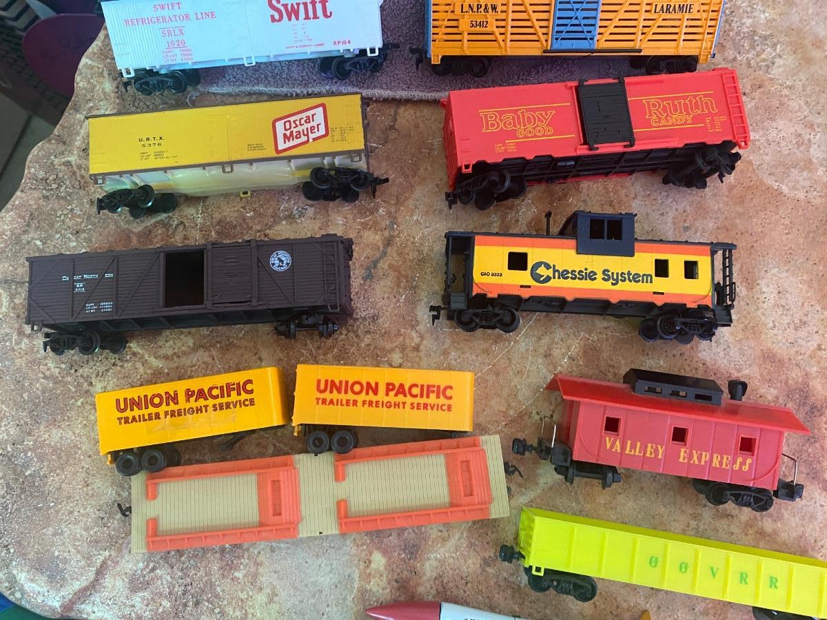 HO MODEL TRAIN CARS AND LOCOMOTIVE.