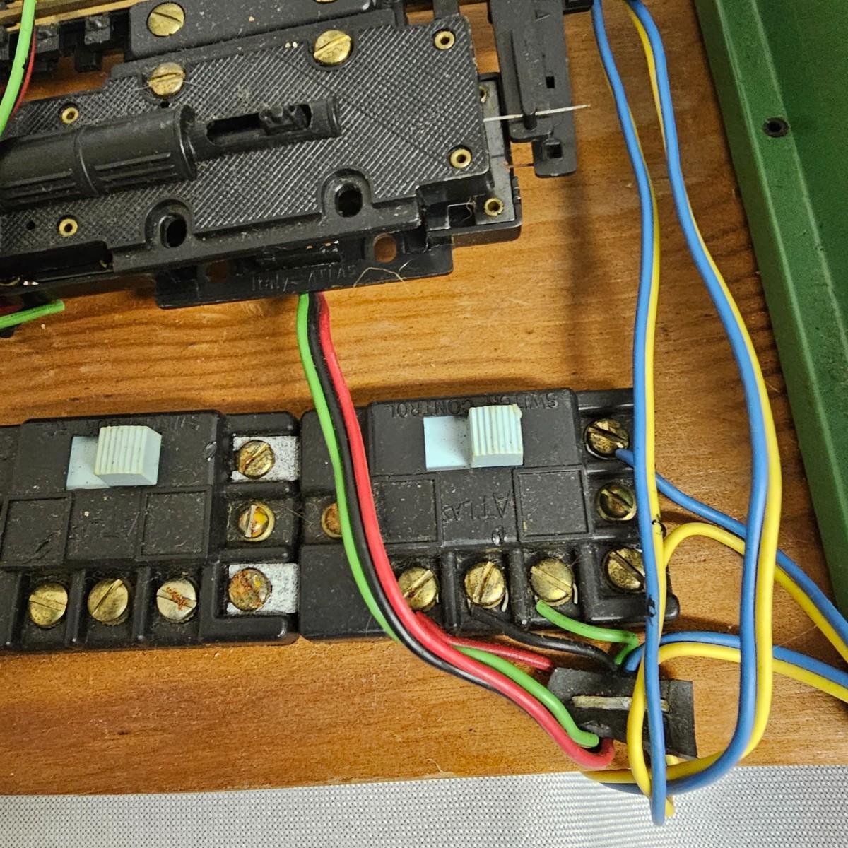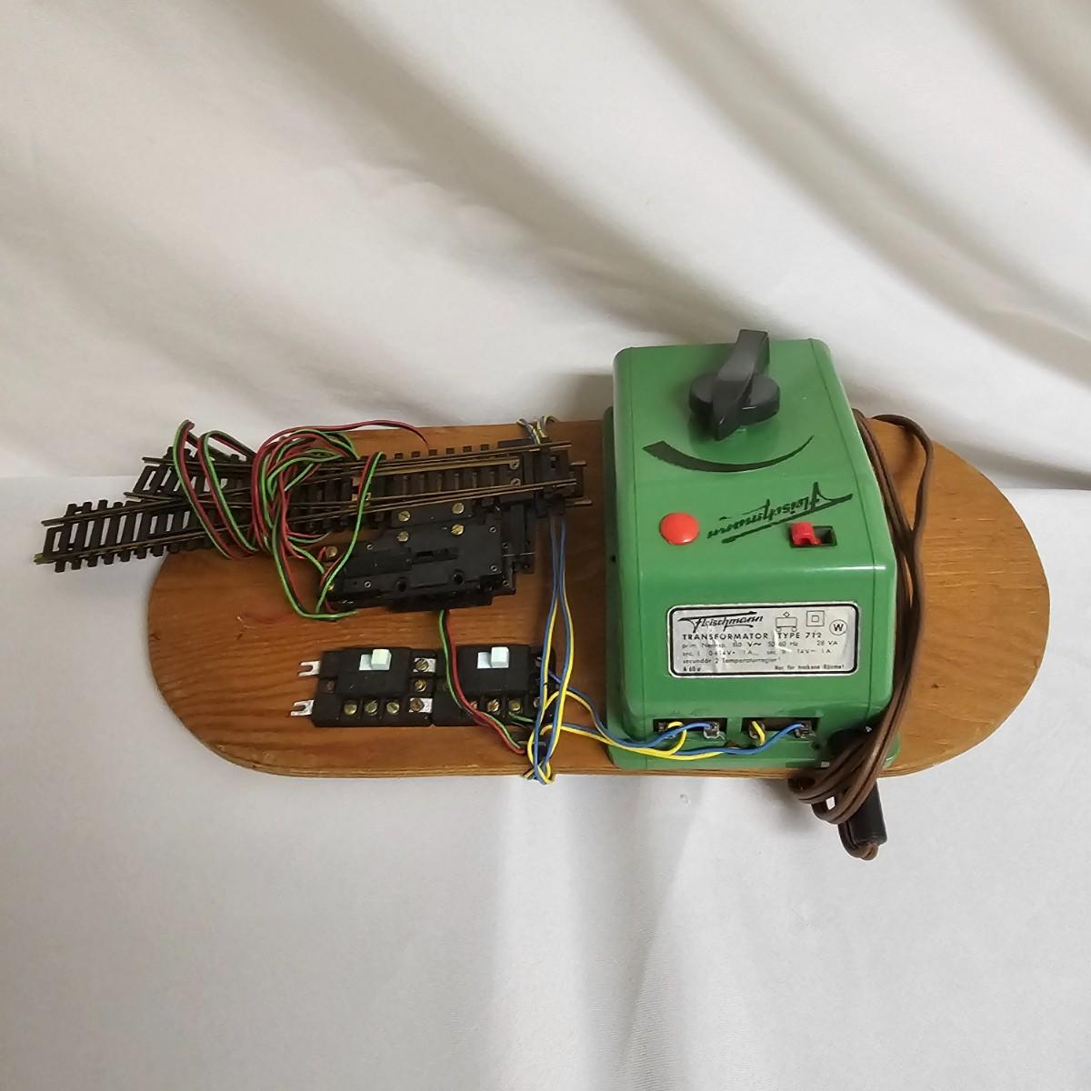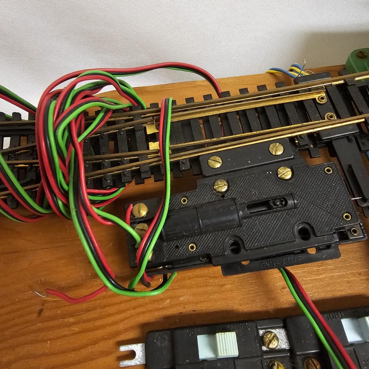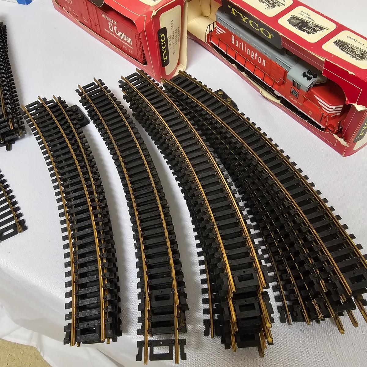 A mixture of HO model train items. Diesels, caboose, boxcars, flatcars, more. Brass sectional track, 16 straight and 31 curved including two terminal tracks. One Fleischman transformer, two Atlas turnouts with controllers. Cars/engines represent Santa Fe, Chessie, Western Maryland, others, made by Bachmann, Tyco, Athearn. Engines not tested. Transformer powered on when plugged in. One Western Maryland diesel is DCC equipped, others are AC only. See photos for details. Shipping available.