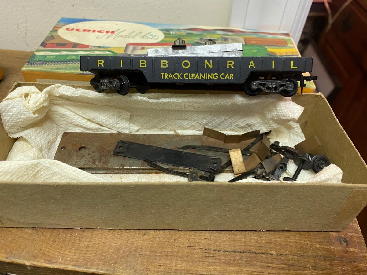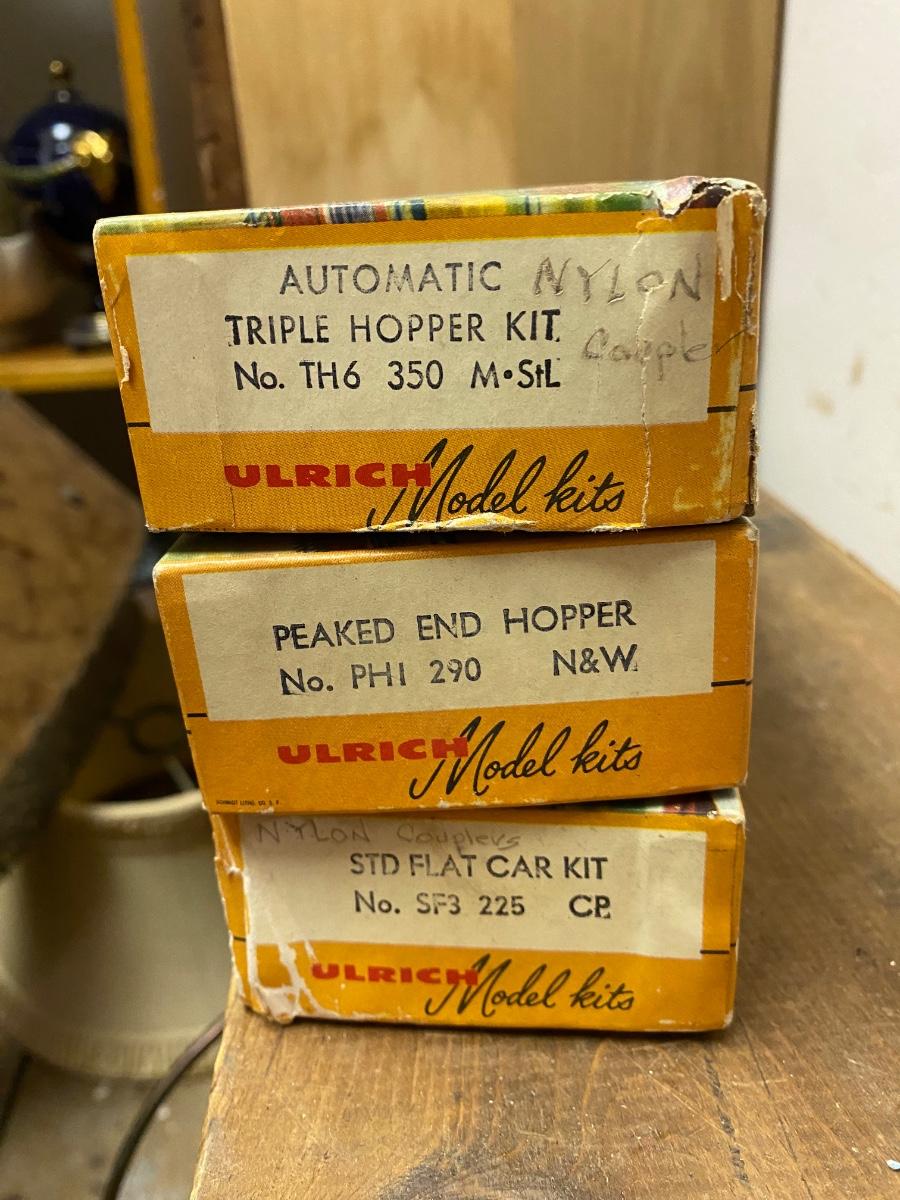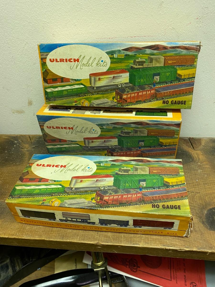 Boxed group of 3 Ulrich model kits. Trains are in varying condition as shown in photographs. HO Scale.