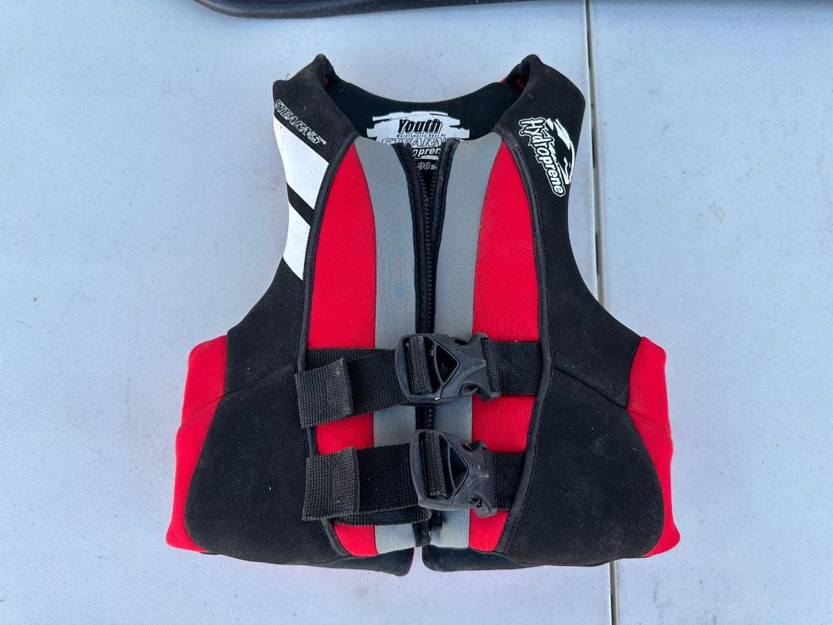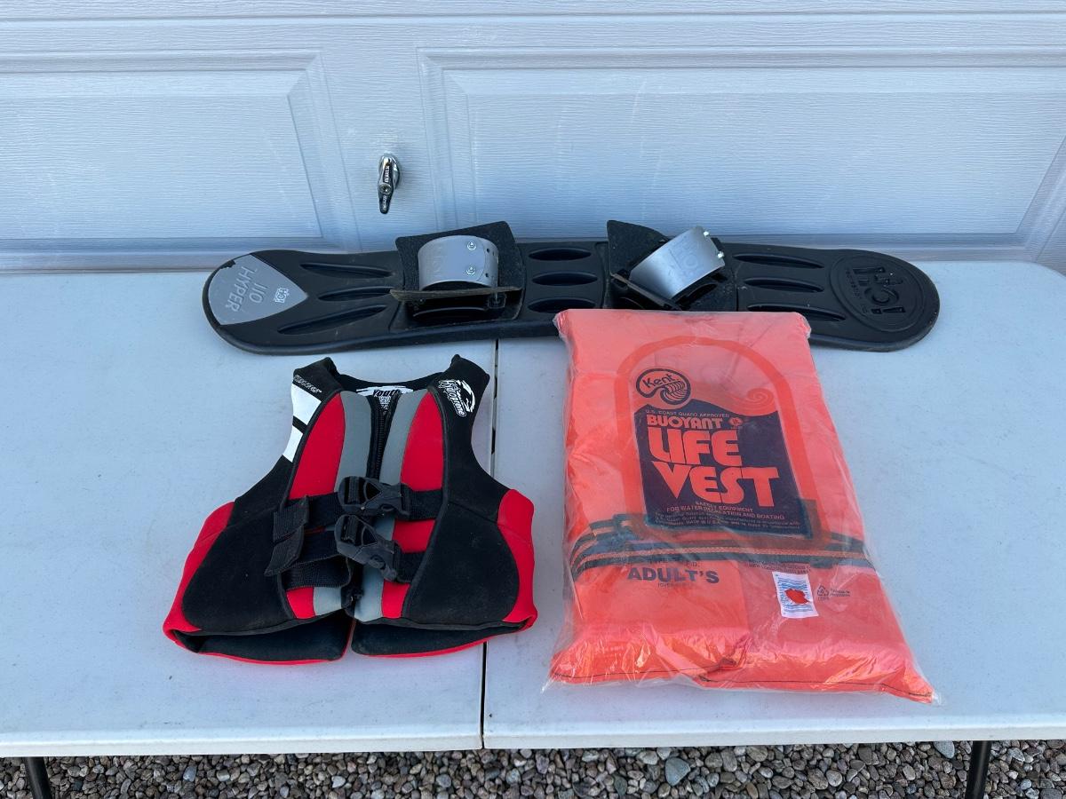 HO! SPORTS WAKEBOARD AND 2 YOUTH LIFE VESTS