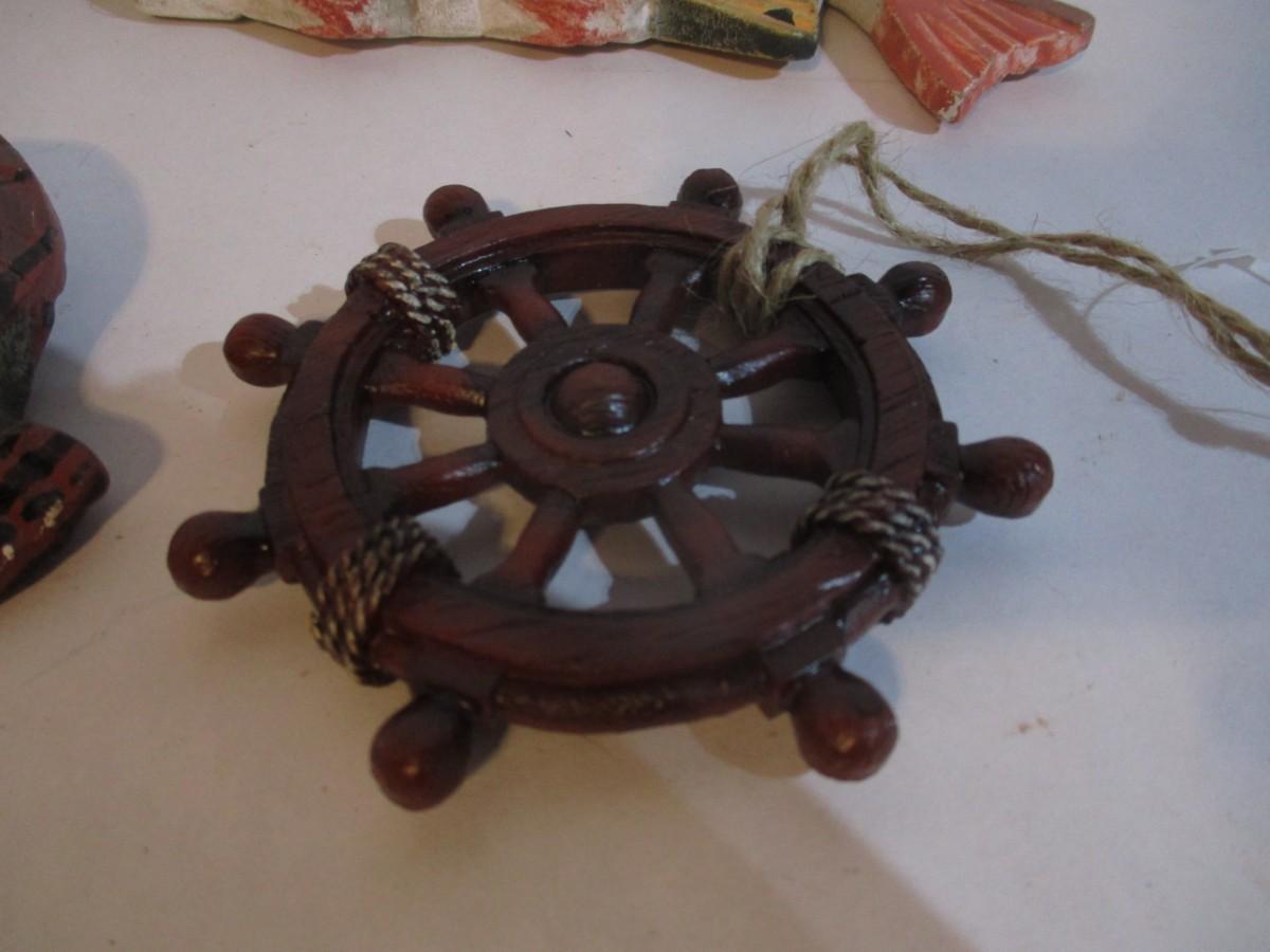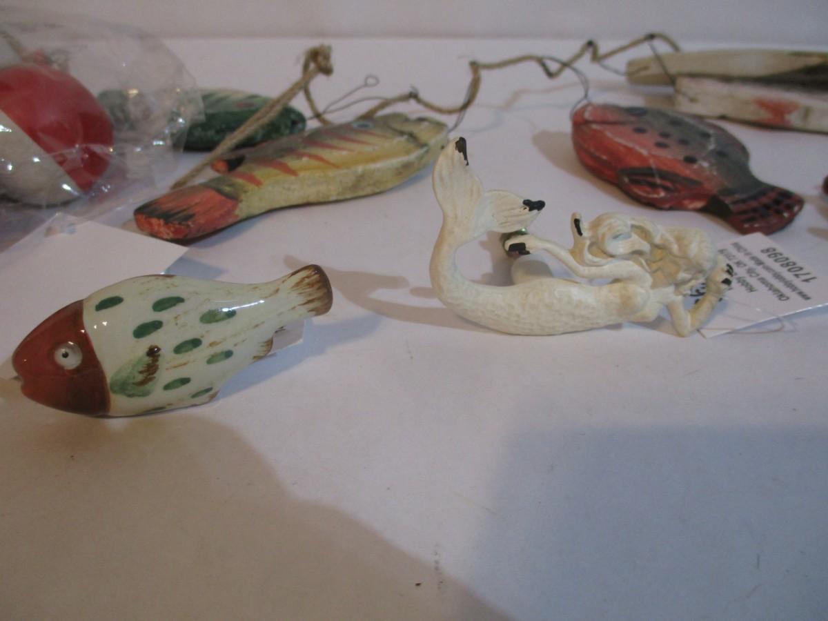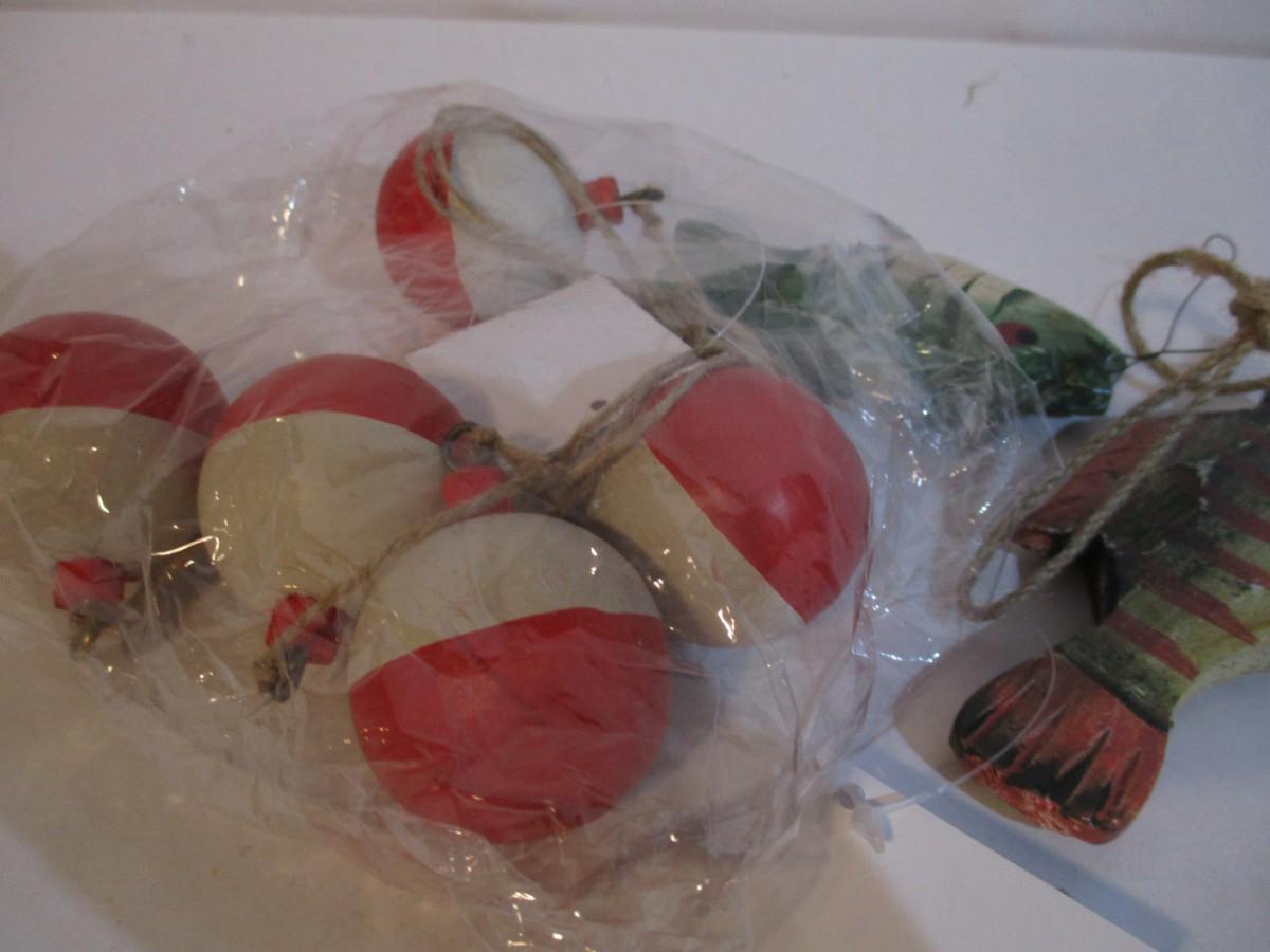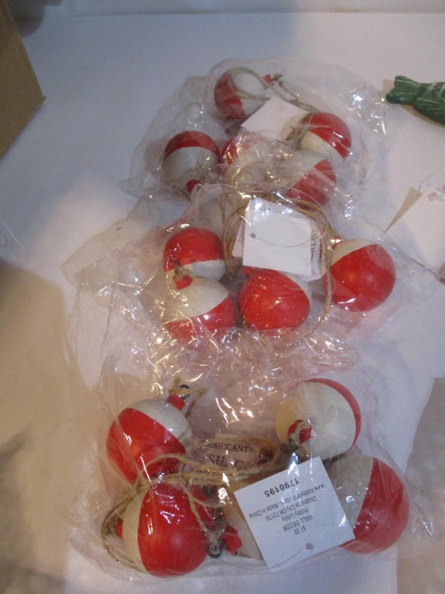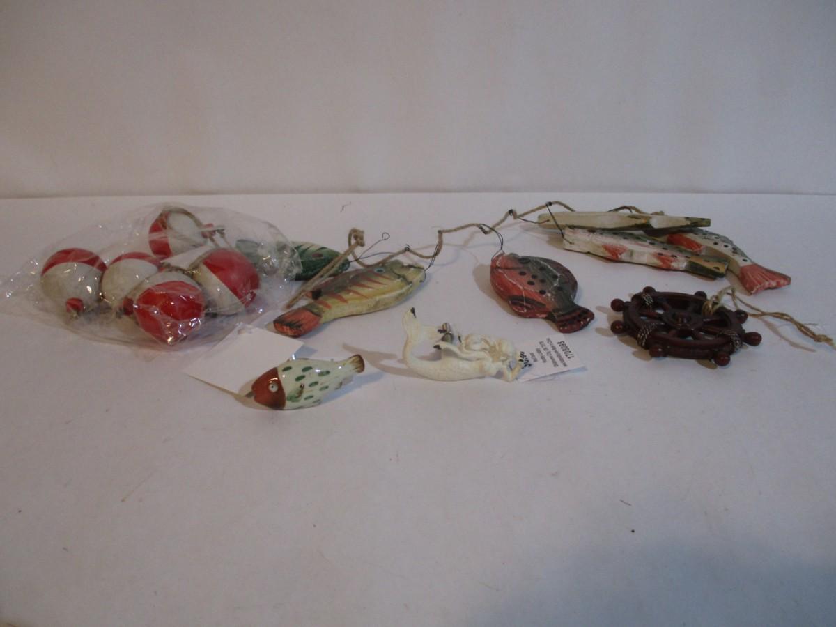 15 bobbers, 3 fish strings, 6 wheels, 5 fish,
