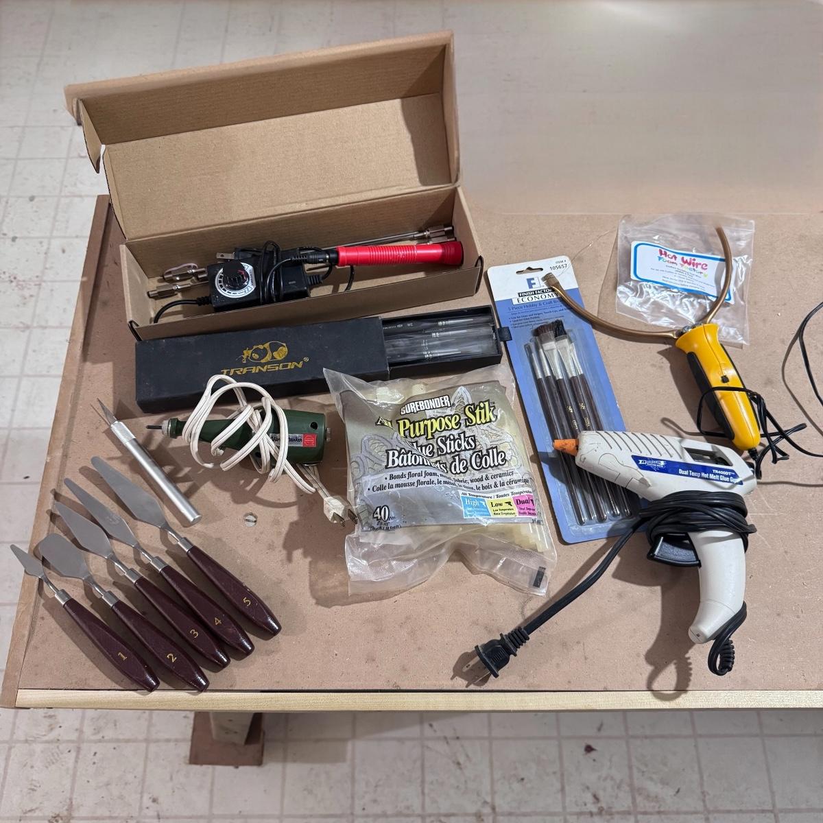 This lot includes one wooden burning engraver, one small foam cutter, one Hotwire foam cutter, hot glue gun, and more. You’ll also find a set of five panting knives, glue sticks, paint brushes from Transon, an AC/DC Adapter, and a Burgess Vibro-Maker. The Burgess vibro-maker powered on when plugged in. The other items were not tested. Shipping available.