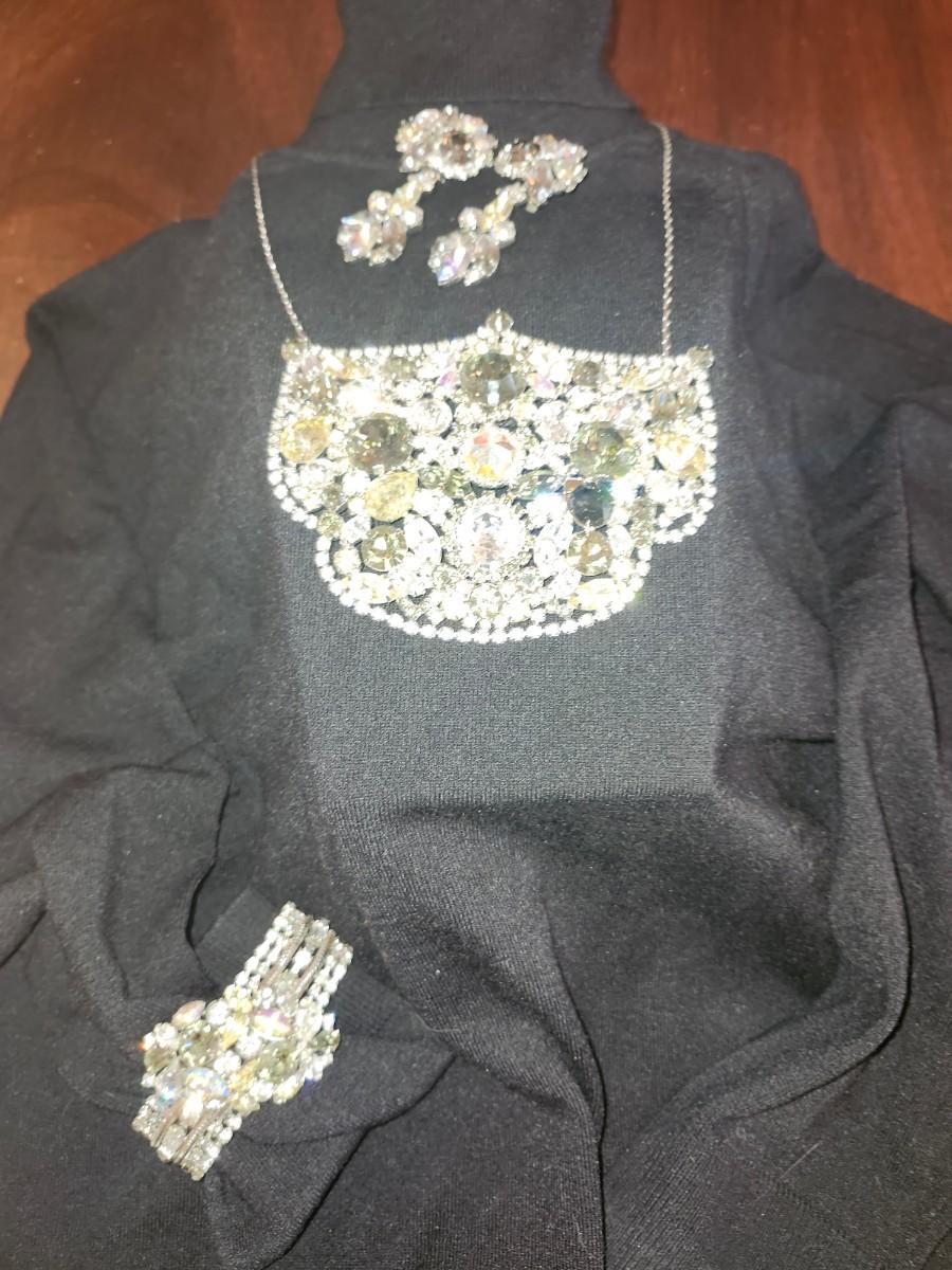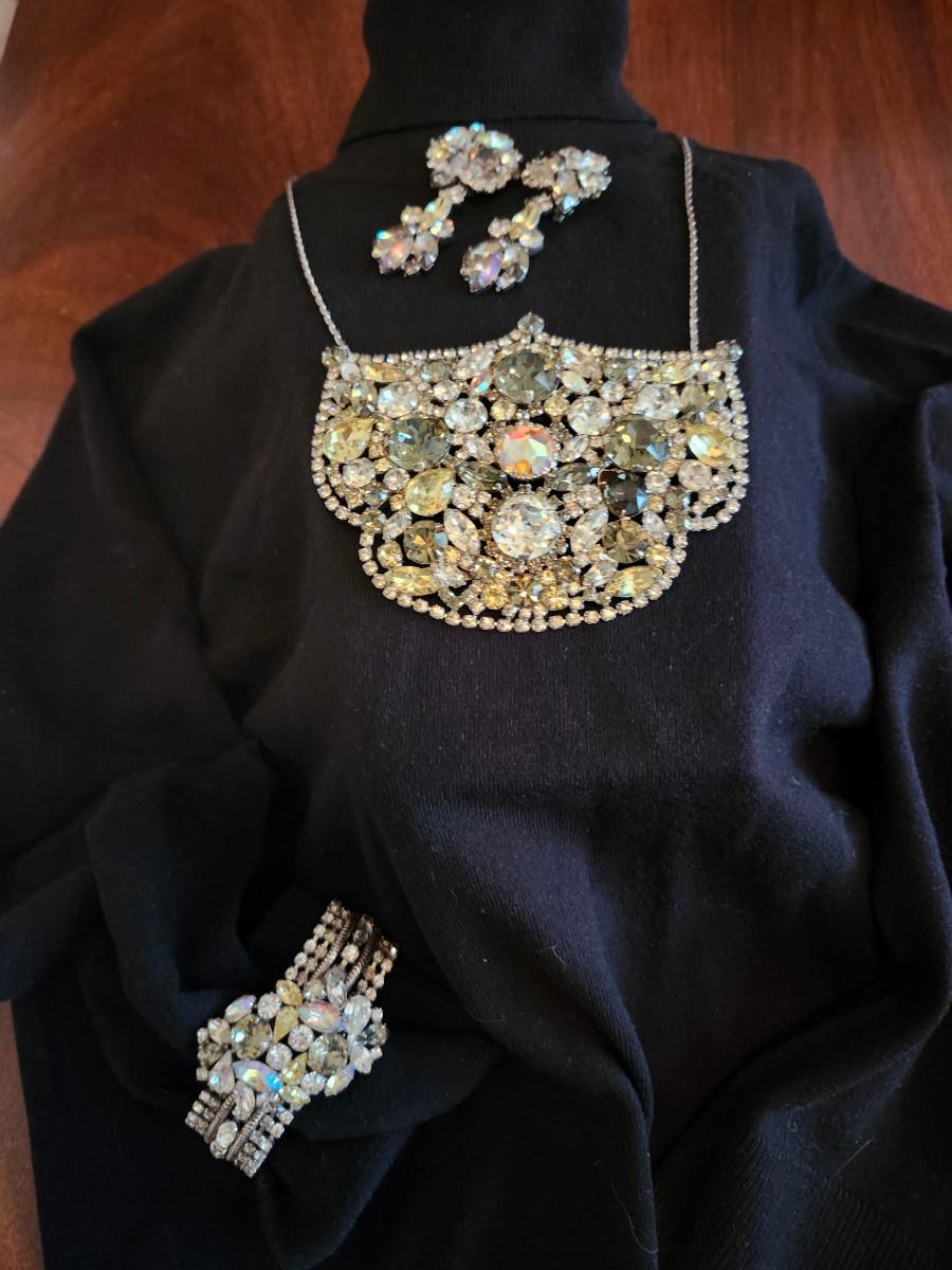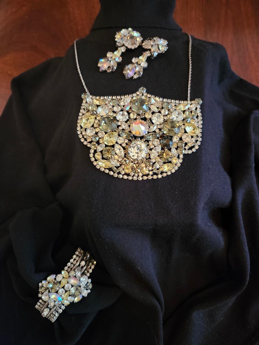 Demi Purure Suite of Jewelry. This is a classic vintage suite, with the rhinestone colors of yellow, clear, and soft green. The bib is the centerpiece, with added flair from the clip earrings and splendid bracelet. Retail on this set is about $775.00 It's time for this lovely set to come out of the gift box and create smiles wherever you may go.
