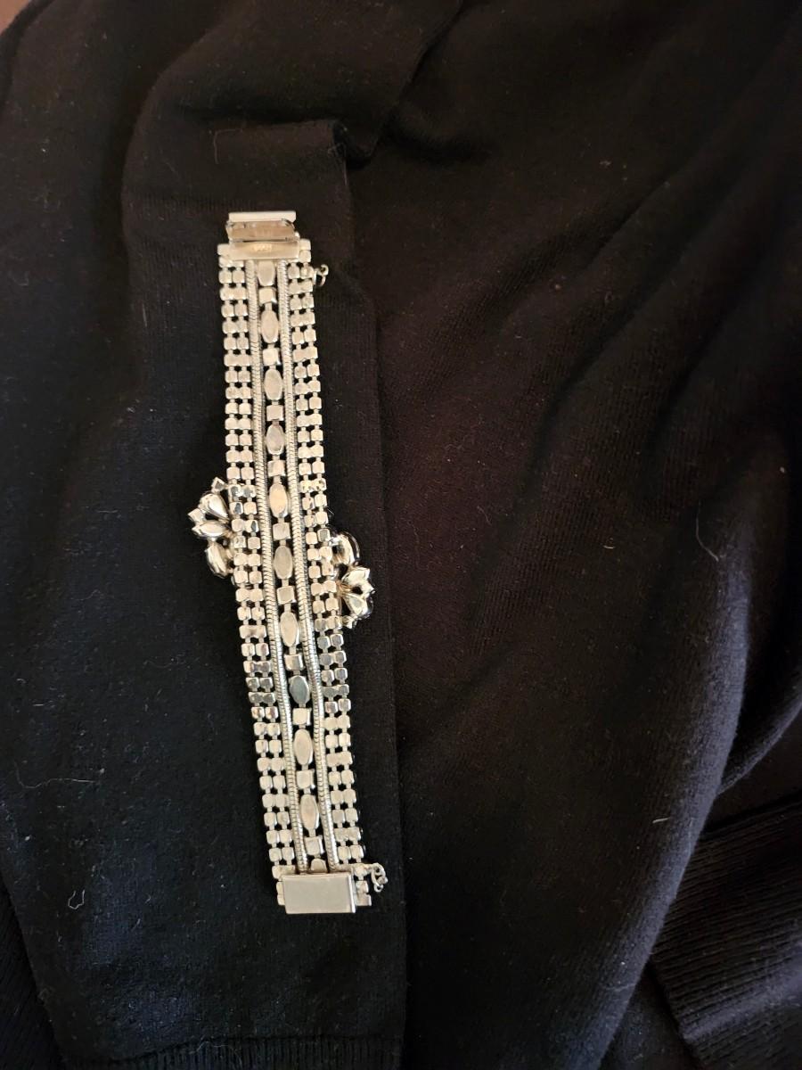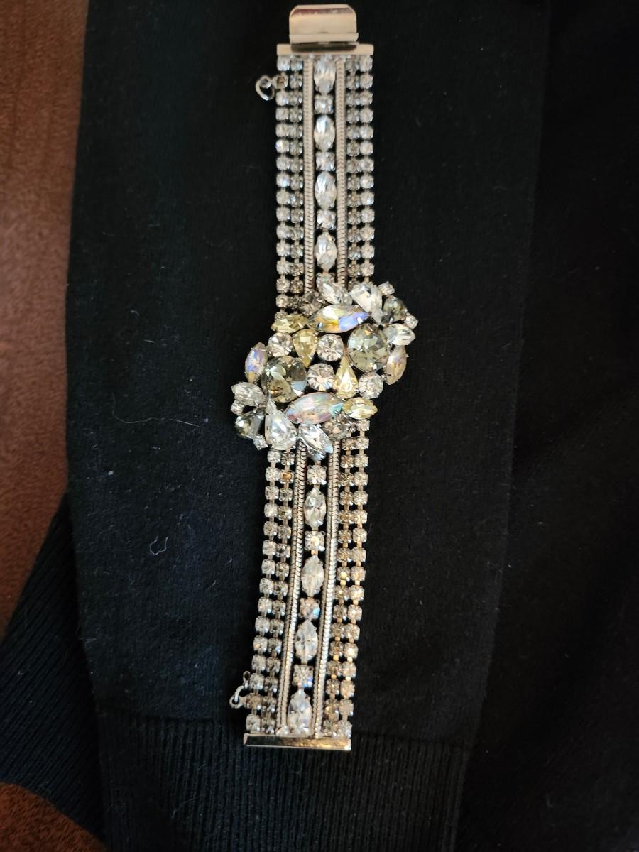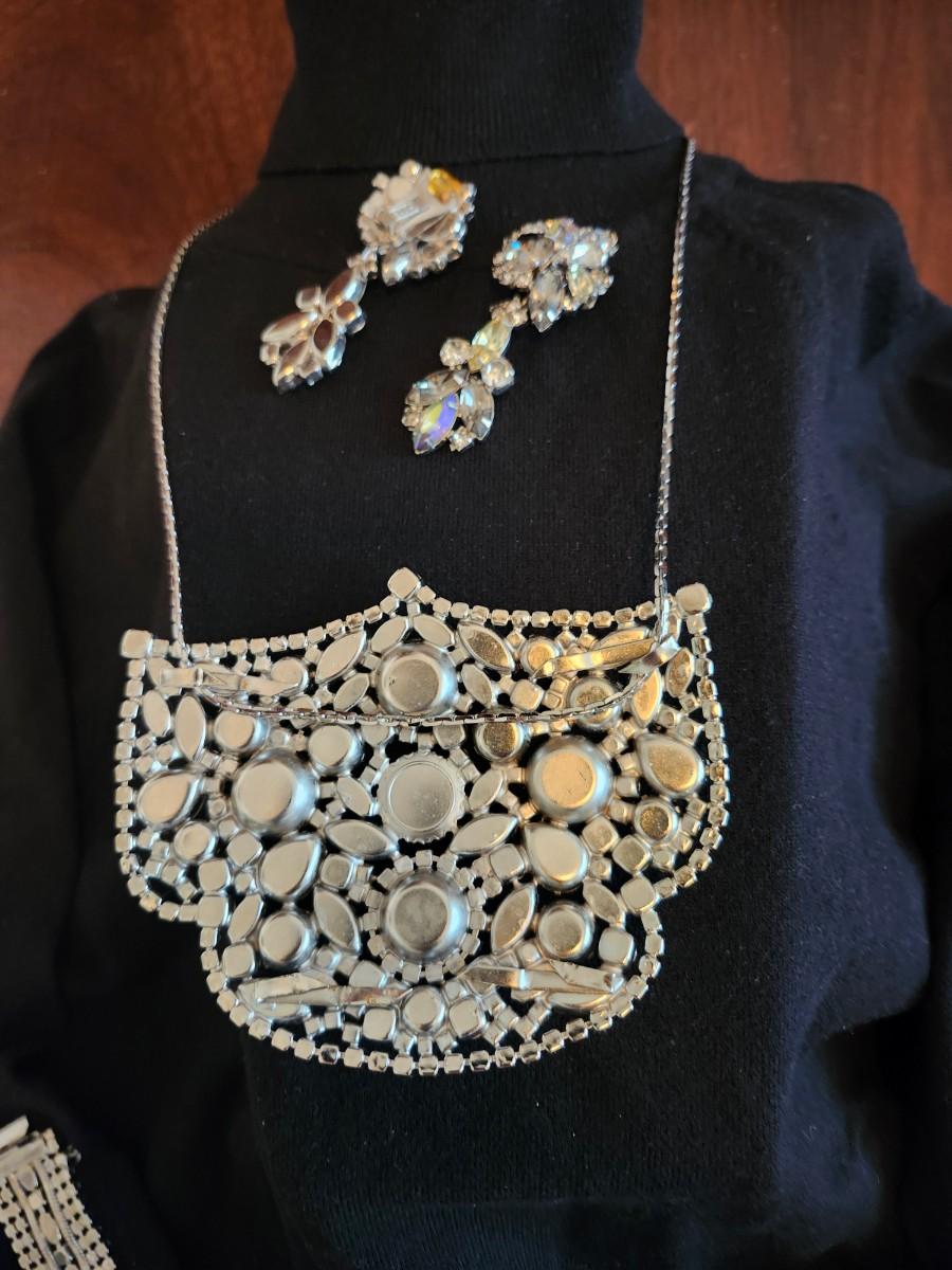 Demi Purure Suite of Jewelry. This is a classic vintage suite, with the rhinestone colors of yellow, clear, and soft green. The bib is the centerpiece, with added flair from the clip earrings and splendid bracelet. Retail on this set is about $775.00 It's time for this lovely set to come out of the gift box and create smiles wherever you may go.