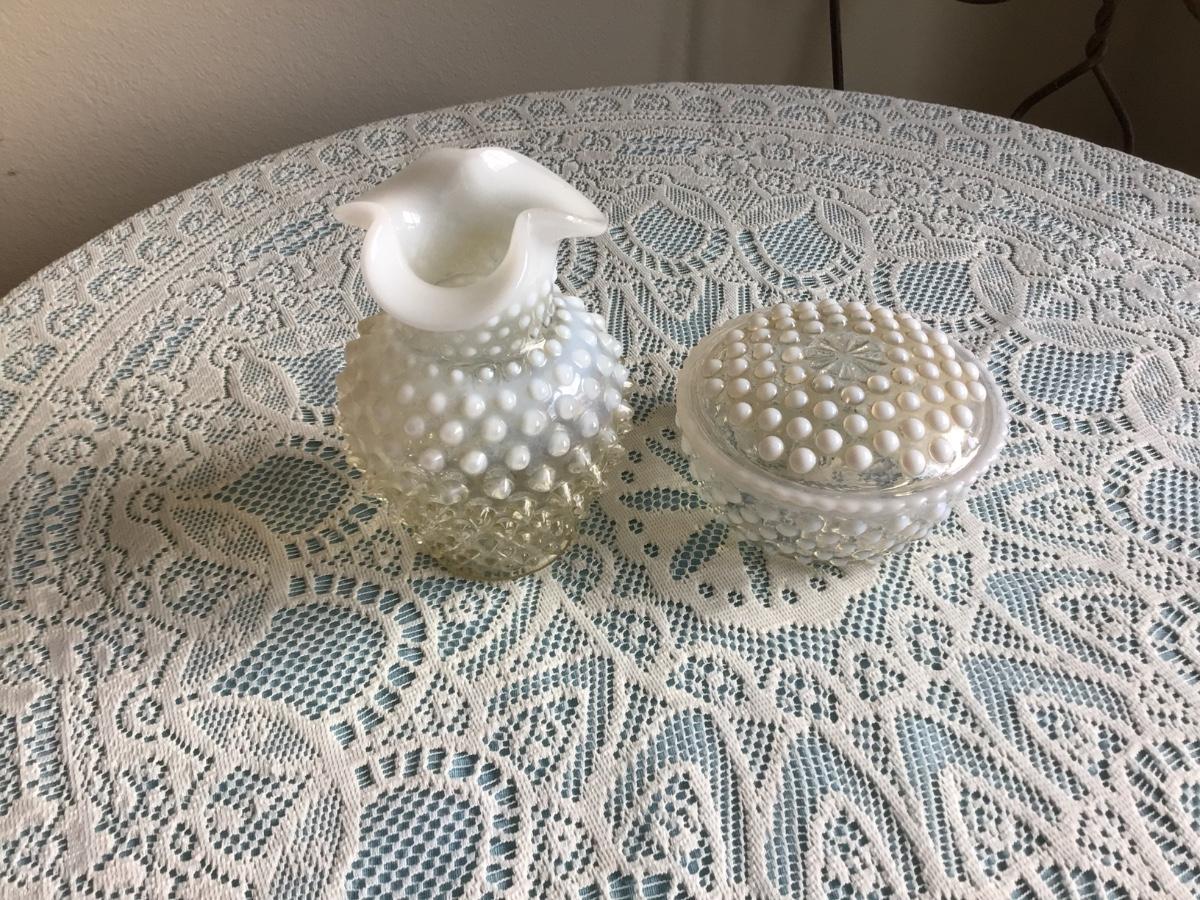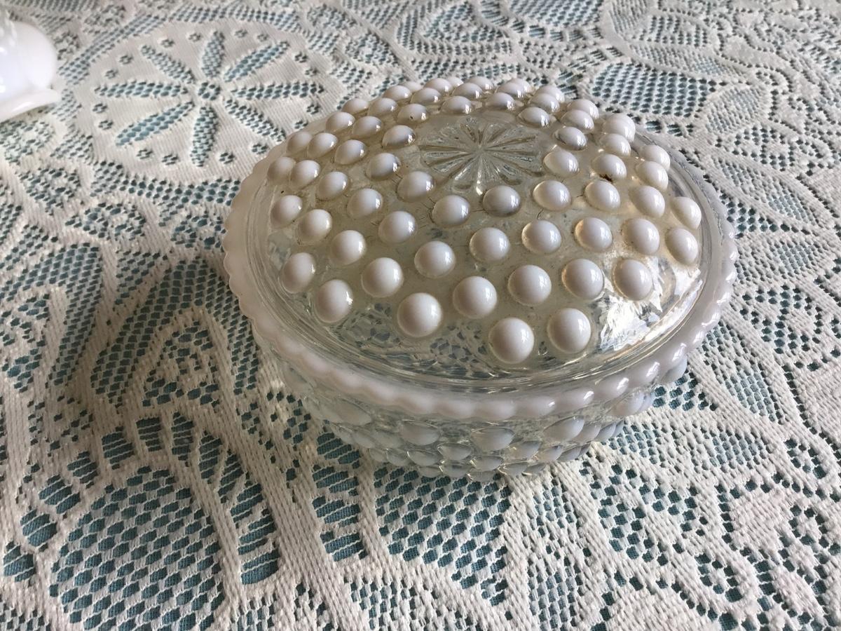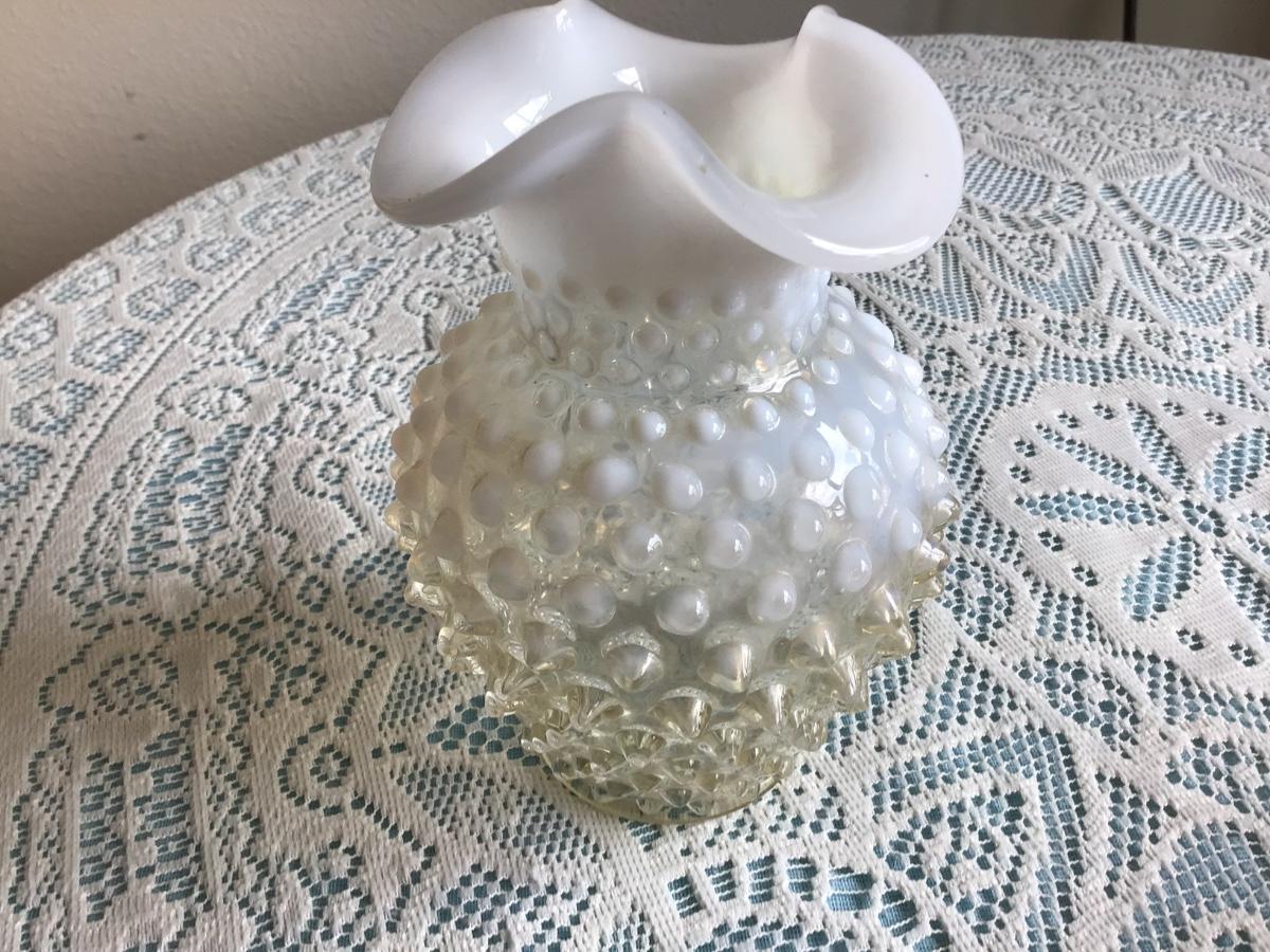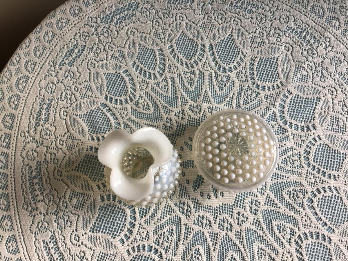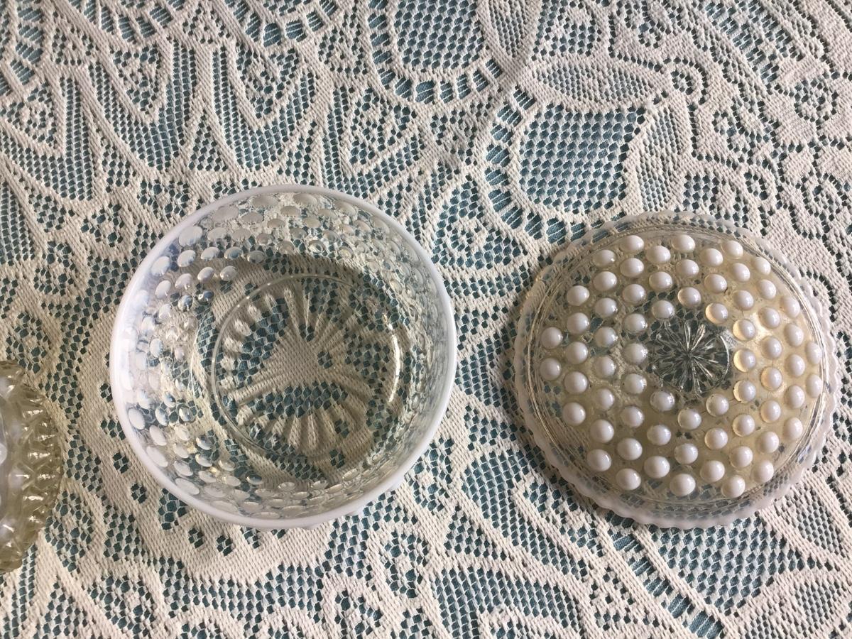This is a great lot you get a small hobnail ruffled iridescent vase and a hobnail iridescent covered dish.