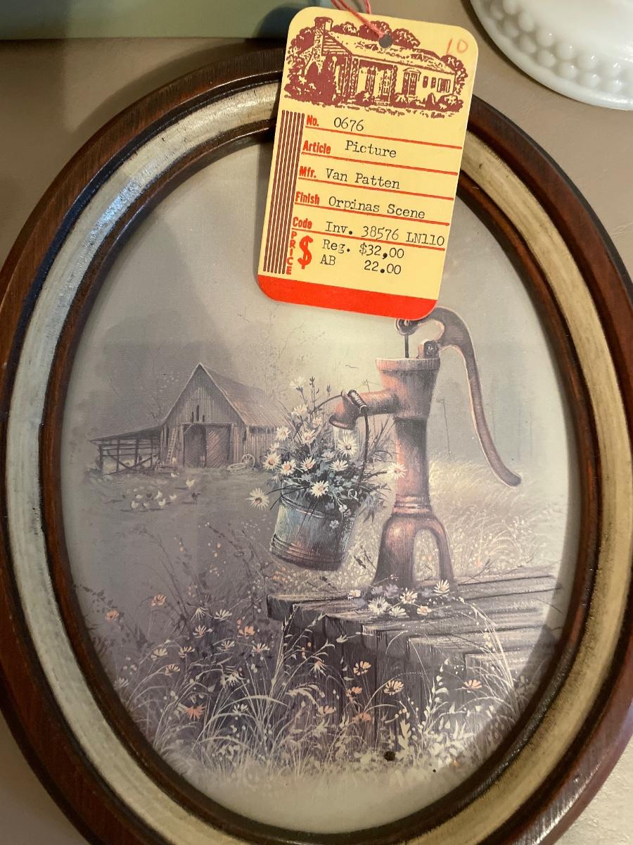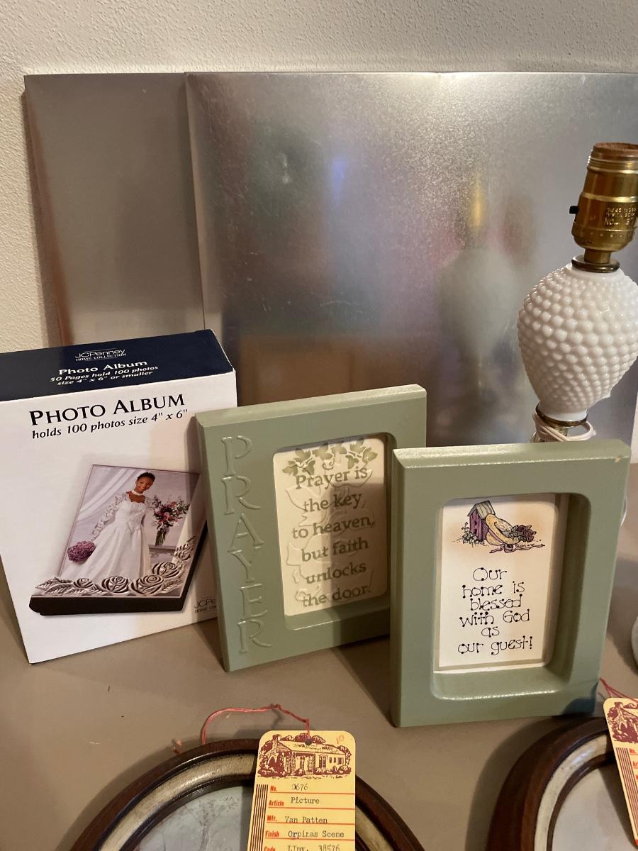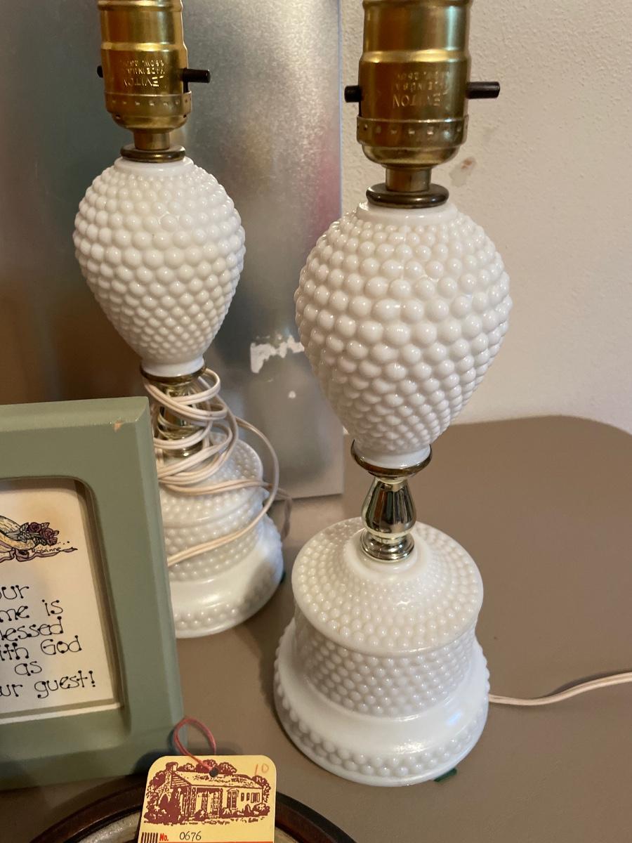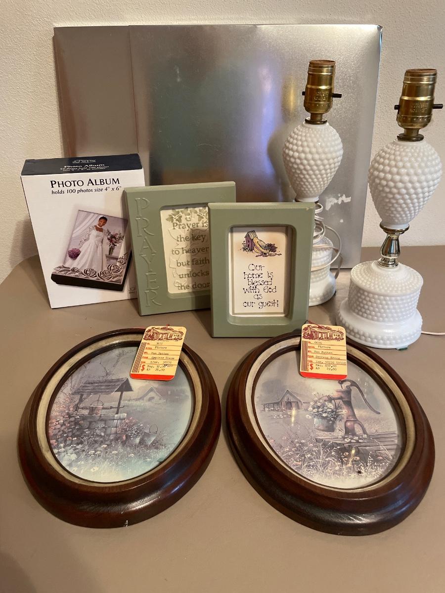 Hobnail milk glass lamps, vtg pictures, magnet boards, frames