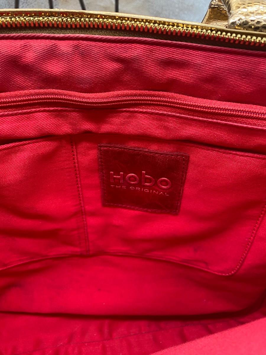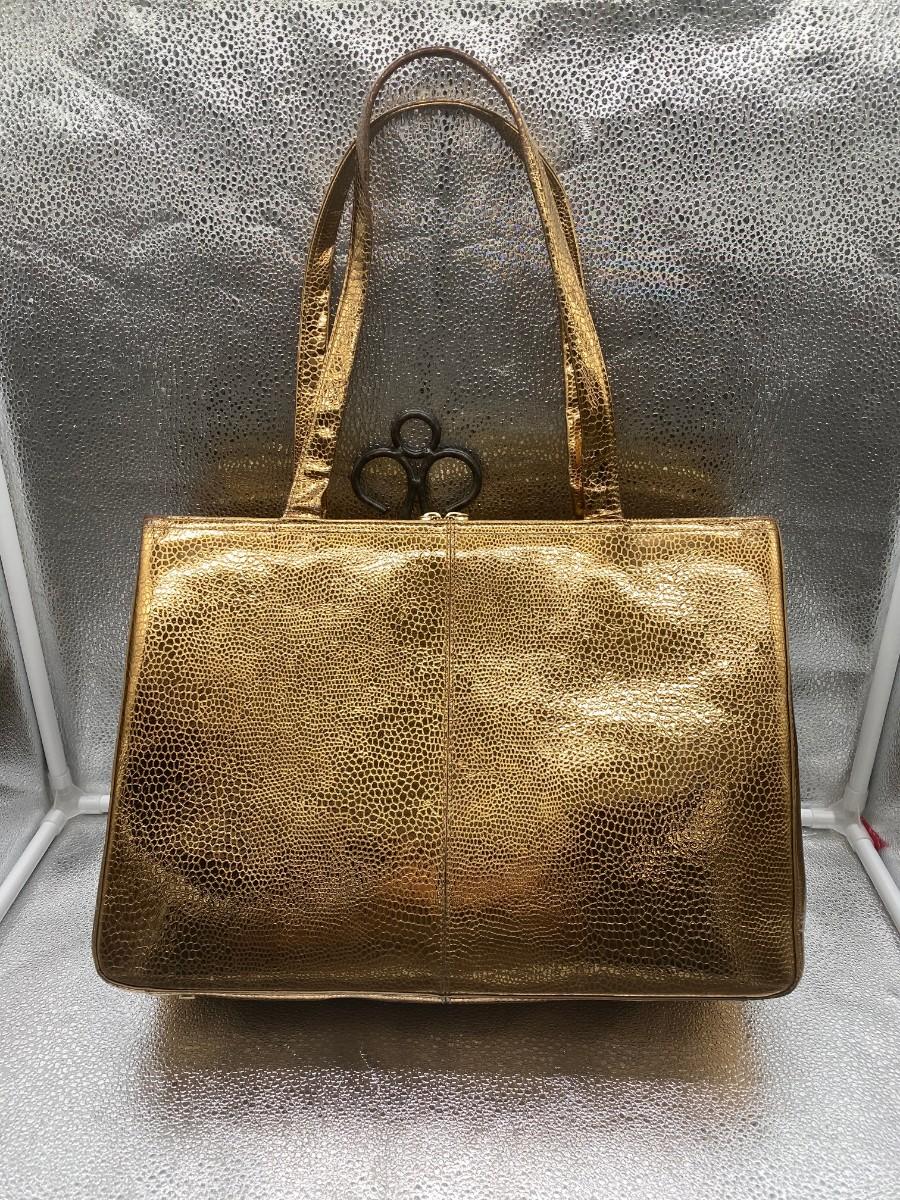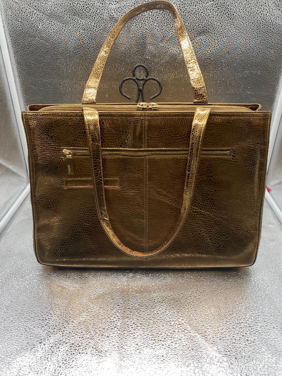 Goldtone pebbled leather, red interior, 1 exterior zipper pocket.