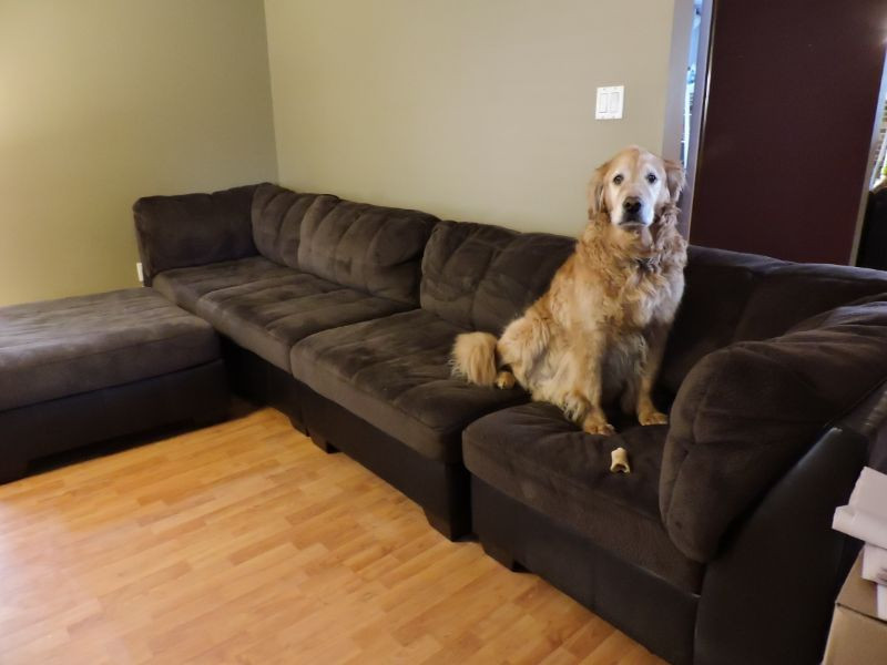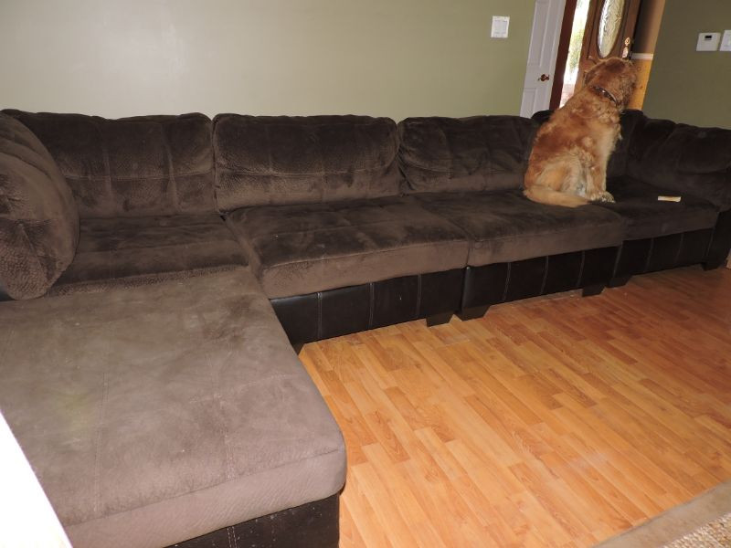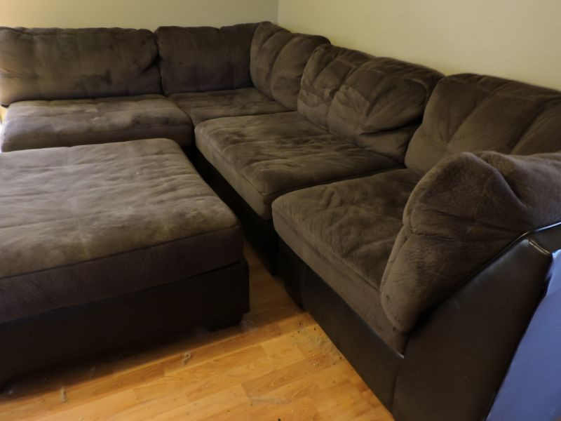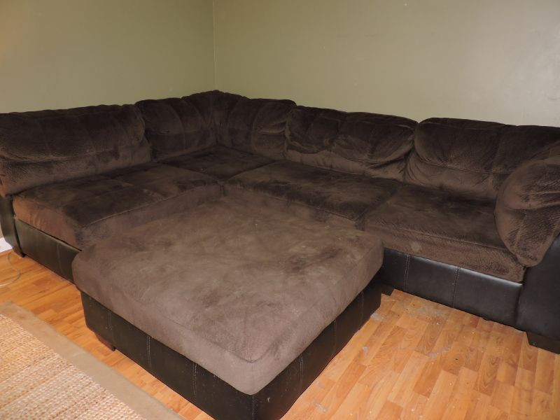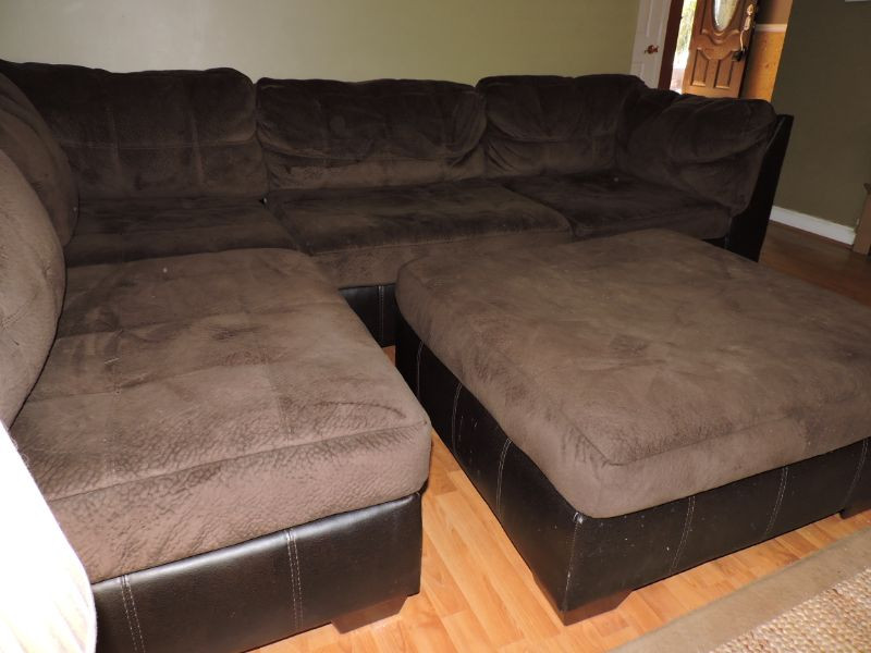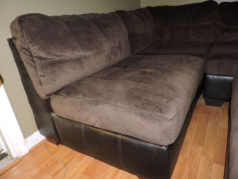 Beautiful sectional set by Ashley furniture. Chocolate microfiber on cushions with faux leather base. Can be arranged in a variety of ways.