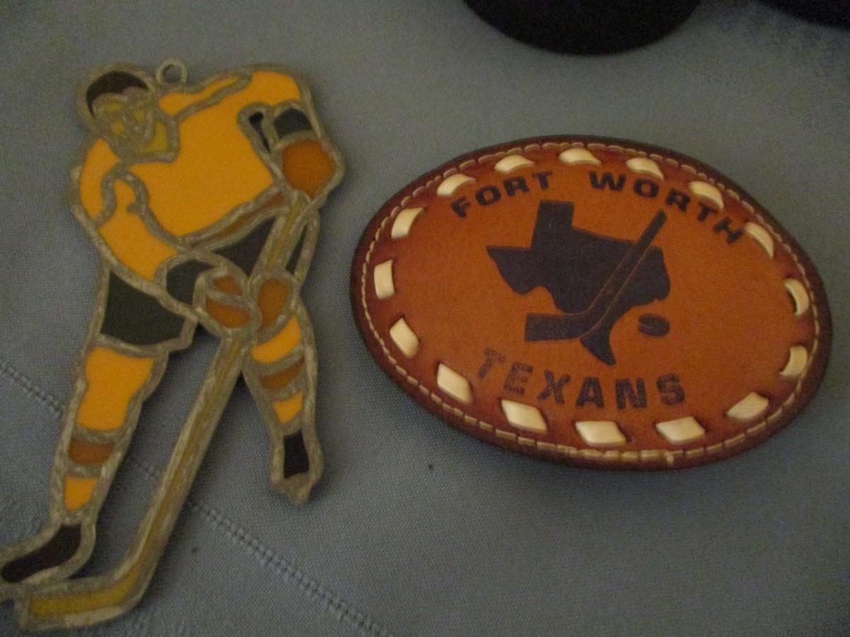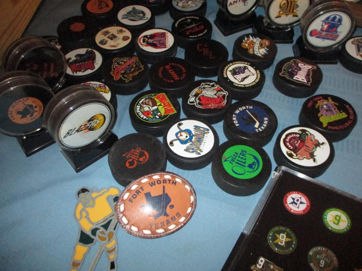 Hockey Pucks, 2 hockey sticks. Leather belt buckle.
