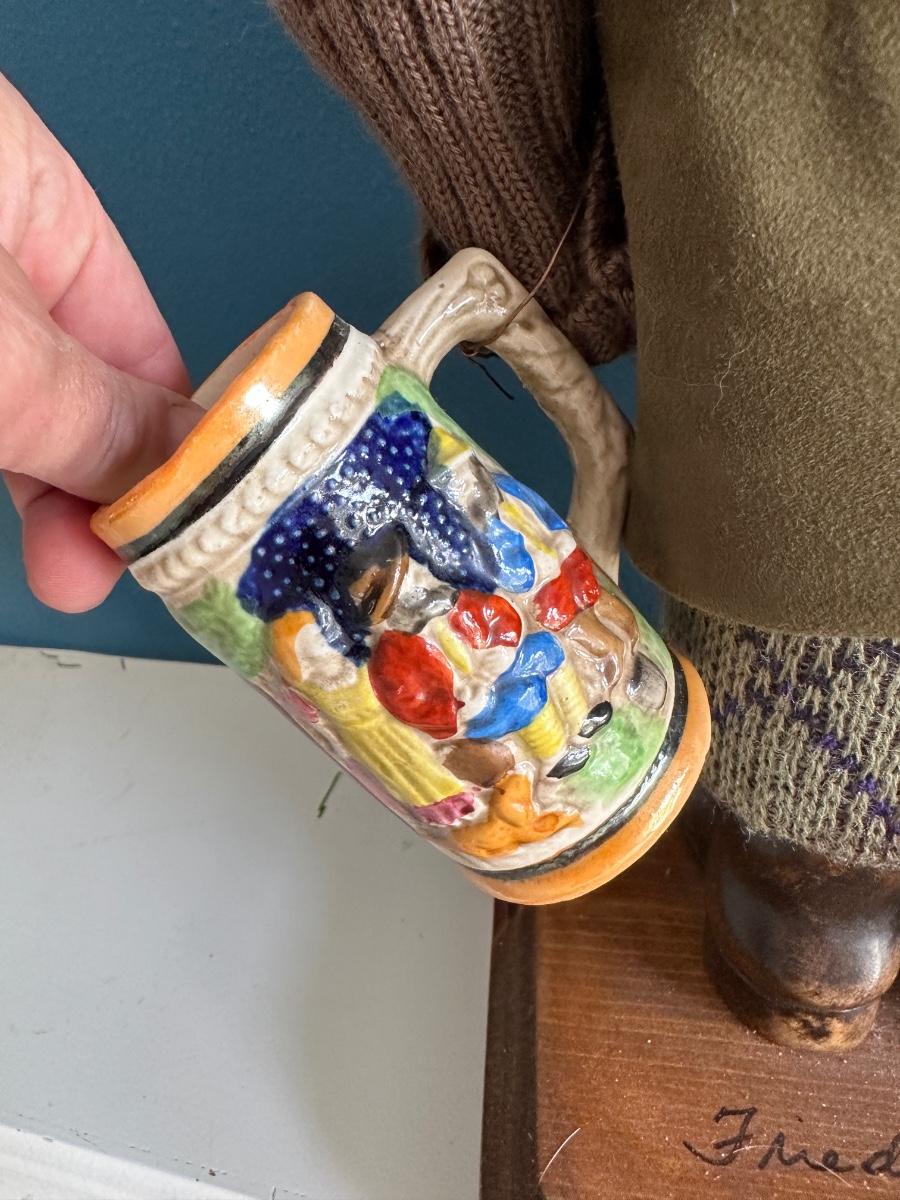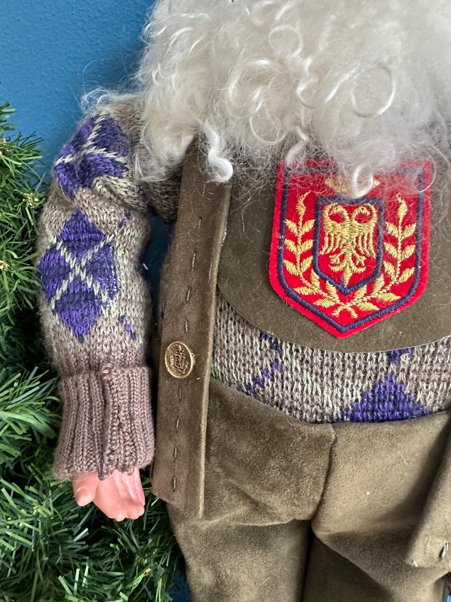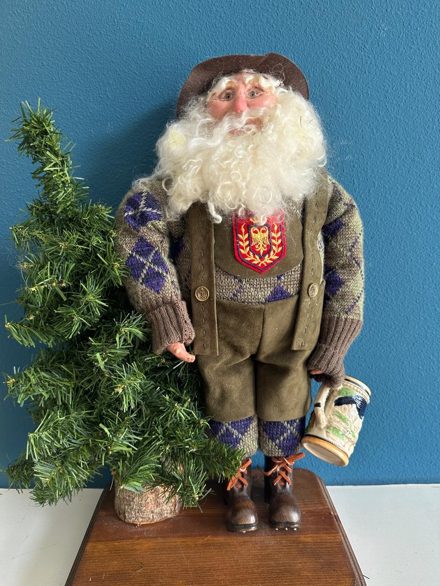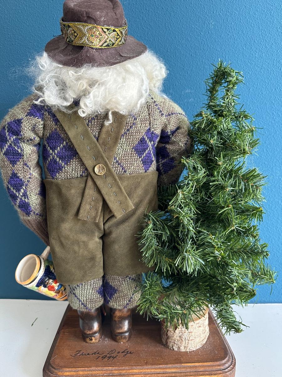 Dated 1994 Santa by Designer Frieda Dodge. He wears a sweater and has suade leader hossen pants. He sports wood shoes and carries a beer stein. He stands 22 inches