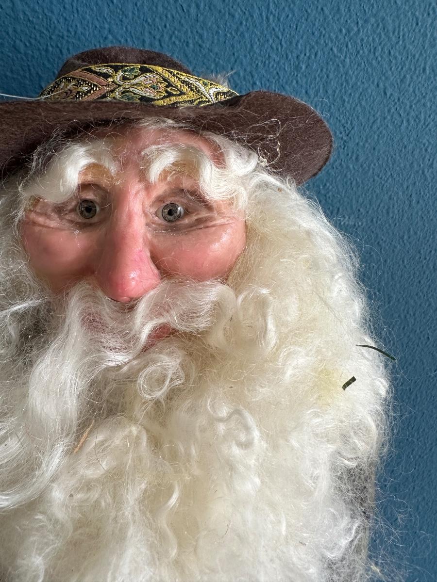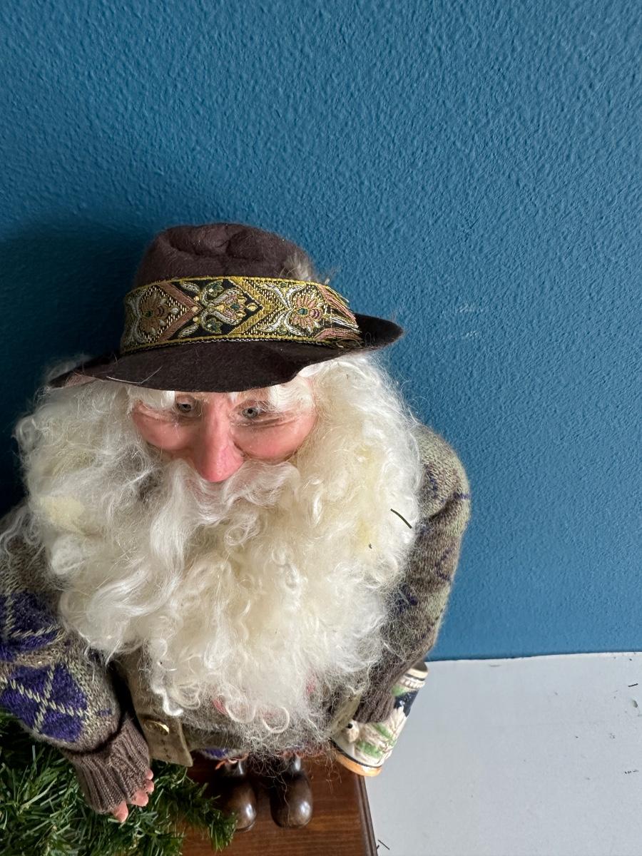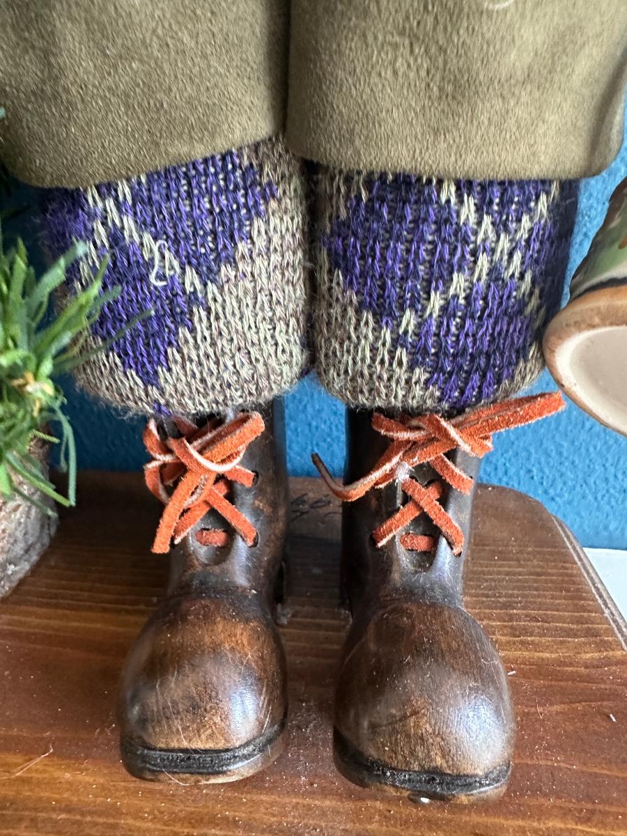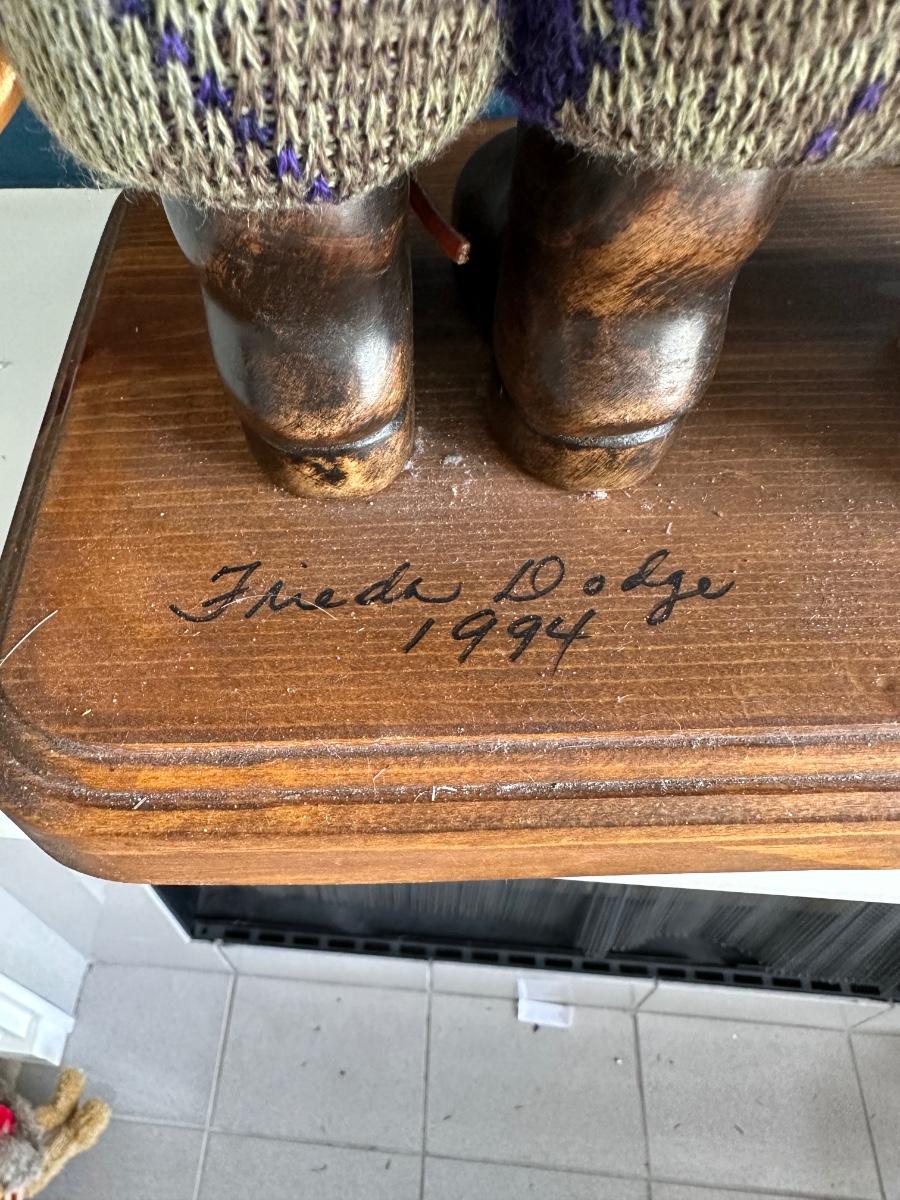 Dated 1994 Santa by Designer Frieda Dodge. He wears a sweater and has suade leader hossen pants. He sports wood shoes and carries a beer stein. He stands 22 inches