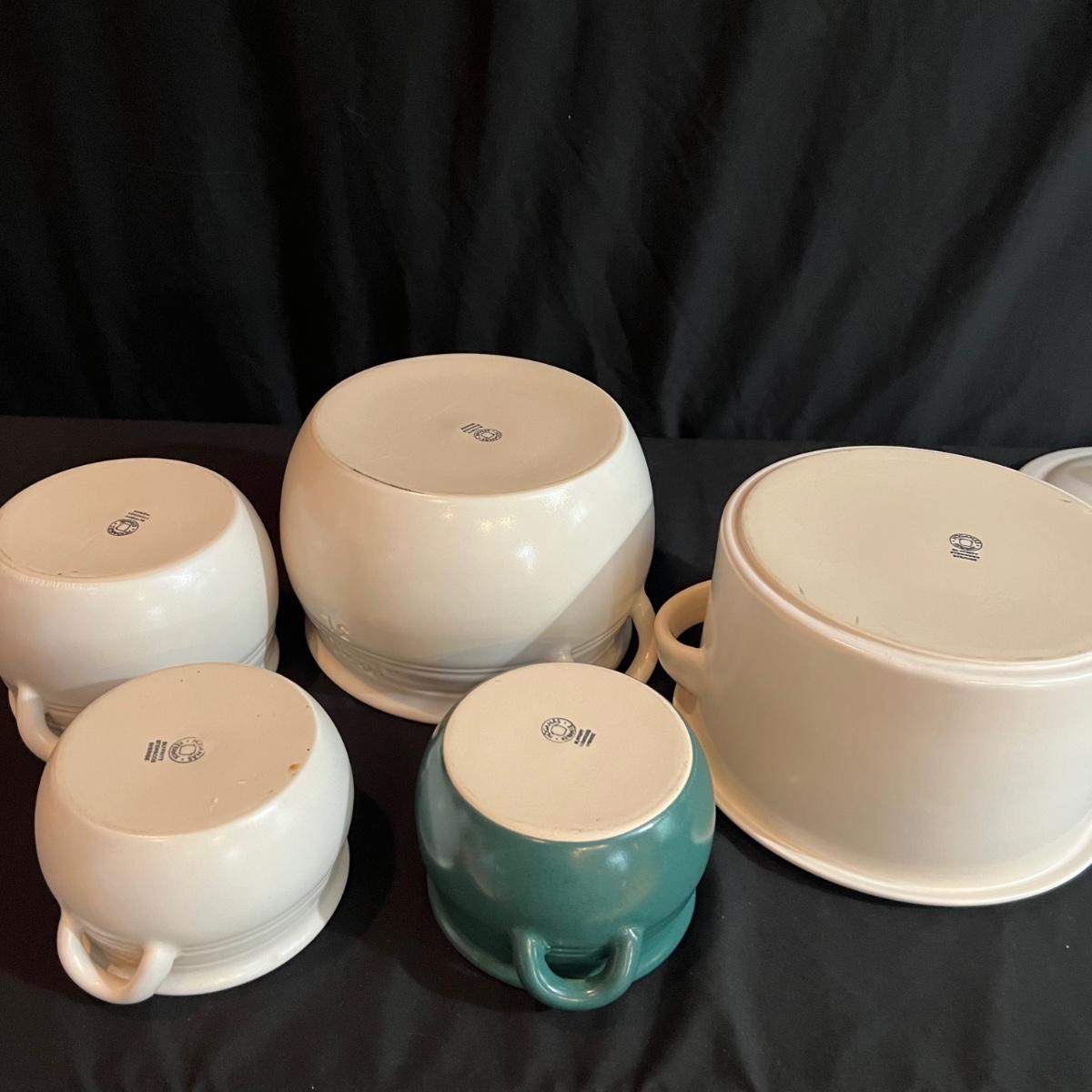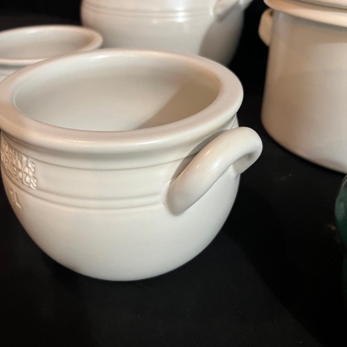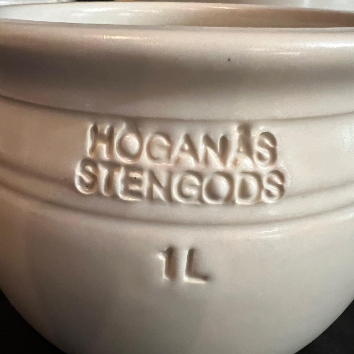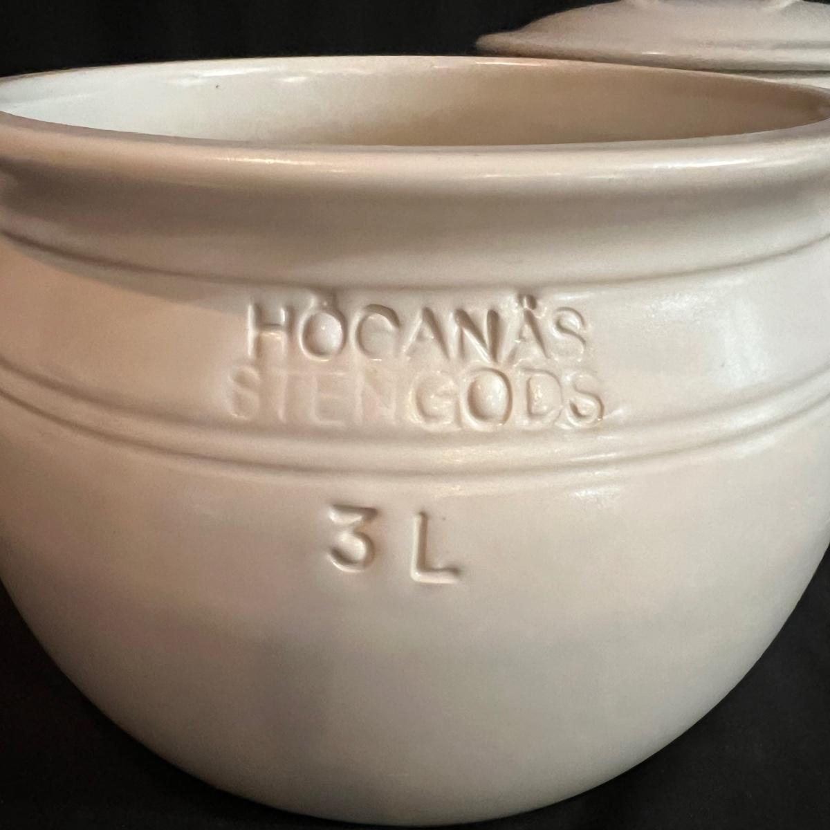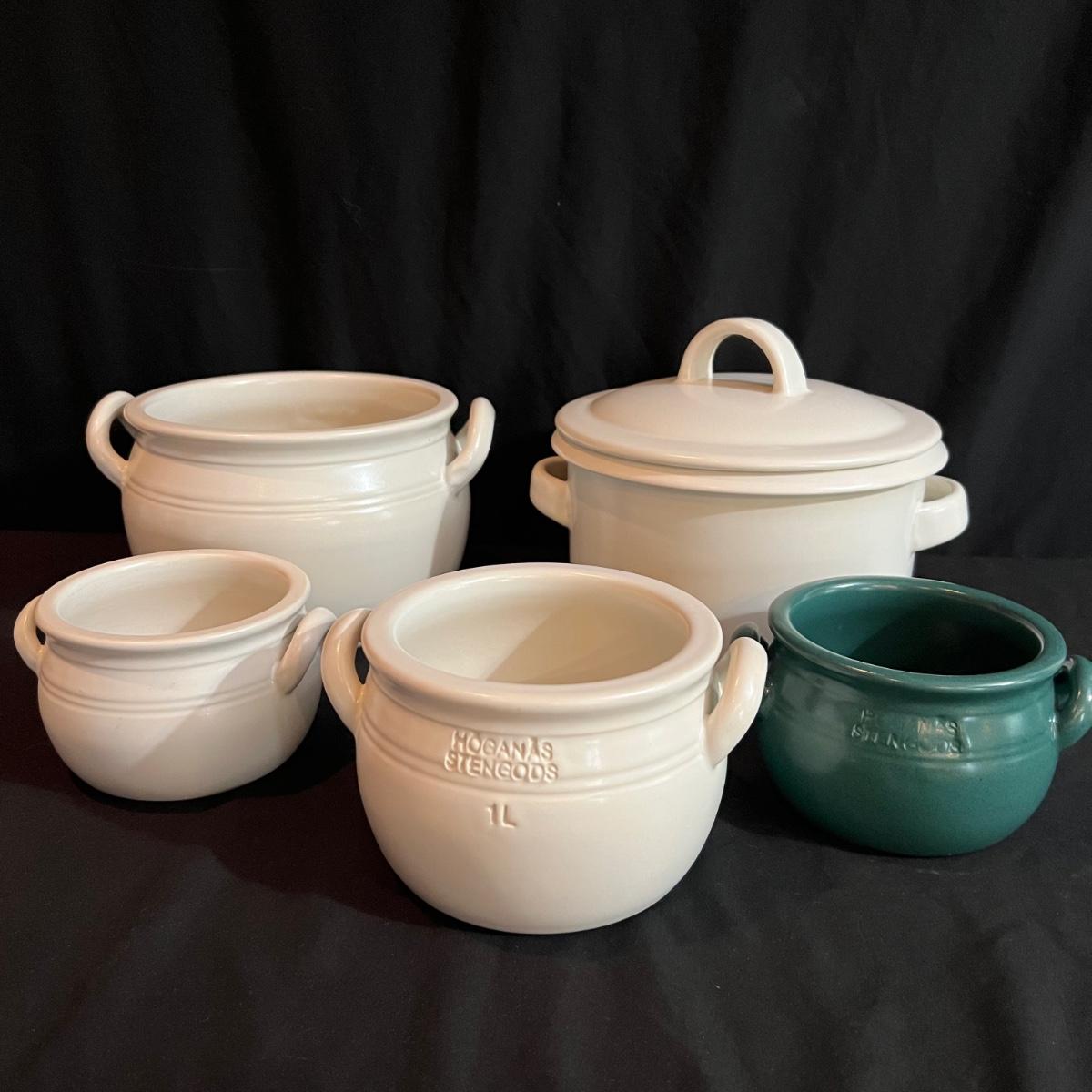 Five Höganäs ceramic crocks in this lot. The largest has a lid and it measures 8”D x 5”H.
