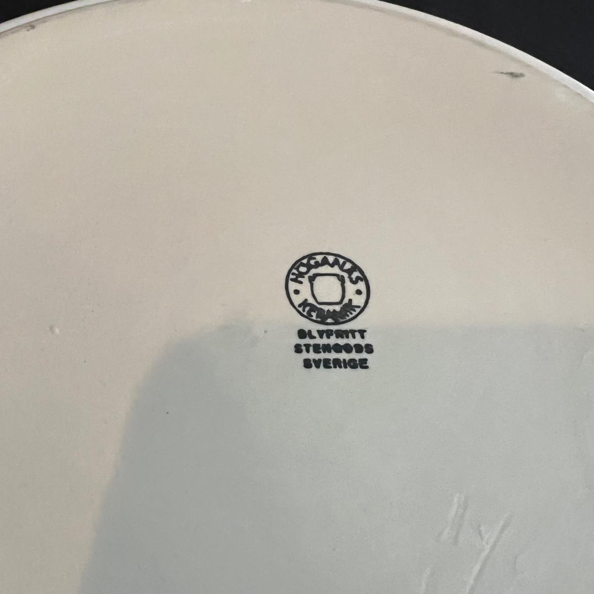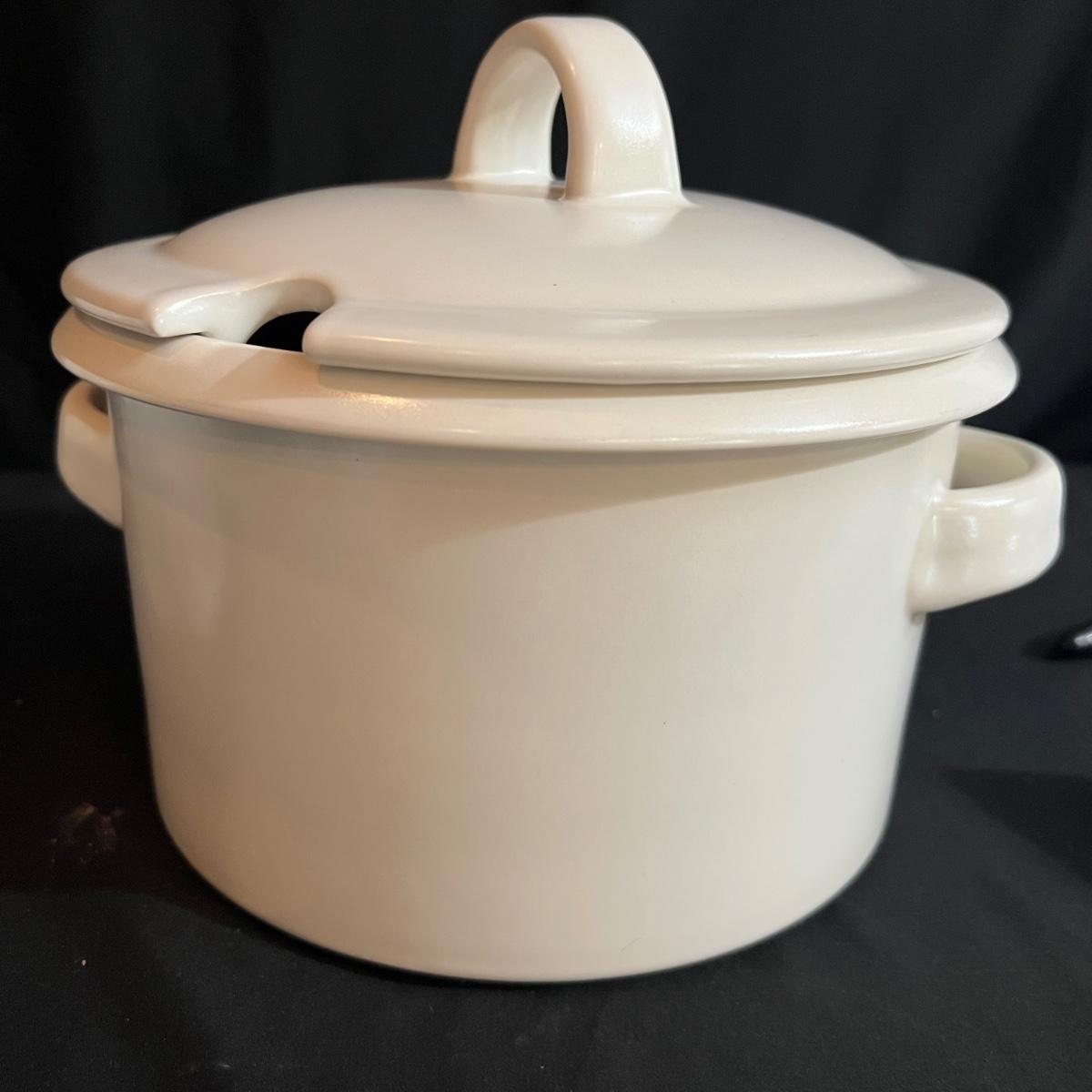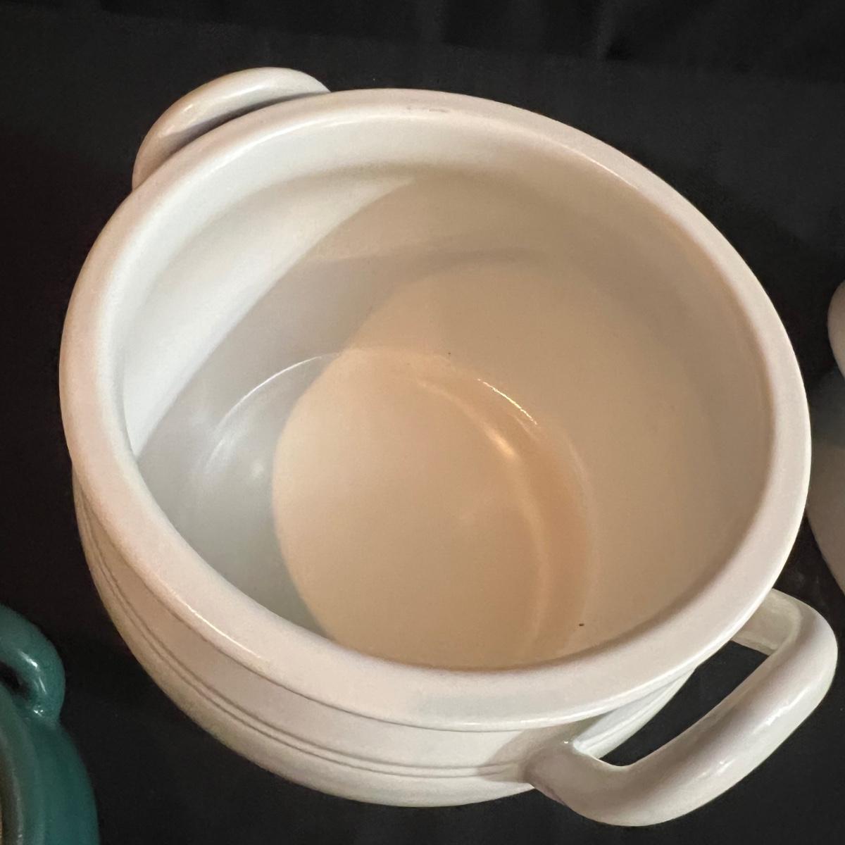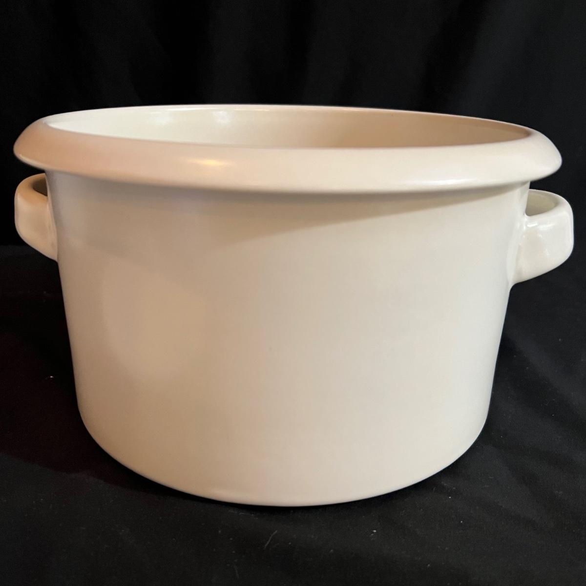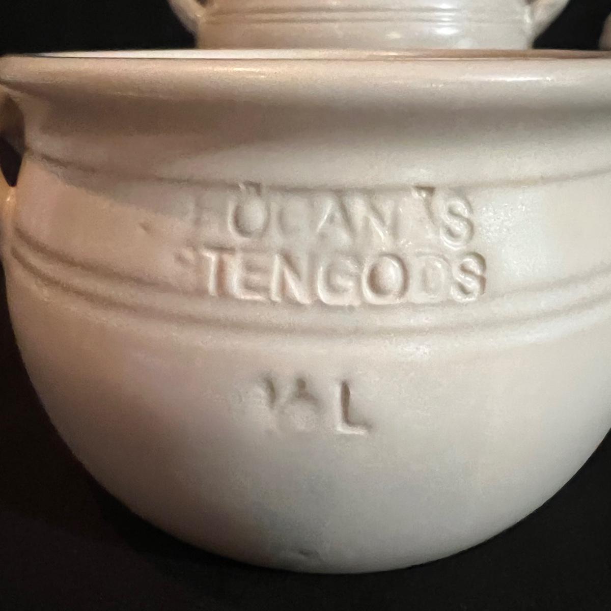 Five Höganäs ceramic crocks in this lot. The largest has a lid and it measures 8”D x 5”H.