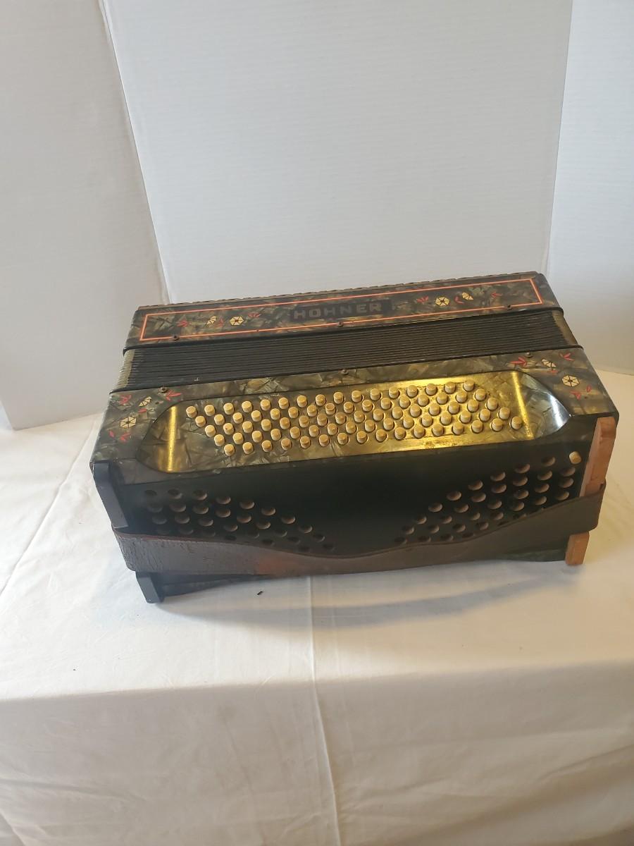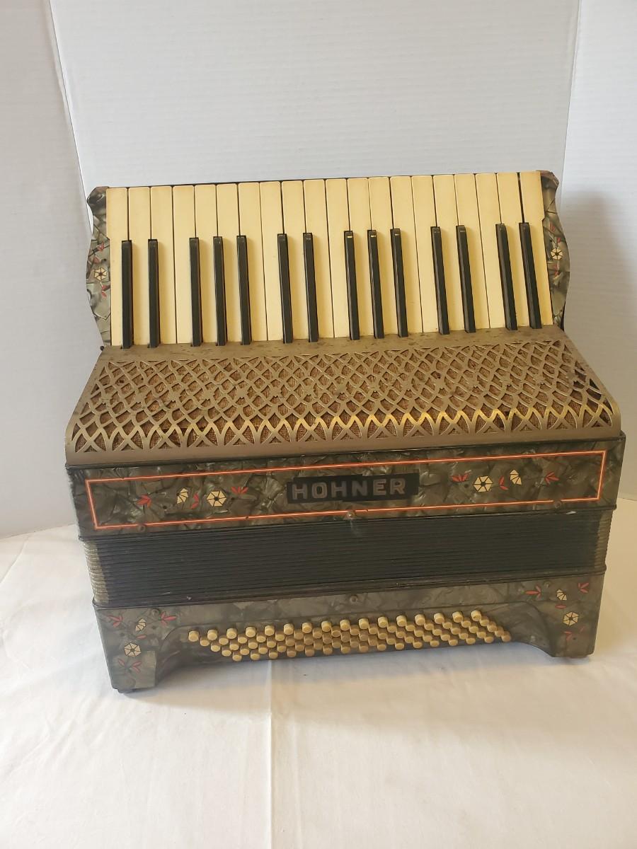 Hohner Accordion - Tango II German 80 base 34 key piano accordion, 1930's, in grey pearloid finish with diamante and floral inlaid decoration