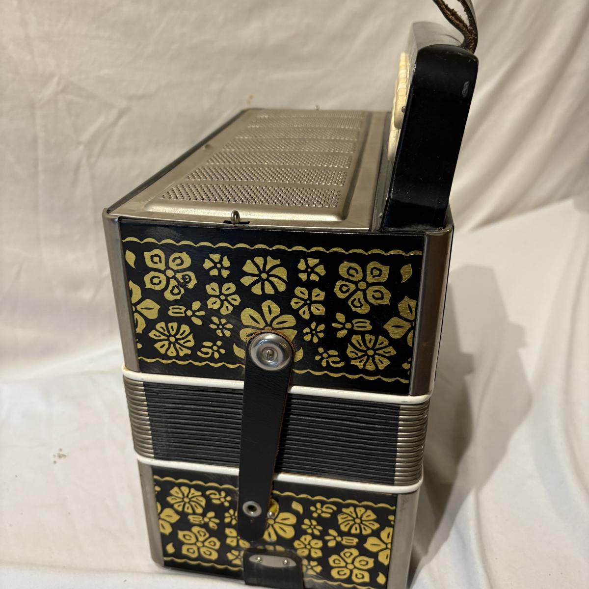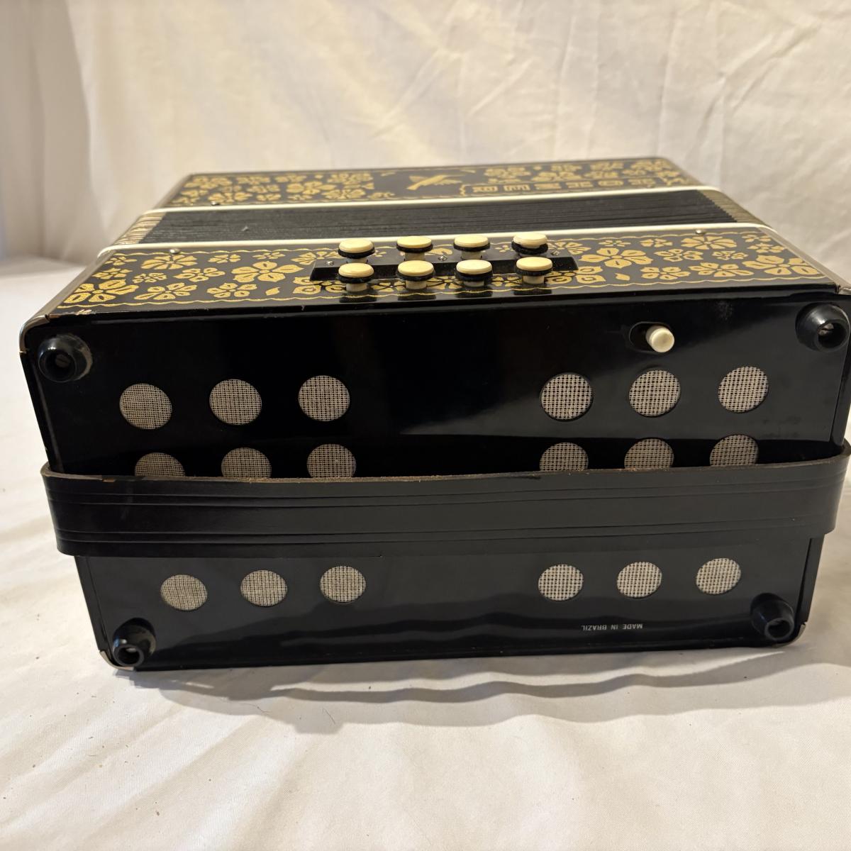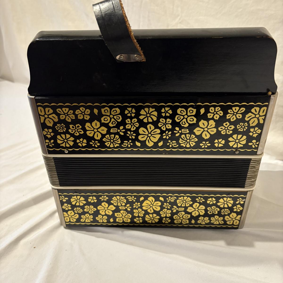 Gold and black button accordion is in excellent condition. 11” x 6” x 12”H.