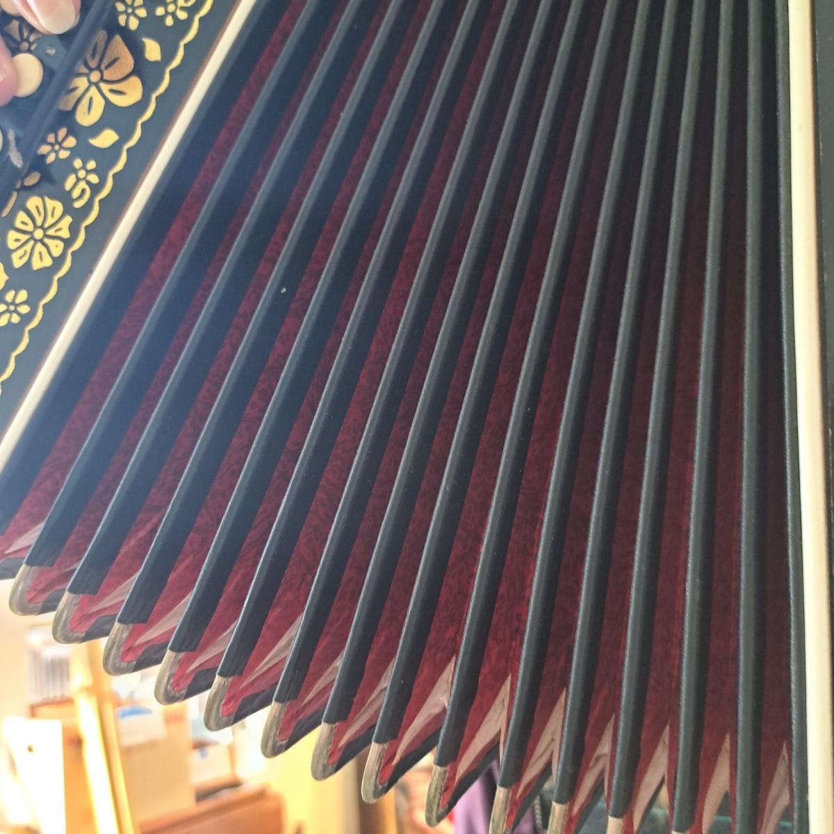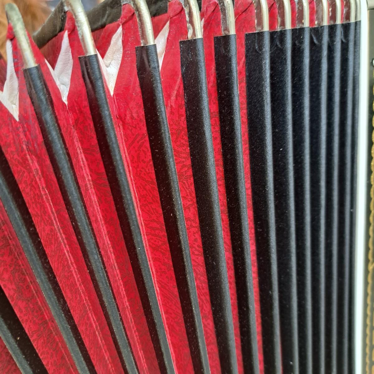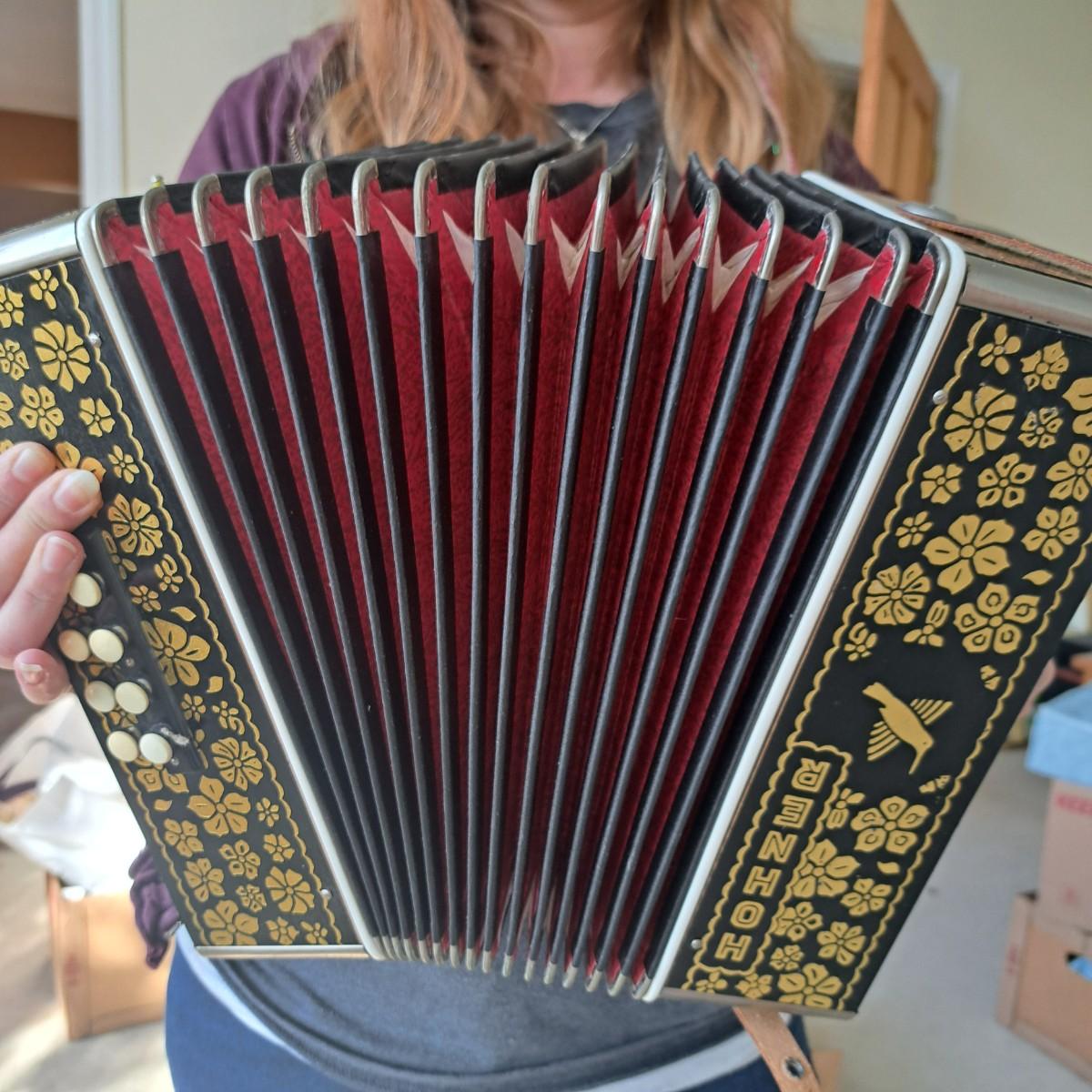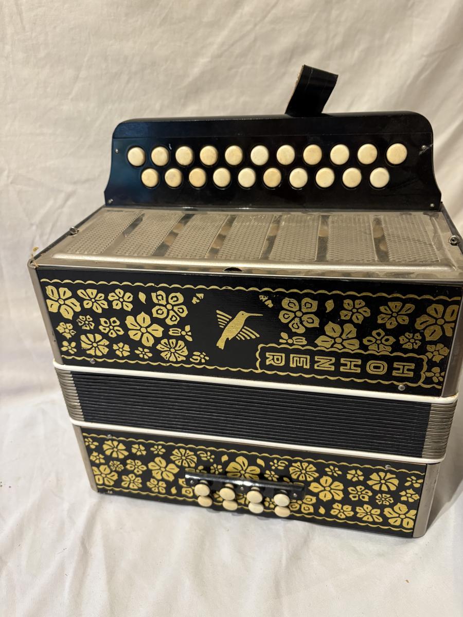 Gold and black button accordion is in excellent condition. 11” x 6” x 12”H.