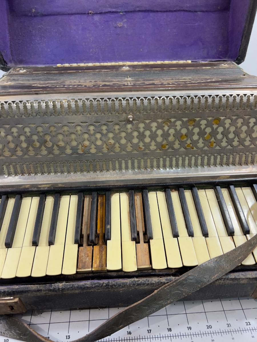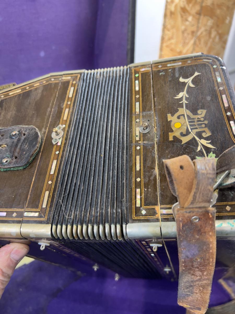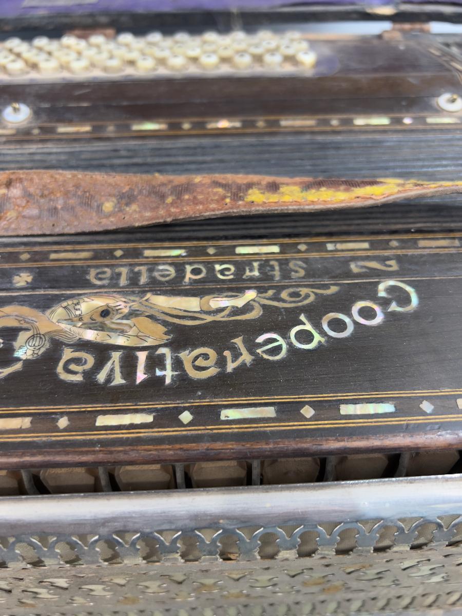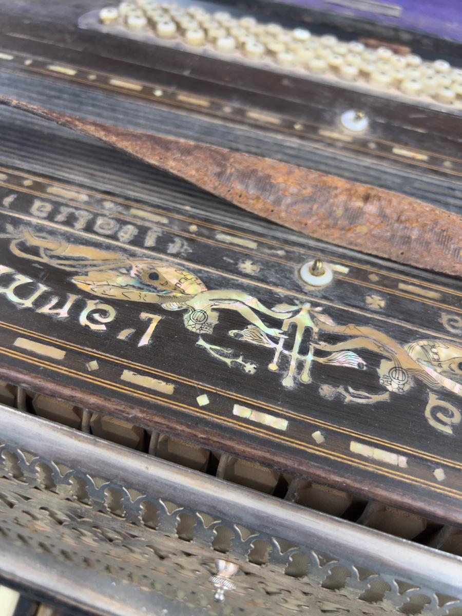 Needs Restoration. Still makes sound though. Has pretty mother of pearl inlay. OLD!