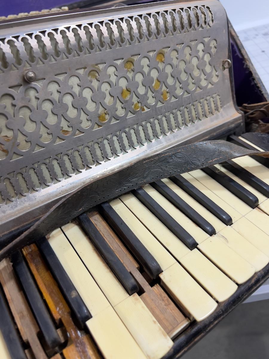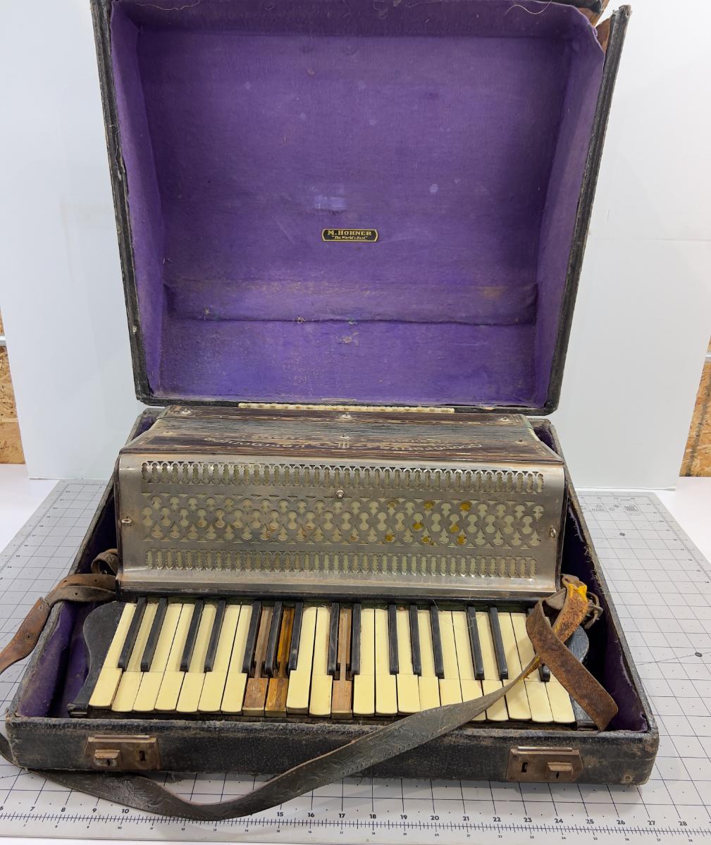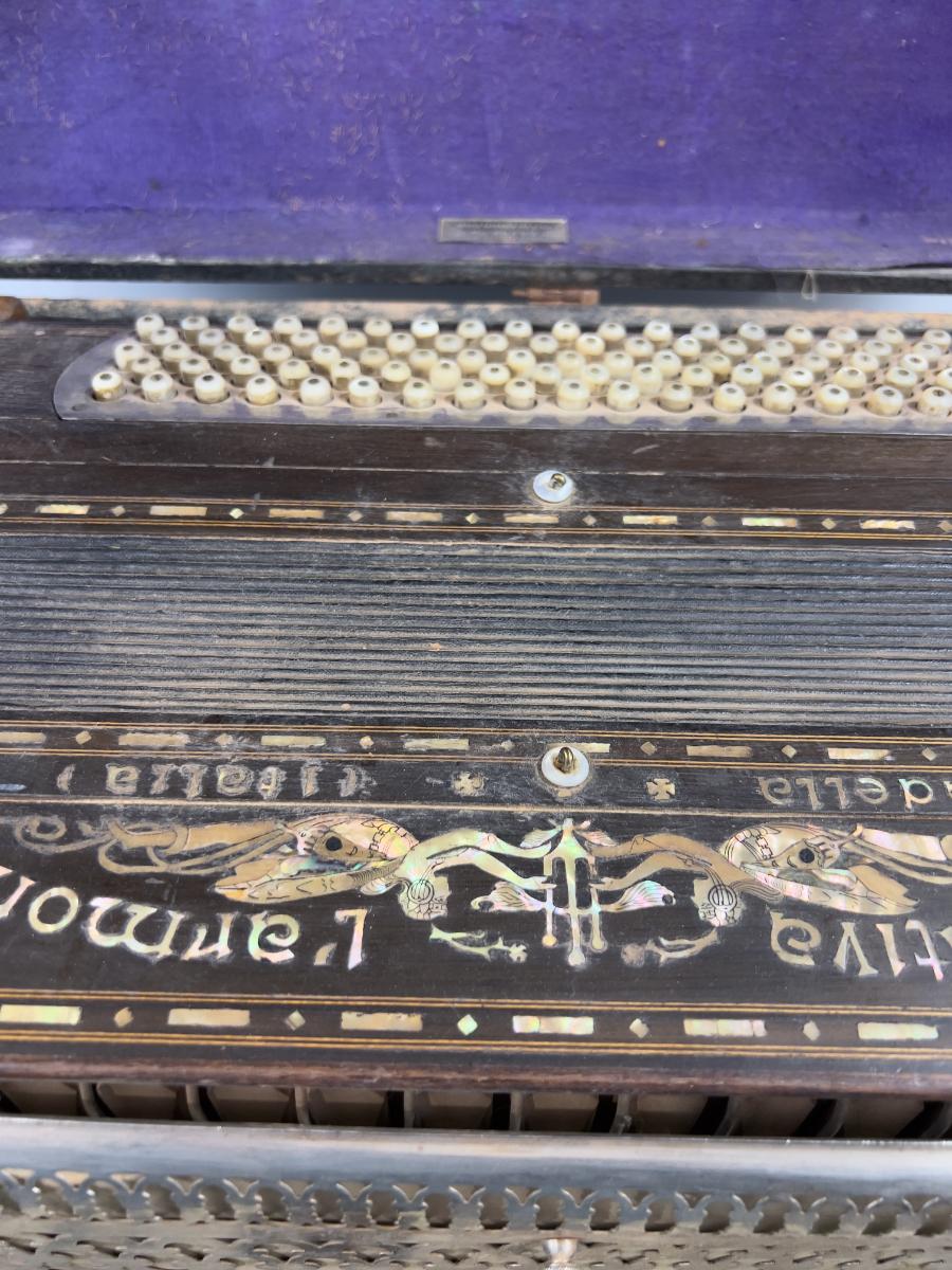 Needs Restoration. Still makes sound though. Has pretty mother of pearl inlay. OLD!