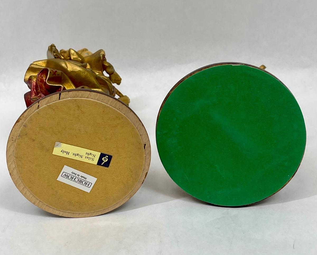 Both music boxes turn, but slowly, too slow and one angel has a bead of glue? on her wing, but there is no break. We are guessing factory error.