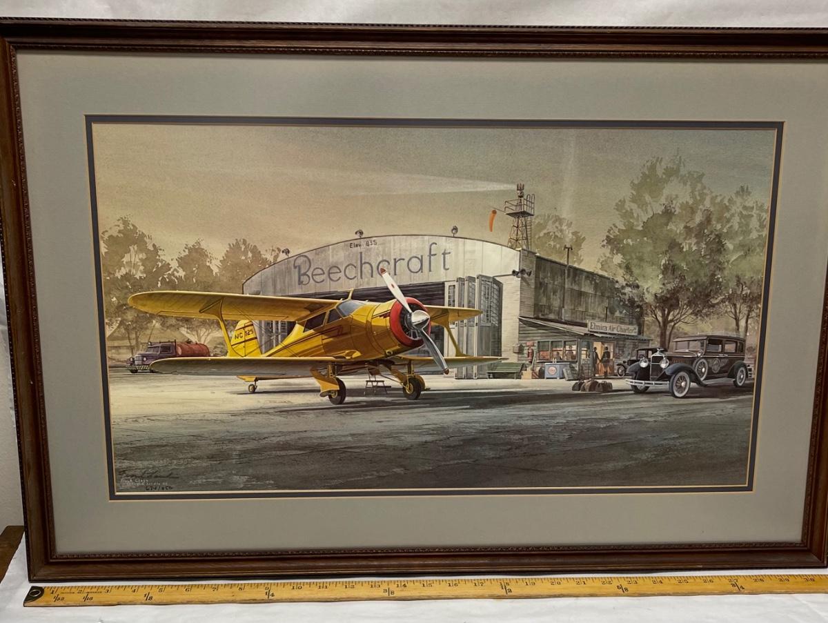 Lithograph shows a Beechcraft Model 17 Staggerwing Executive Air Transport - 1930's Airport in Elmira, NY. Released in 1982. Numbered 674 of 950. Great for anyone with an interest in early high-performance executive aircraft, especially Beechcraft Staggerwings. Approx. xx" x xx".