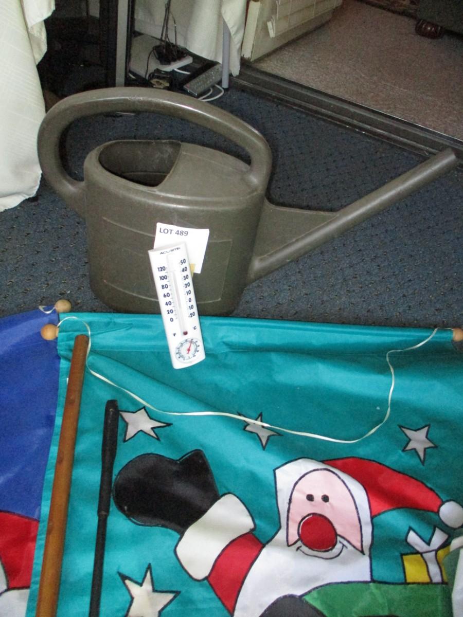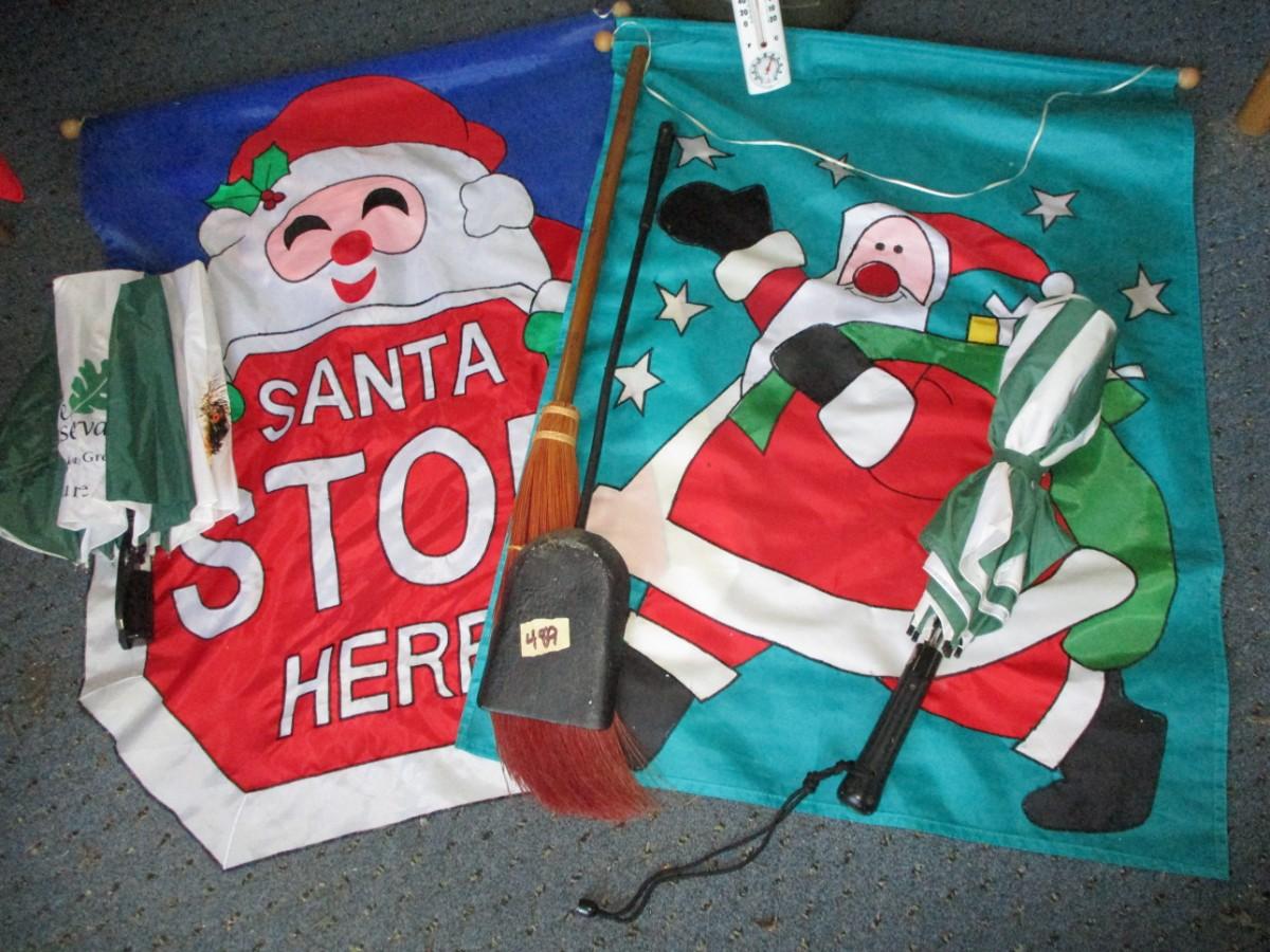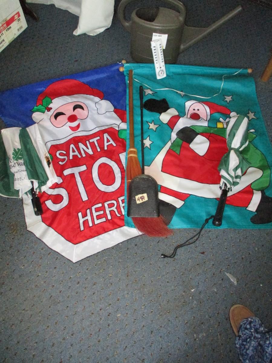 2 Umbrellas; 2 holiday flags; small ash shovel, 2 plastic water jugs