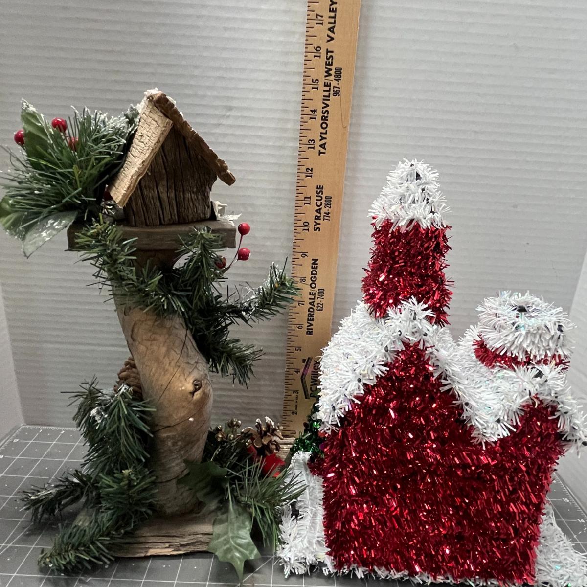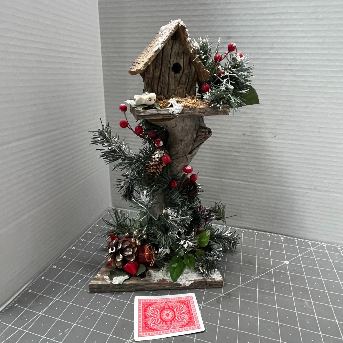 Rustic birdhouse with greenery + glitter house with snowman and tree.
