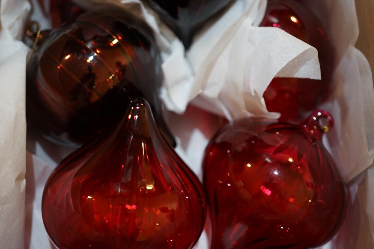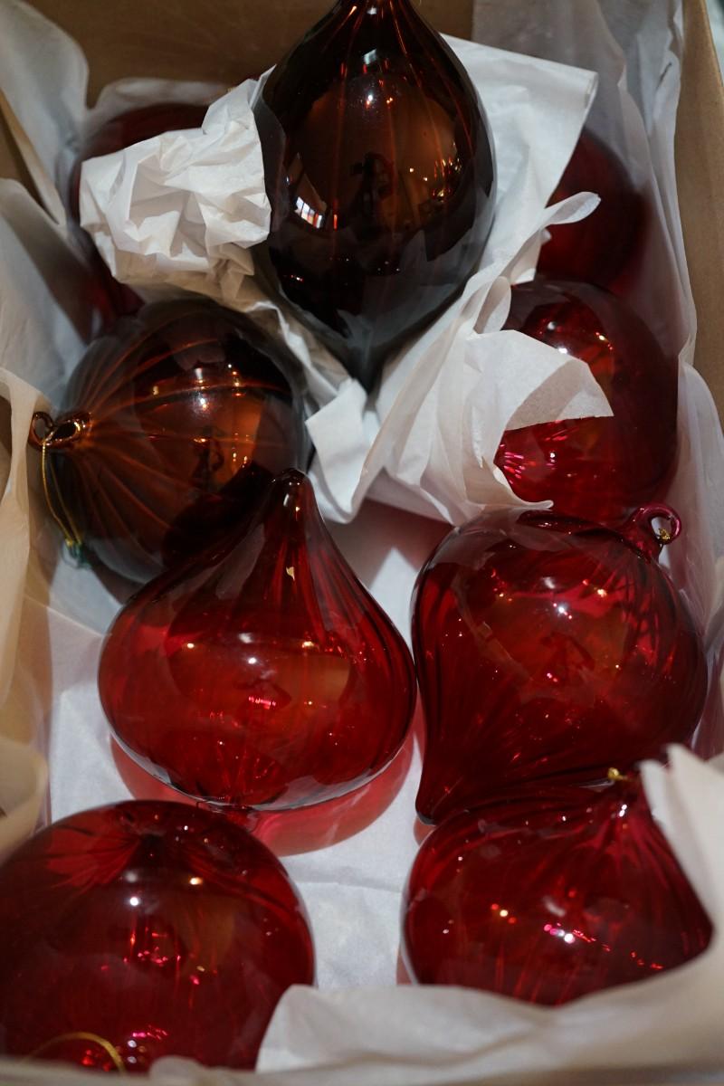 HOLIDAY BLOWN GLASS ORNAMENTS OF 4" IN PEAR FORM RED /DARK AMBER COLOR